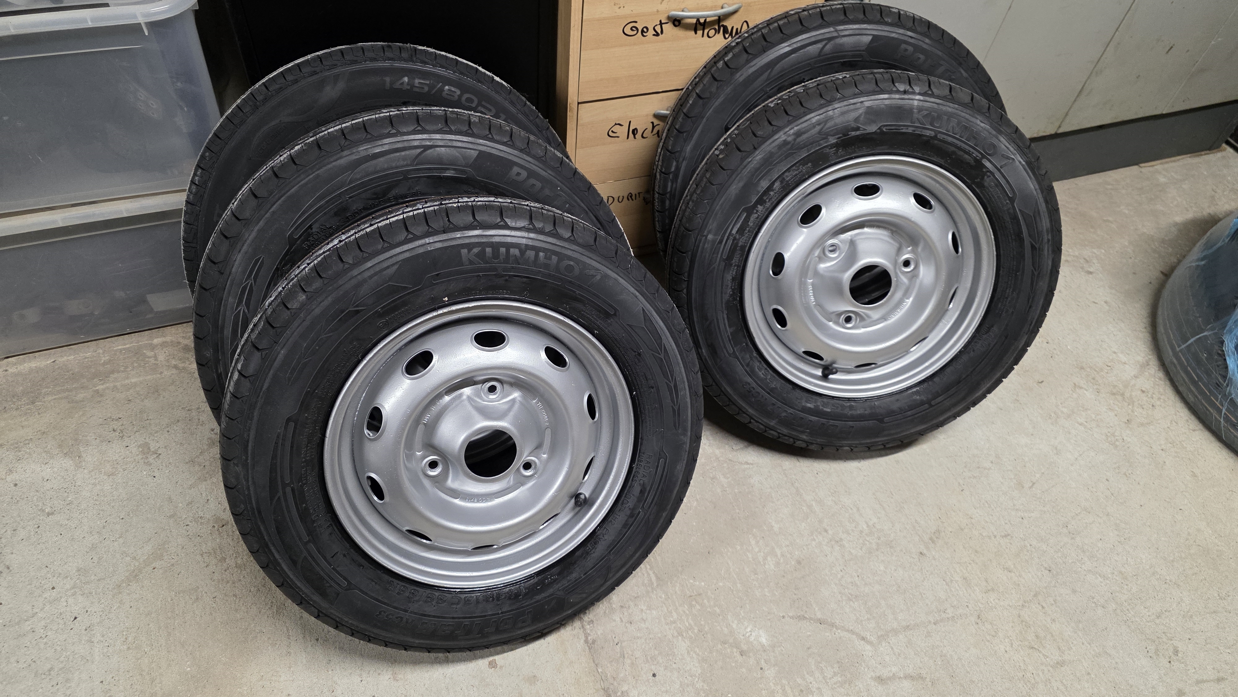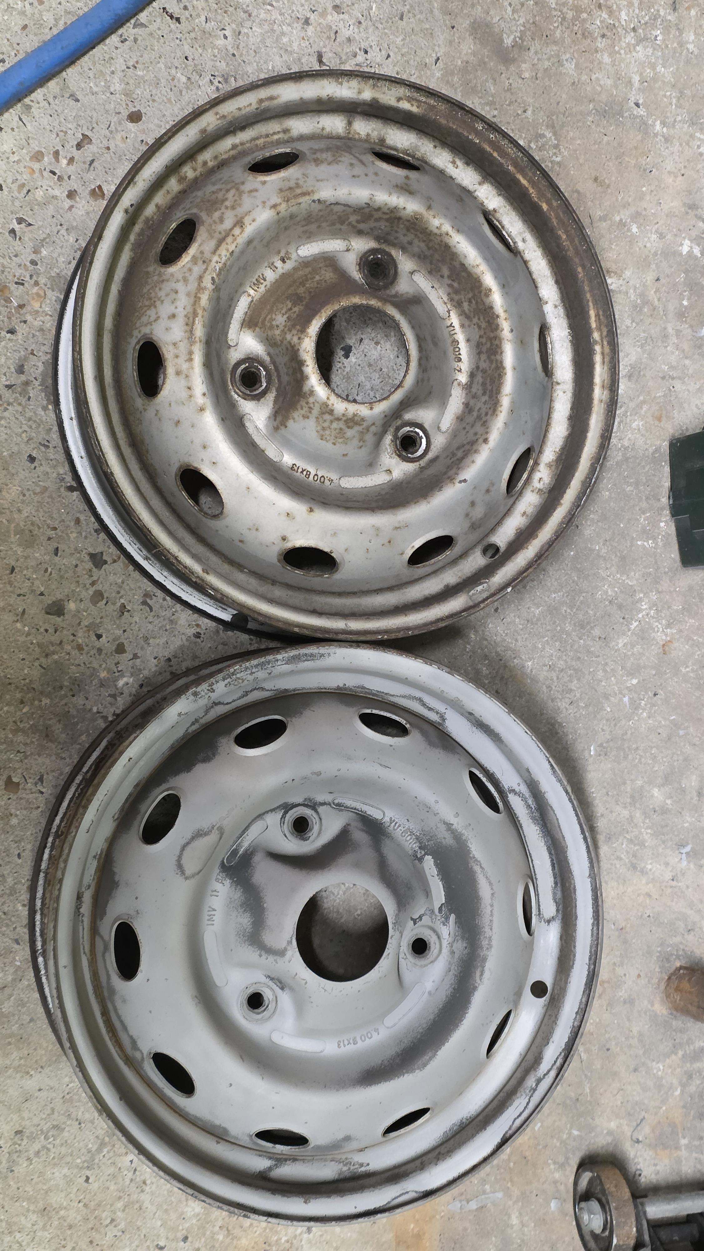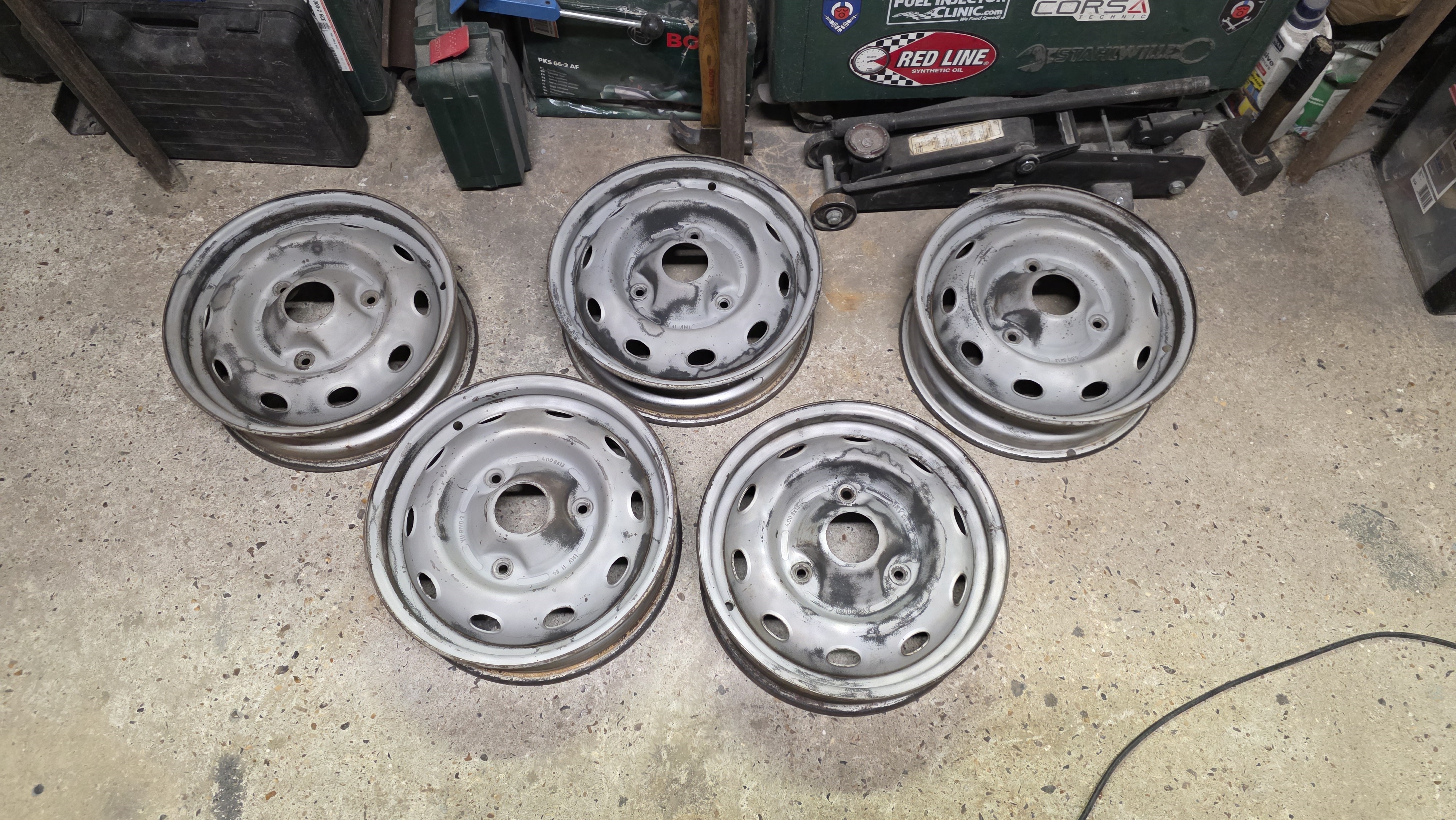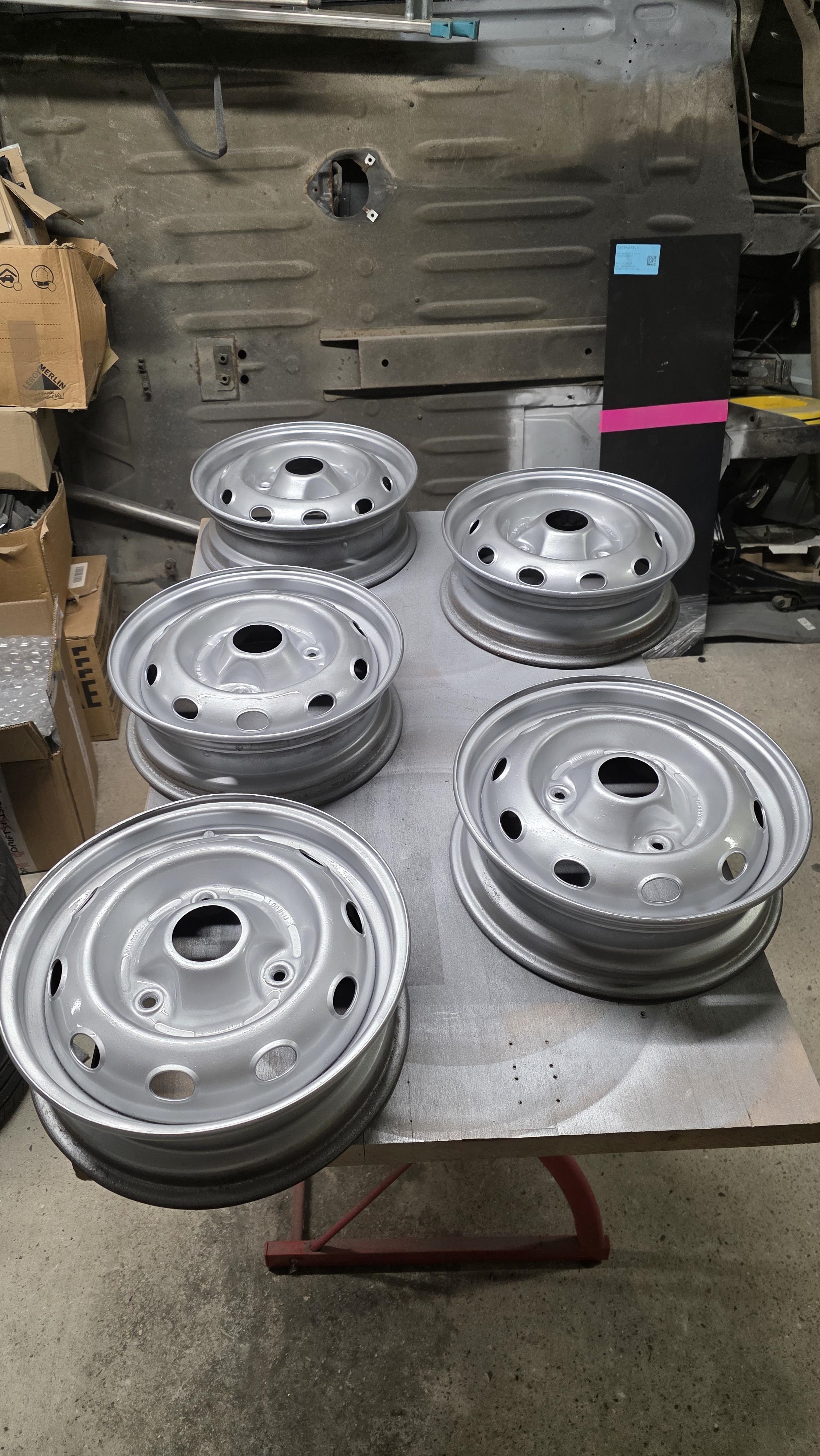 Tiens, et si on relançait le projet 4L ? La barquette est presque terminée, la 206 du fiston vient de passer les 4000 km depuis le changement de culasse, Flash, la 106 et la Mini n'ont pas de travaux majeurs prévus, donc on va se remettre dedans. Vu que j'ai l'équipement, je me suis lancé dans la rénovation des jantes tole qui trainaient dans un coin, j'avais acheté via un bon de réduction des pneus pour la 4L y a un an, mais jamais monté, maintenant que j'ai l'équipement ça me permettra de me débarrasser des vieux pneus et faire un gros tour a la déchetterie. On commence par sabler, on voit le avant après. Par contre je commence a voir les limites de mon compresseur, impossible de sabler longtemps car trop de condensation, malgrès le filtre séparateur, ça agglomère l'abrasif.  Les 5 jantes sont sablées (avec la roue de secours)  apret anti rouille  Deux couches de gris renault 605, deux couches de vernis  Et on monte tout ça, aucun soucis au montage, c'est méga simple. A l'équilibrage je voulais au début ne pas utiliser de plombs a frapper car les jantes étaient toutes neuves, mais le combo faible largeur et jantes toles qui ont vécu ont fait que l'équilibreuse me demandait des fois 80g a coller. Par contre en mettant des plombs a frapper sur les bords, aucun soucis, ça allait jusqu'a 30g max, donc ben j'ai mis des plombs a frapper. Ca fait chier sur des jantes refaites a neuf mais pas le choix  Petit passage hier à la déchetterie, le mec a pas trop rigolé quand il m'a vu arriver avec le break a ras bord avec des pneus  j'ai du argumenter pour qu'il me laisse déposer tout ça