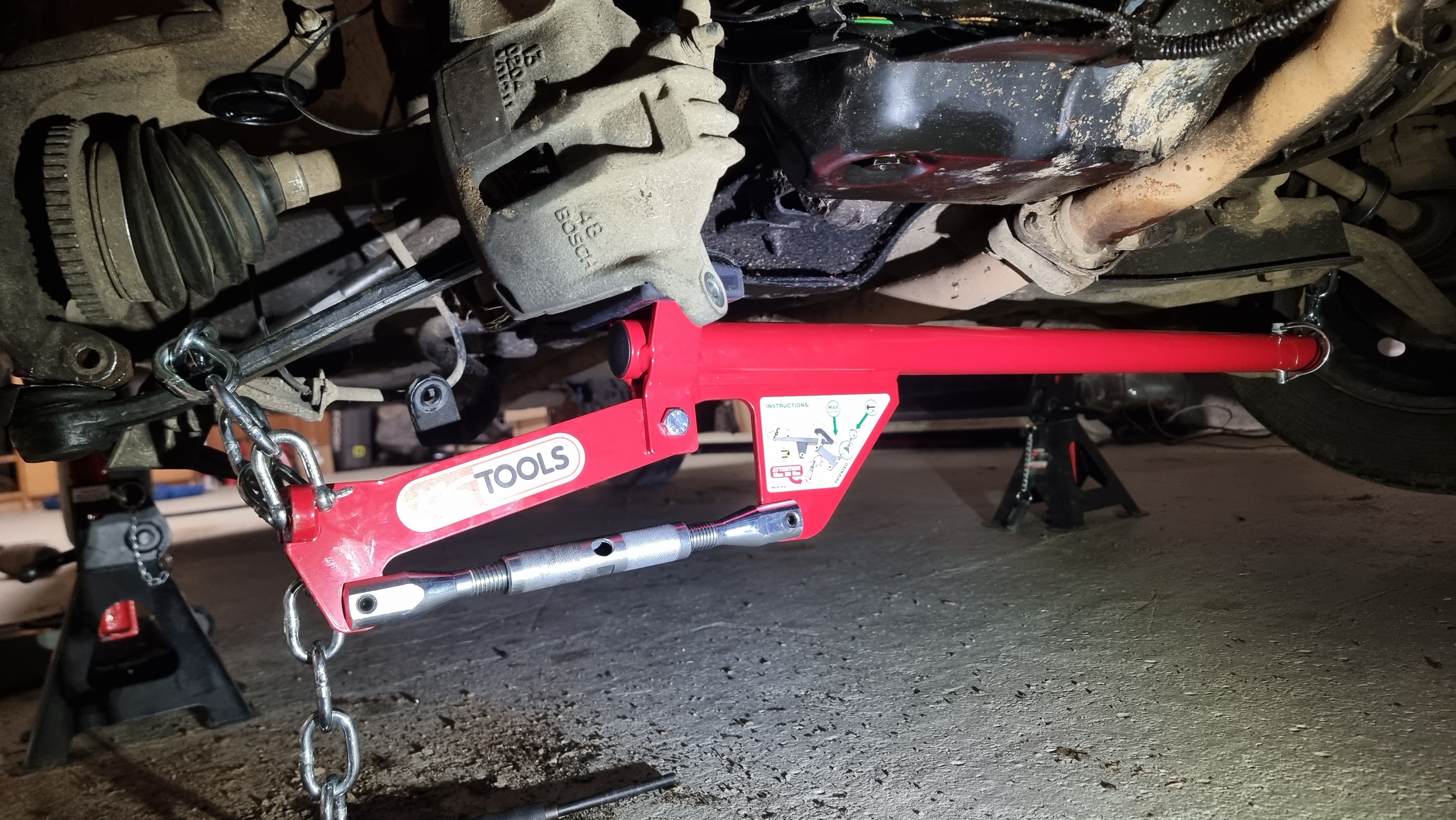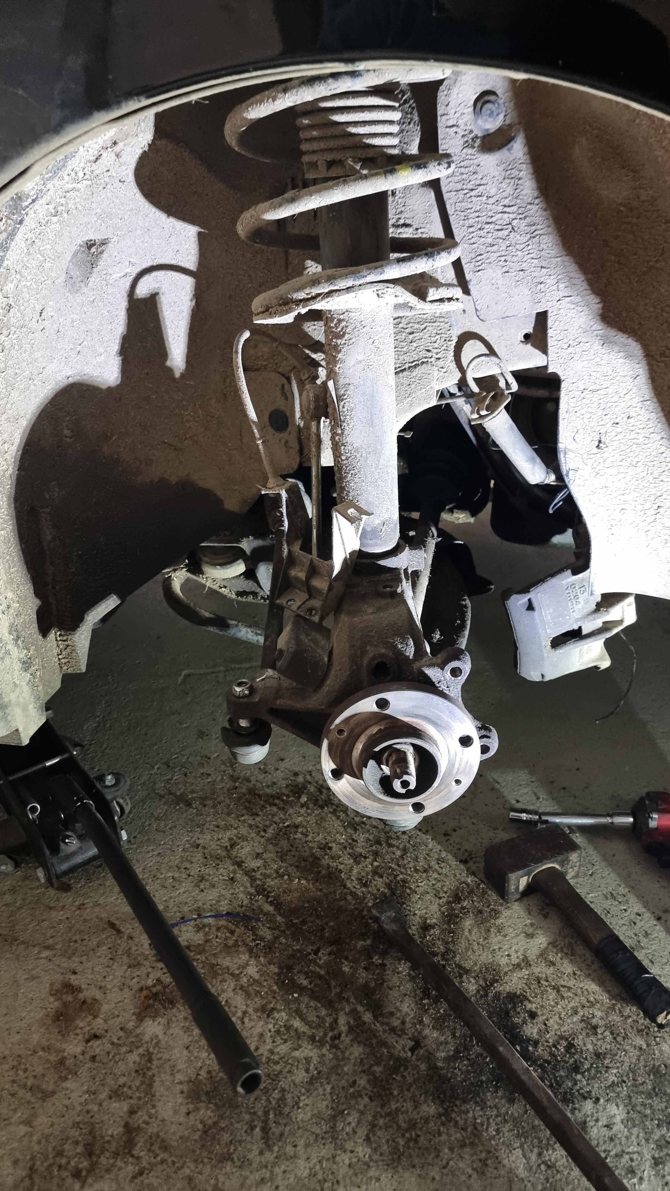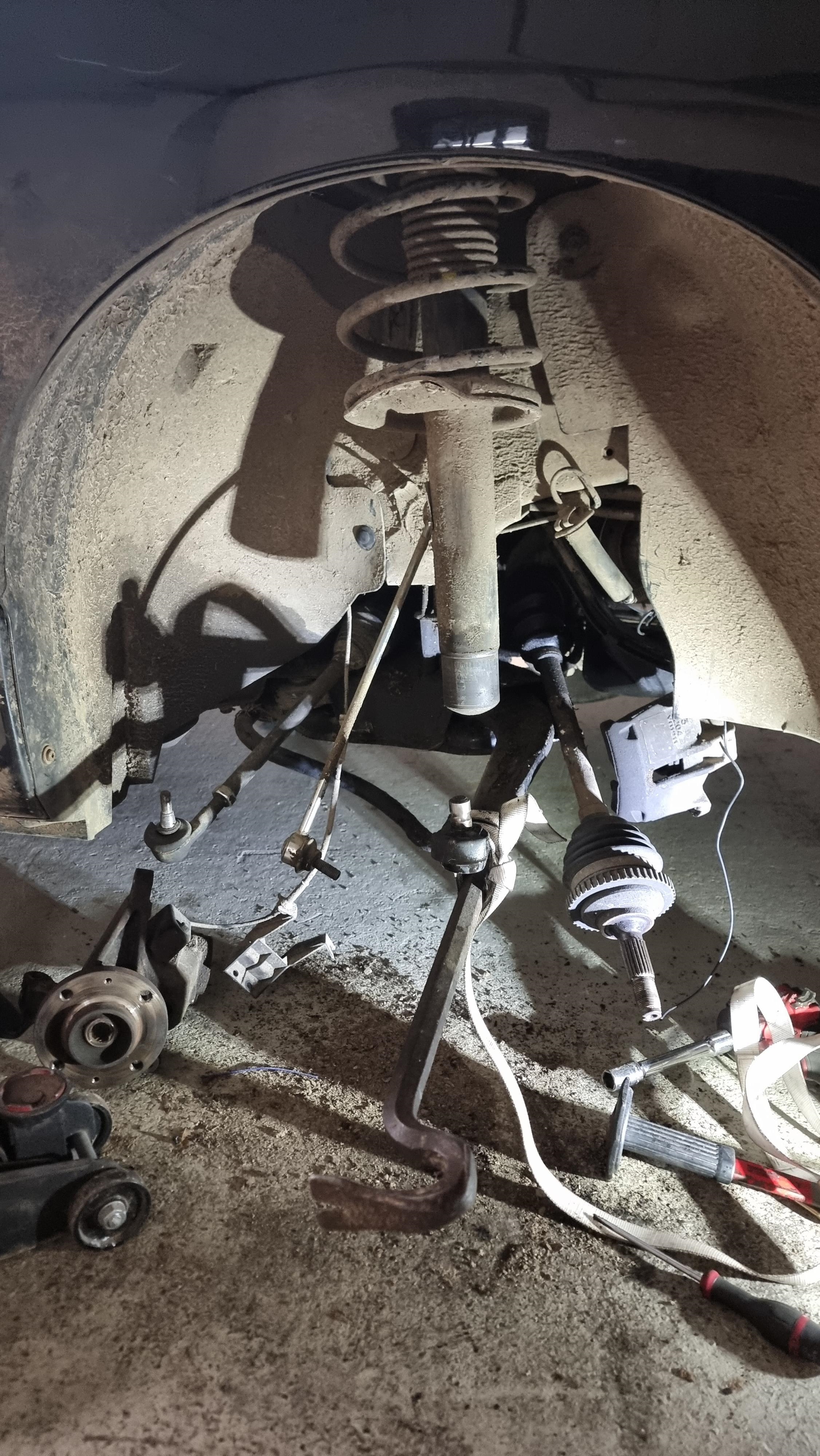 On réinstalle l'amortisseur, on réinstalle le tout, sauf qu'il faut remettre la rotule inférieure, avec l'amortisseur en place, et c'est juste impossible, on a essayé deux heures avec Noé, avec une barre de torsion de la 4L, tout mon poids dessus, Noé qui essaye de remettre la rotule sur le porte moyeux. Impossible et ça commencait a devenir sketchy, si la barre de torsion glissait, on risquait d'y laisser des dents ou pire