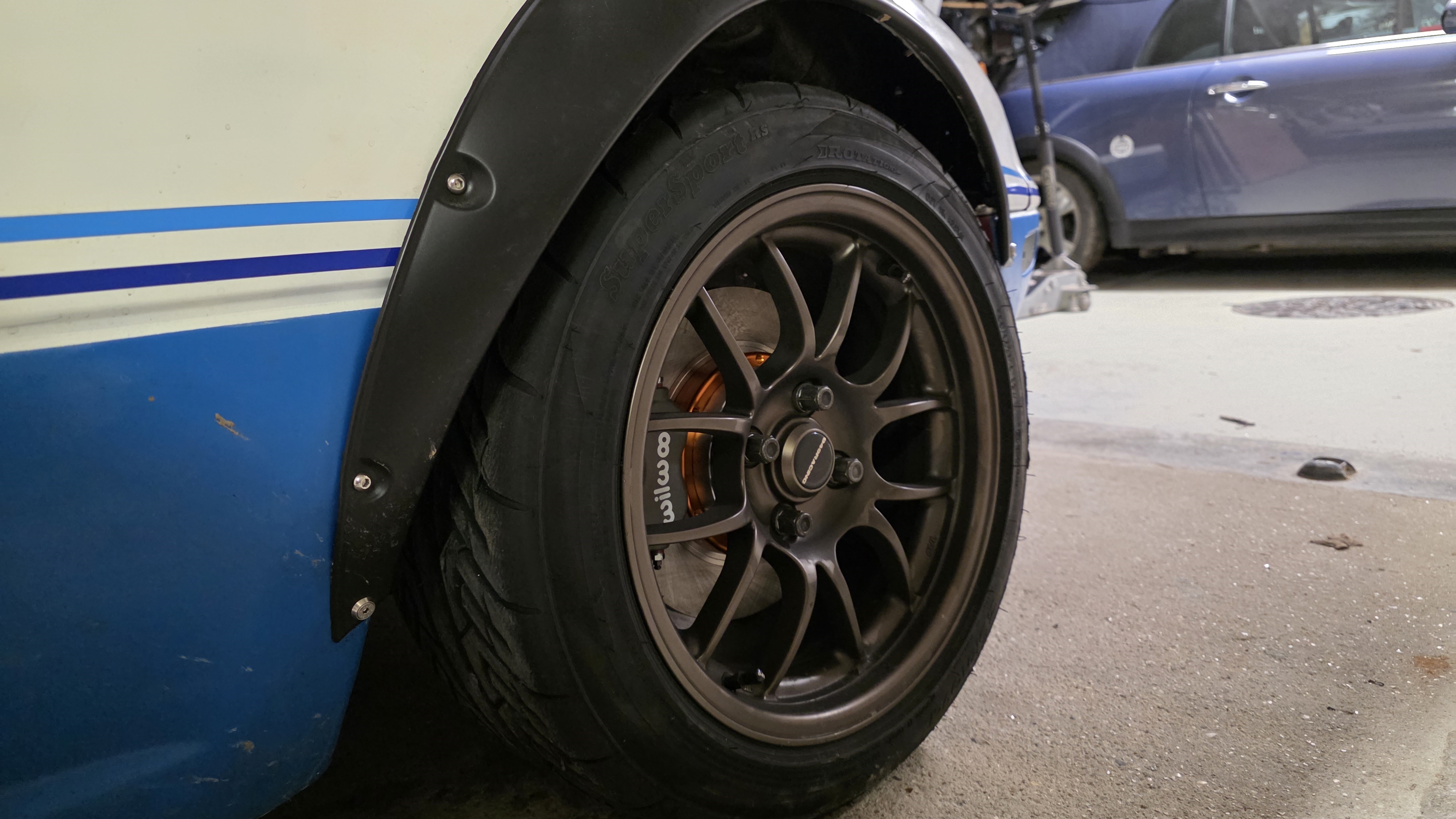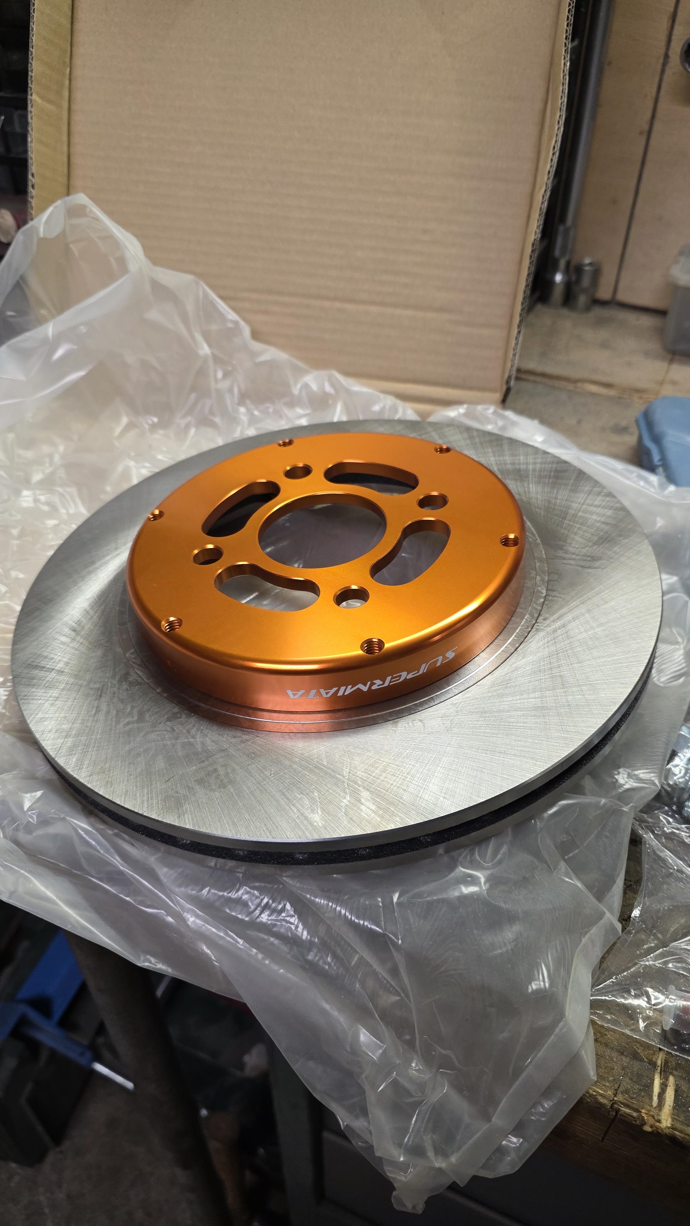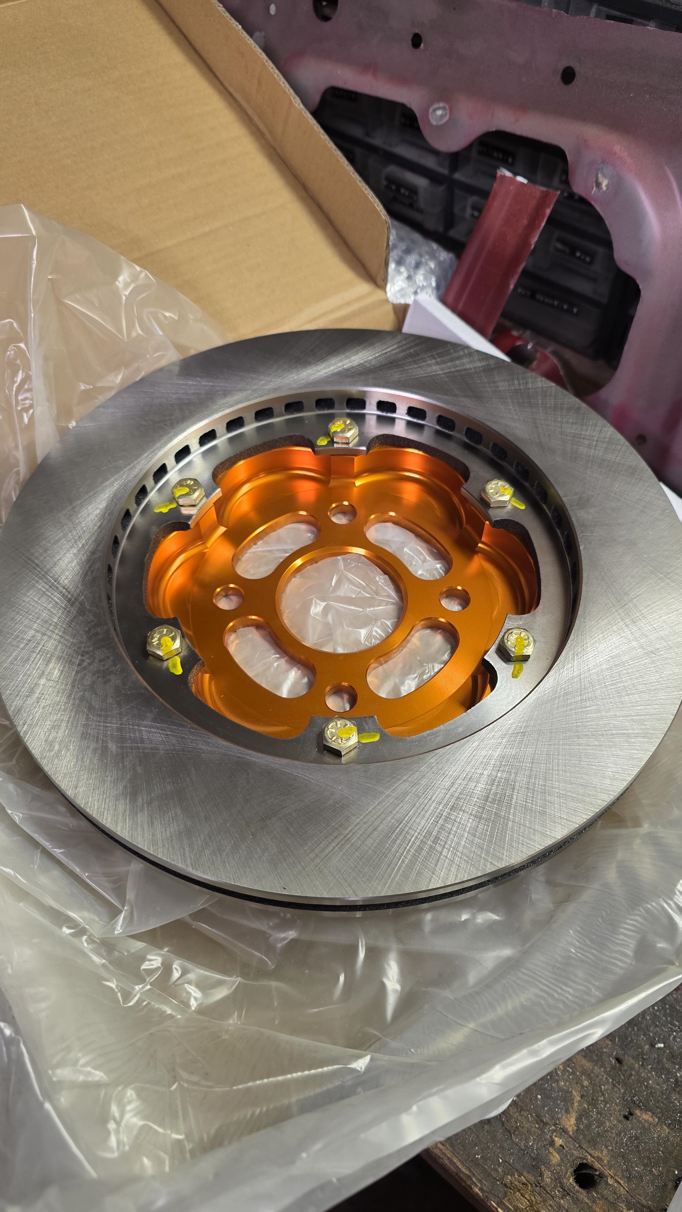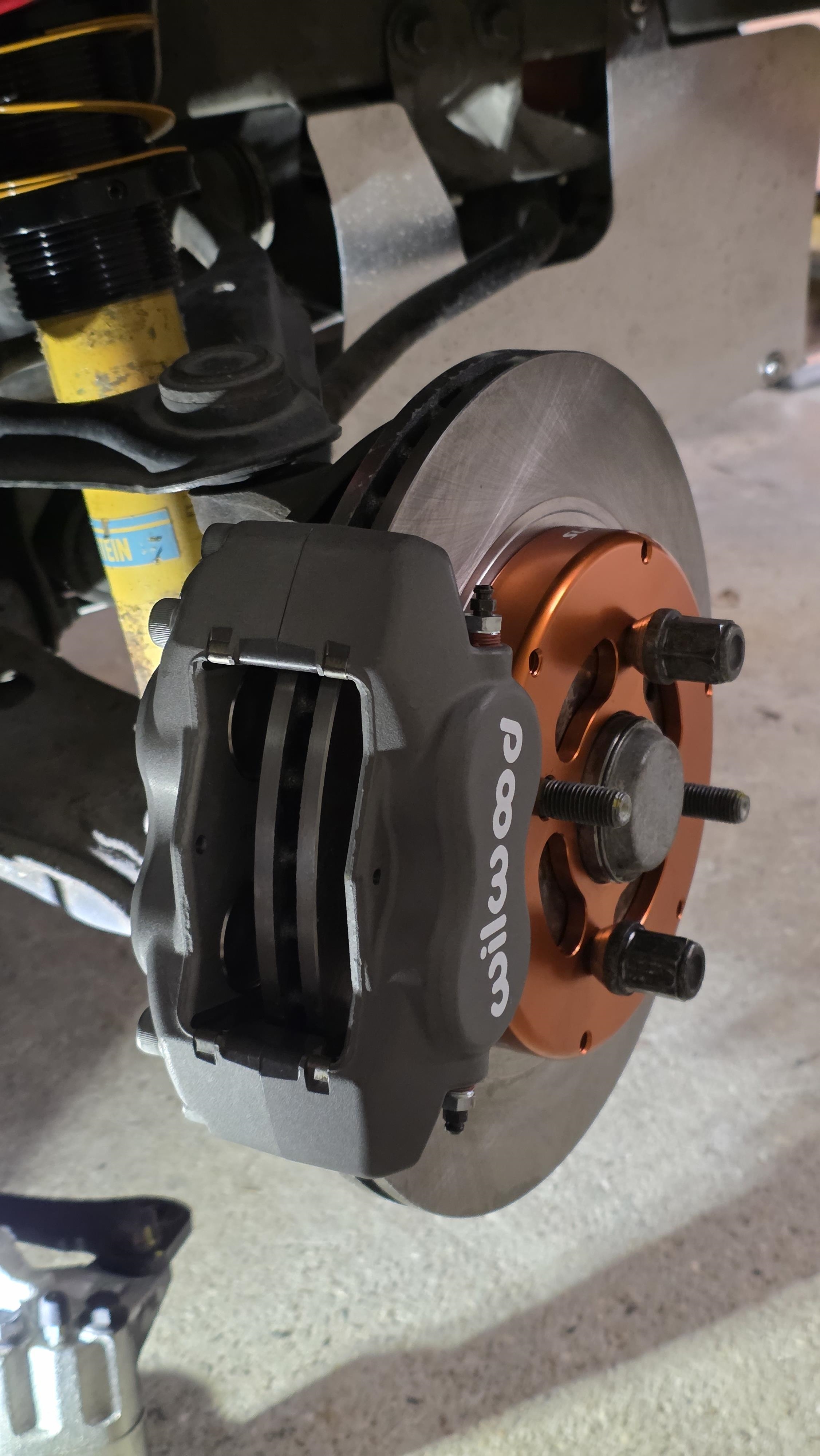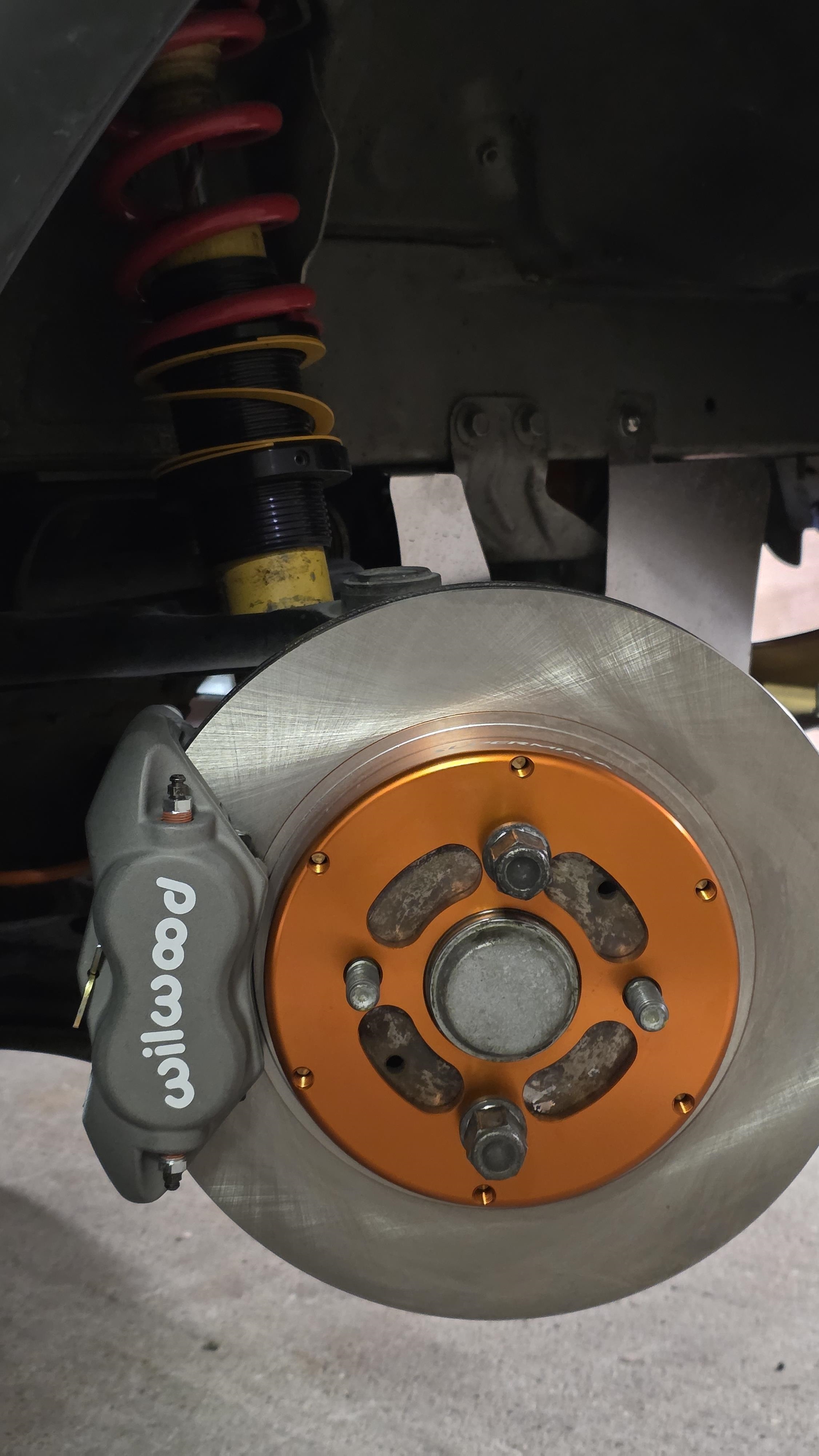 Installation du kit Wilwood sur la barquette. On commence par installer les bols alu sur les pistes, serrage en étoile au couple dans un filetage alu, faut pas trop se rater   Puis installation du support avec les fixations "boxmount" (c'est la pièce grise qui permet de serrer des deux côtés l'étrier)  Puis on installe le disque et l'étrier  Et on met les plaquettes, on serre au couple et on installe les durites.  Super méga facile a installer, j'ai un peu galéré avec la purge. J'ai un système de mise sous pression mais le bouchon de la mx5 est spécifique et donc je dois utiliser un adaptateur avec une chaîne et ça a fuit et giclé du ldf partout.... J'ai finalement fait a l'ancienne avec mon fils qui pompe, j'ai mis du RBF660 en lieu et place du 600 que j'avais avant. On réinstalle les roues   On va pas se mentir, c'est beau. Puis le moment fatidique, la pesée je remet coffre et capot sur le voiture, je fais le plein pour être sûr de la pesée. 827kg avec le plein. 40 L de sp98 pesant 30kg, cela donne 797kg a vide. \o/ c'est bon, je peux arrêter de faire des trous.