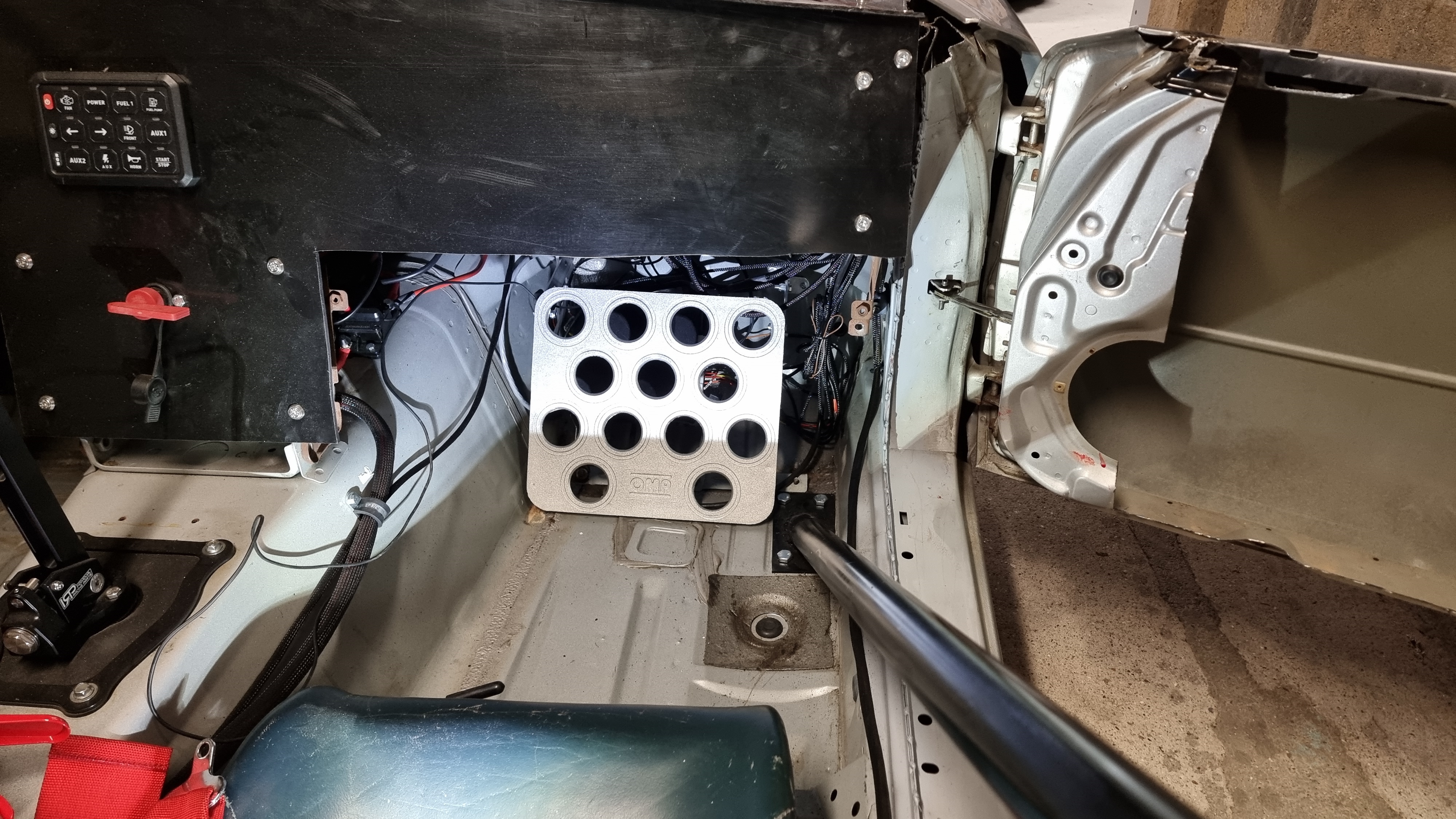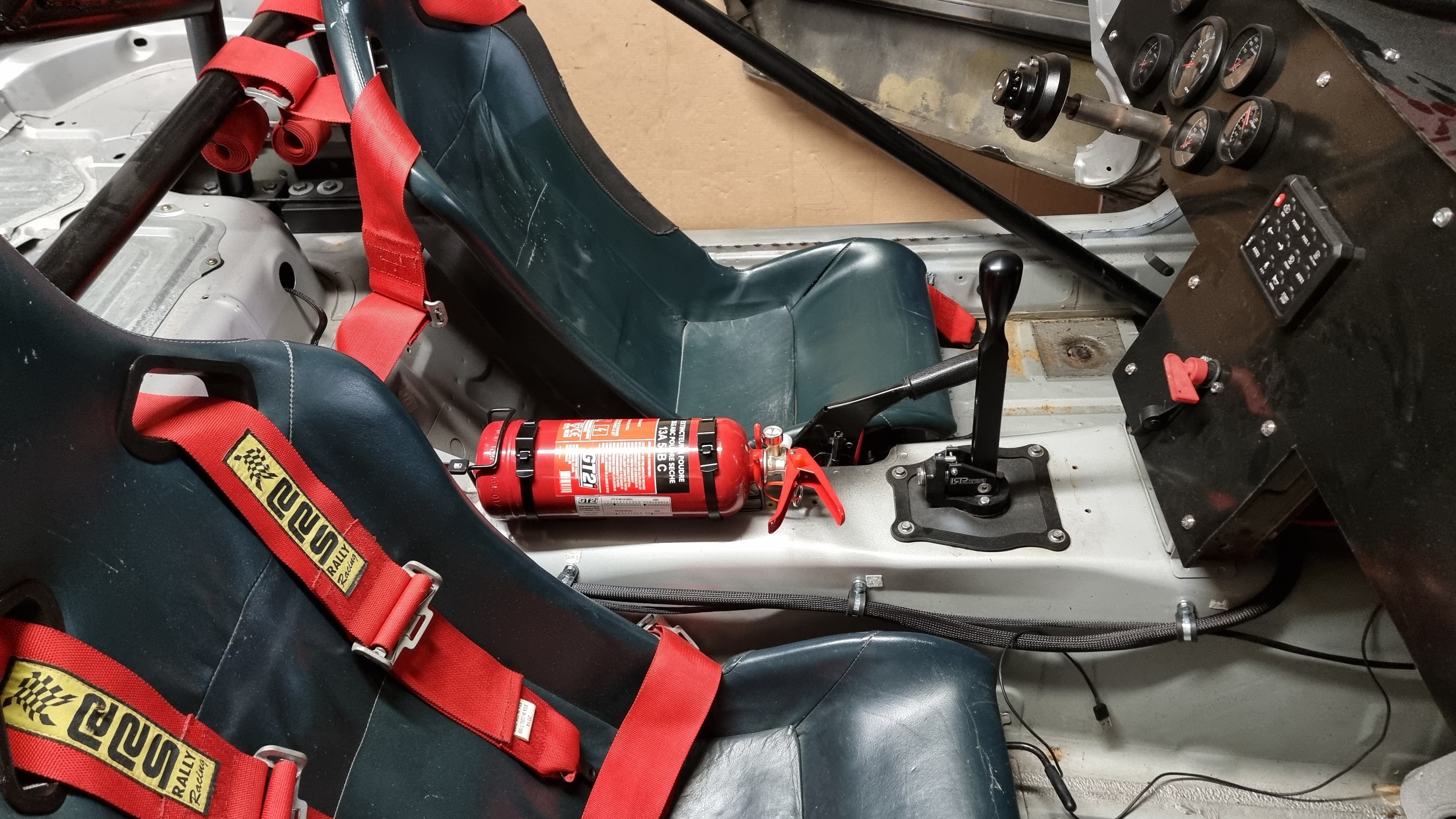 J'ai profité de la commande chez GPR pour prendre aussi un extincteur, bon, je vais avoir des ITB, je me suis dit qu'avoir un extincteur dans la bagnole serait pas non plus totalement con, il est fixé au milieu et ne gène absolument pas