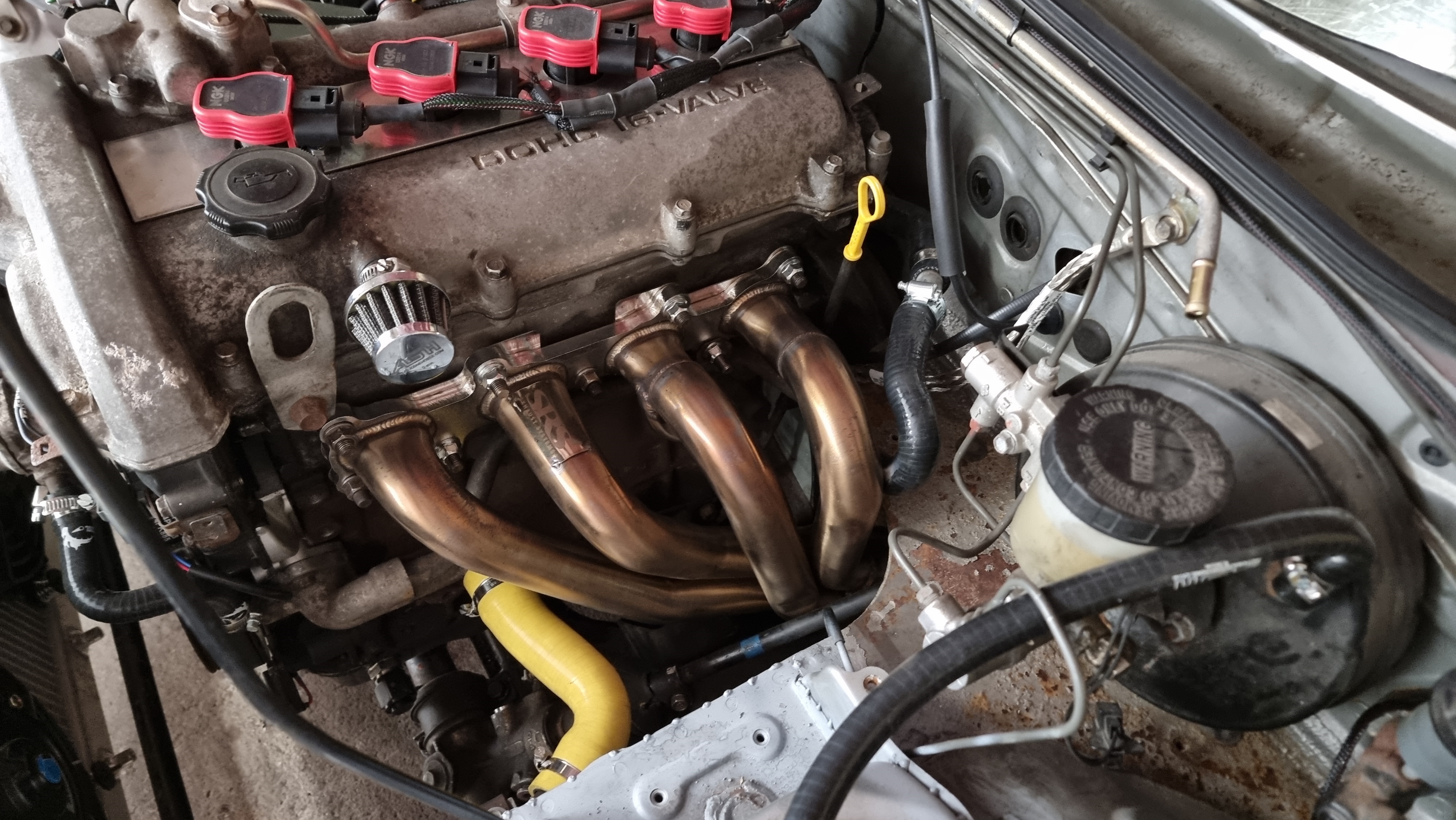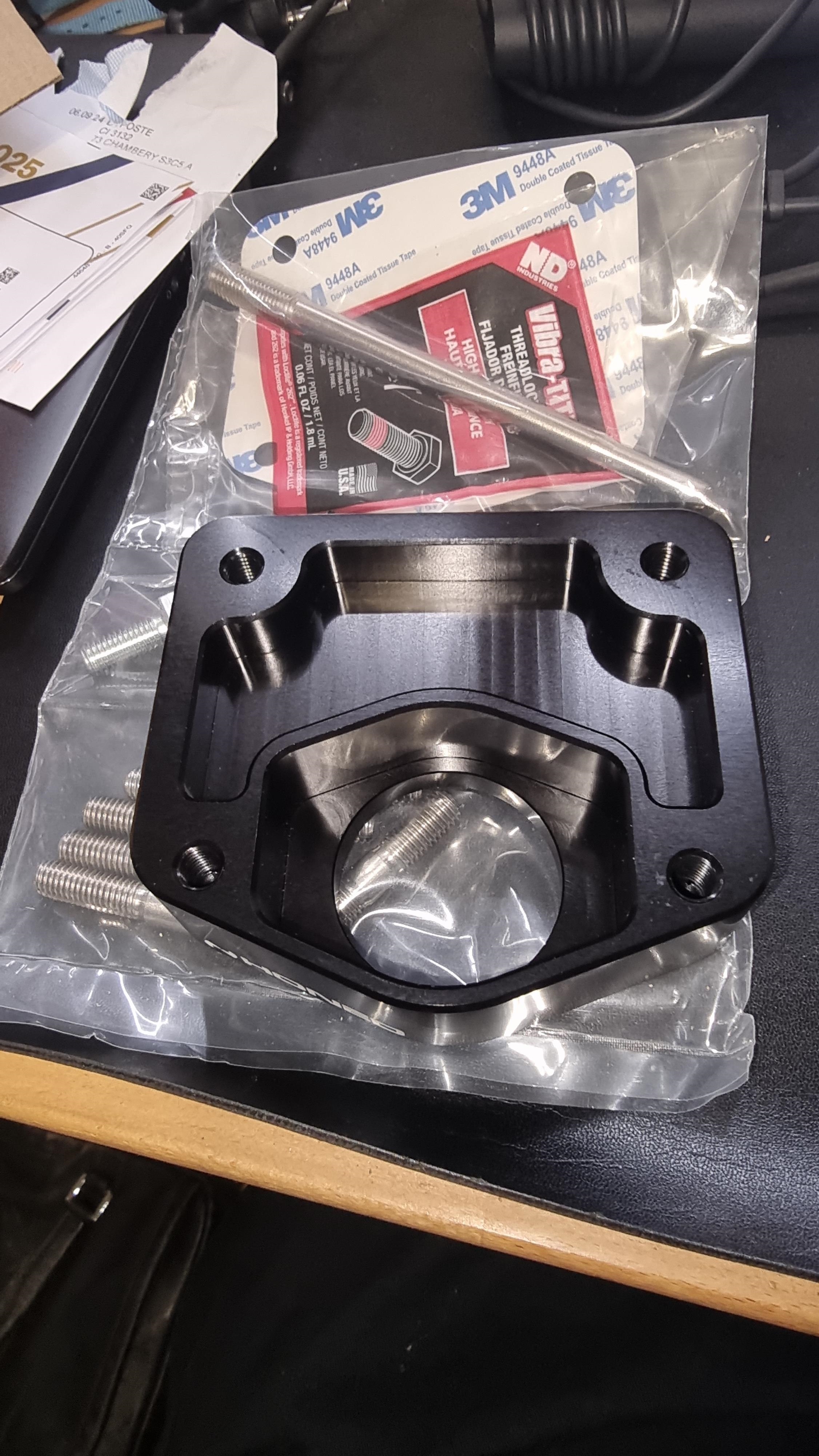 Bon, c'était bien le calorstat bloqué que j'avais, il était pourtant neuf de quand j'ai remonté le moteur. J'espère ne pas avoir abimé le jdc les deux fois ou je l'ai démarrée et que du coup elle a un peu chauffé (je pense que j'ai du monter jusqu'a 100-105). J'ai supprimé le calorstat, refait une purge et c'est parfait, la voiture chauffe plus doucement, mais ne monte pas au dela des 80 comme avant. J'ai pu faire un peu de carto a l'arret pour avoir un ralenti stable et a 14.7, bon ralenti a 1900-2000 trs min, mais sans valve je suis obligé de laisser relativement élevé. En rentrant la voiture, j'ai vu un peu de fumée avec une odeur de cramé et mauvaise surprise  Ca n'aurait pas tenu la première session au excuyers.... C'est de ma faute, c'est un bricolage que j'ai fait pour bypass le radiateur de chauffage que je n'ai bien sur plus. Je règlerai ça demain, la faut que je laisse refroidir car c'est trop chaud. D'ailleurs le collecteur prends une couleur bronze sympa  De toute façon demain je dois démonter pas mal de trucs dans ce coin là, tout ca va virer en partie  J'ai reçu le kit de Honed development (meme pas 5 jours pour etre livré de l'australie), j'attaque l'installation de tout ça demain