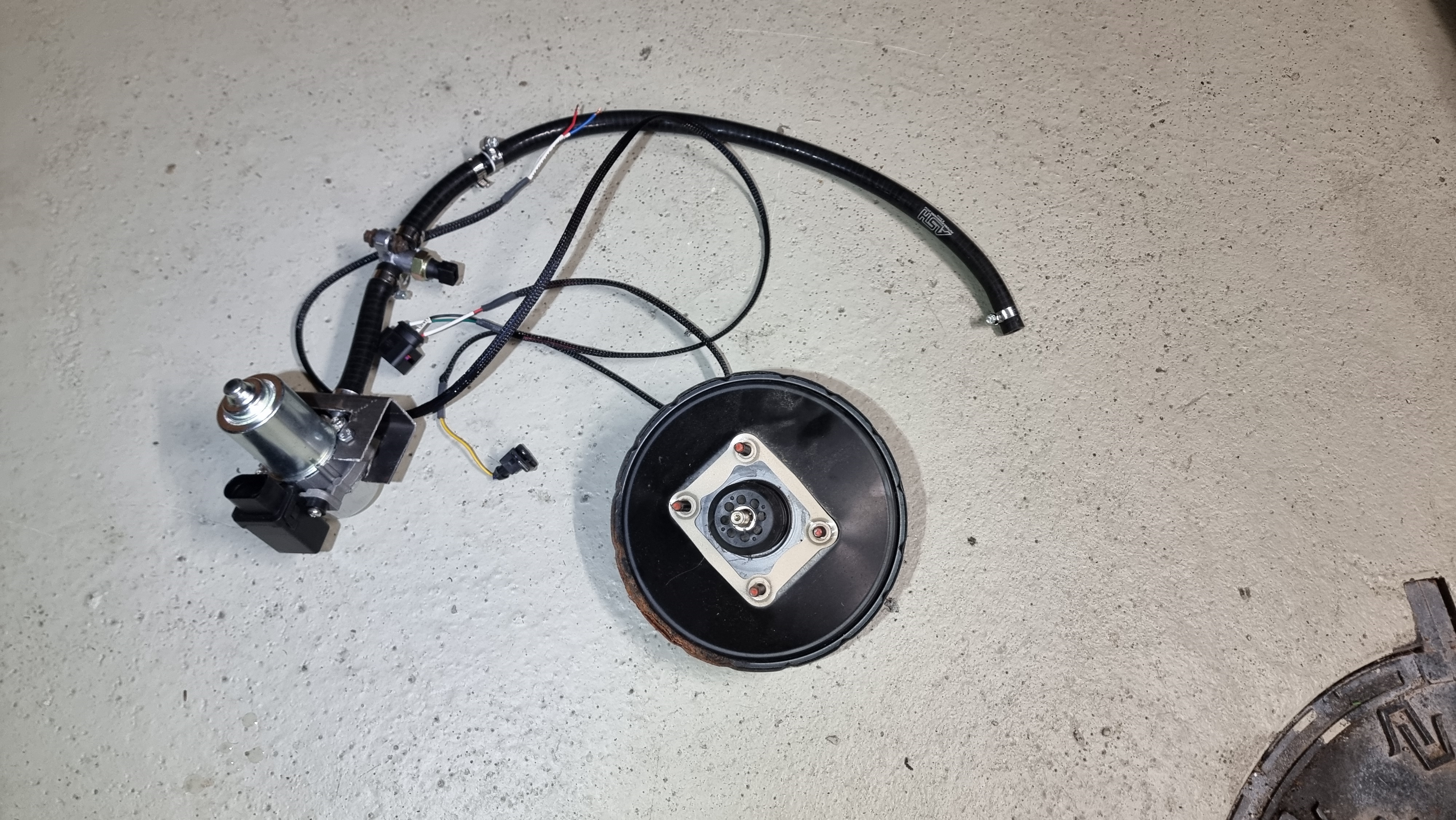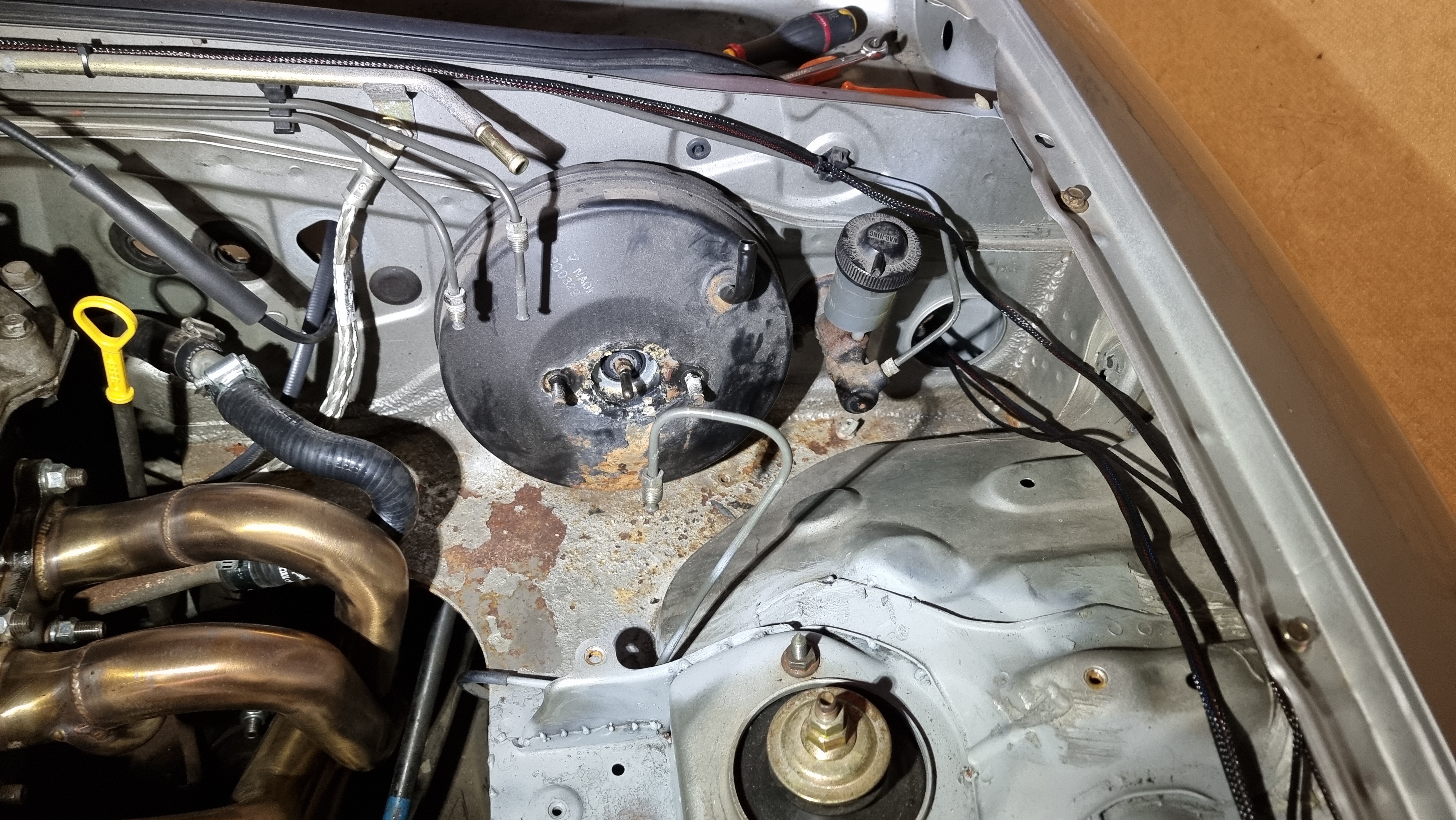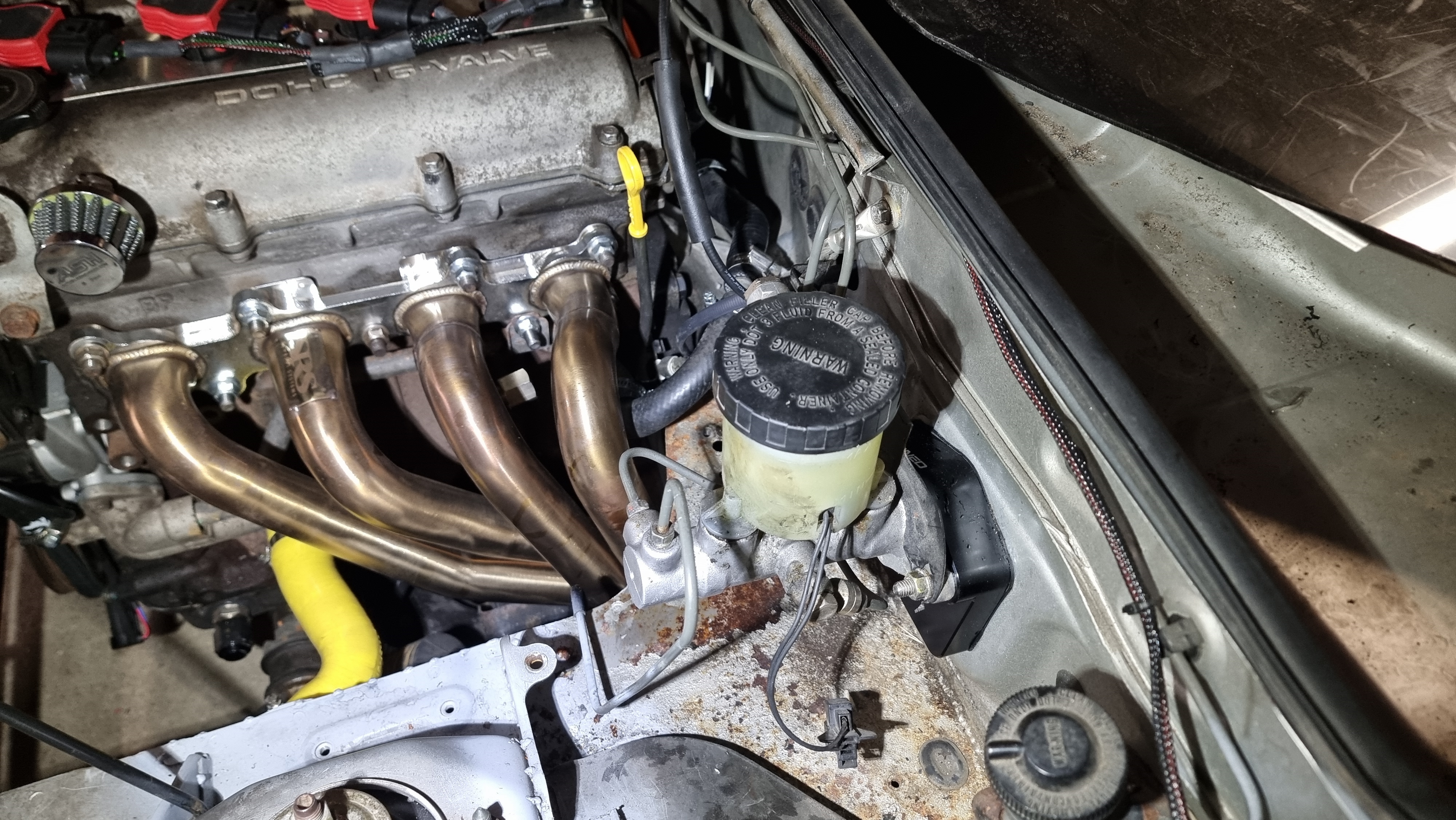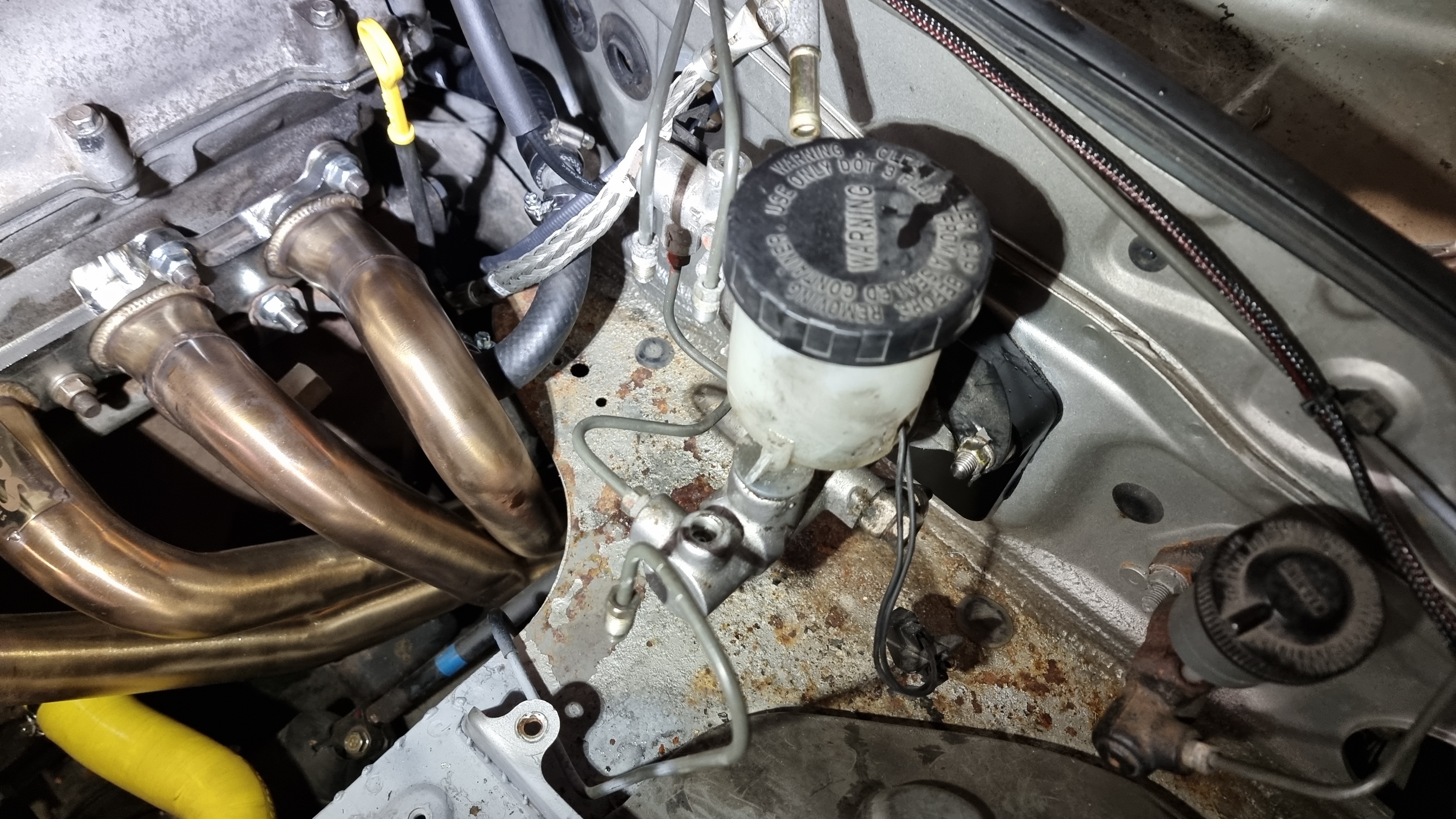 Aujourd'hui c'était donc installation du booster delete de chez Honed. Première étape, démontage du maitre cylindre   Puis on démonte le booster (en ayant déconnecté la pédale au préalable bien sur)   Vu que j'ai récupéré de la place, je me suis attaqué a la réparation de la durite de bypass du radiateur de chauffage qui a chauffé, je suis pas passé loin  Dans mon tas de pièce, j'ai trouvé une durite d'origine (toujours garder les vieilles durites), que j'ai recoupé pour faire un coude a 180 beaucoup plus court  Ca fit parfaitement et j'ai gagné un peu de distance par rapport au collecteur  Par conséquence, a moi la 3ème purge de LDR en l'espace de 2 jours.... bon après j'ai l'outil qui va bien ça se fait facilement.  Puis je repasse au brake booster, le kit est bien fait, il faut repercer la pédale pour changer l'angle de poussée de la tige, et bien le gabarit de perçage est fourni avec   La nouvelle tige est founie également, il faut cependant récupérer la fixation sur le booster d'origine  J'installe le support  Et je remet le maitre cylindre, comme on peut le constater, il est reculé de 5cm, je vais donc devoir tordre les durites rigides.  Bon, c'est un peu la galère pour remettre les durites, j'y aoi passé pas mal de temps, mais ça passe  Voilà, tout ça a dégagé  Ca rends bien, purge des freins, et franchement la sensation a la pédale est bien ferme, oui faut appuyer, mais ça semble consistant. Je verrai sur piste.