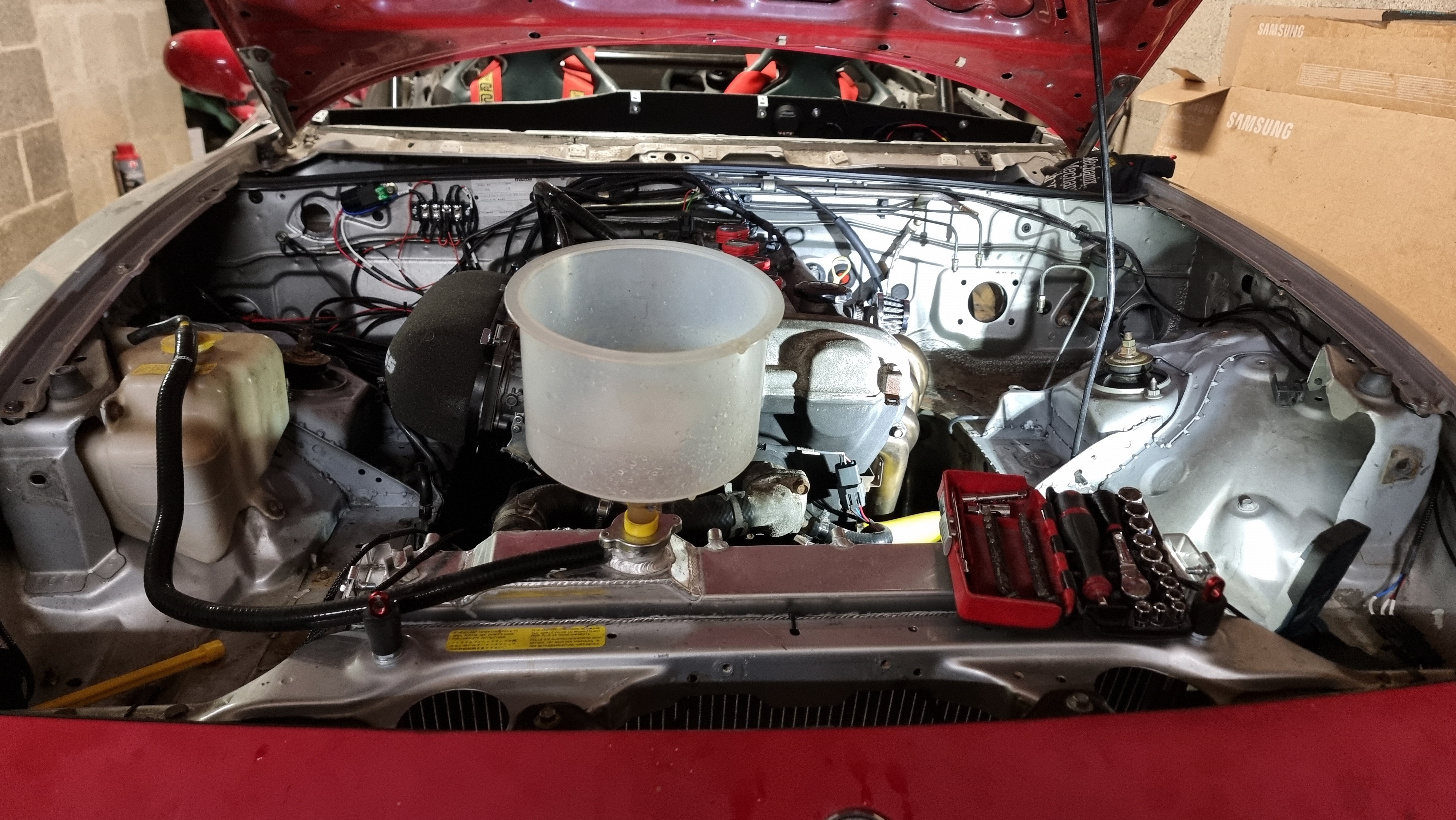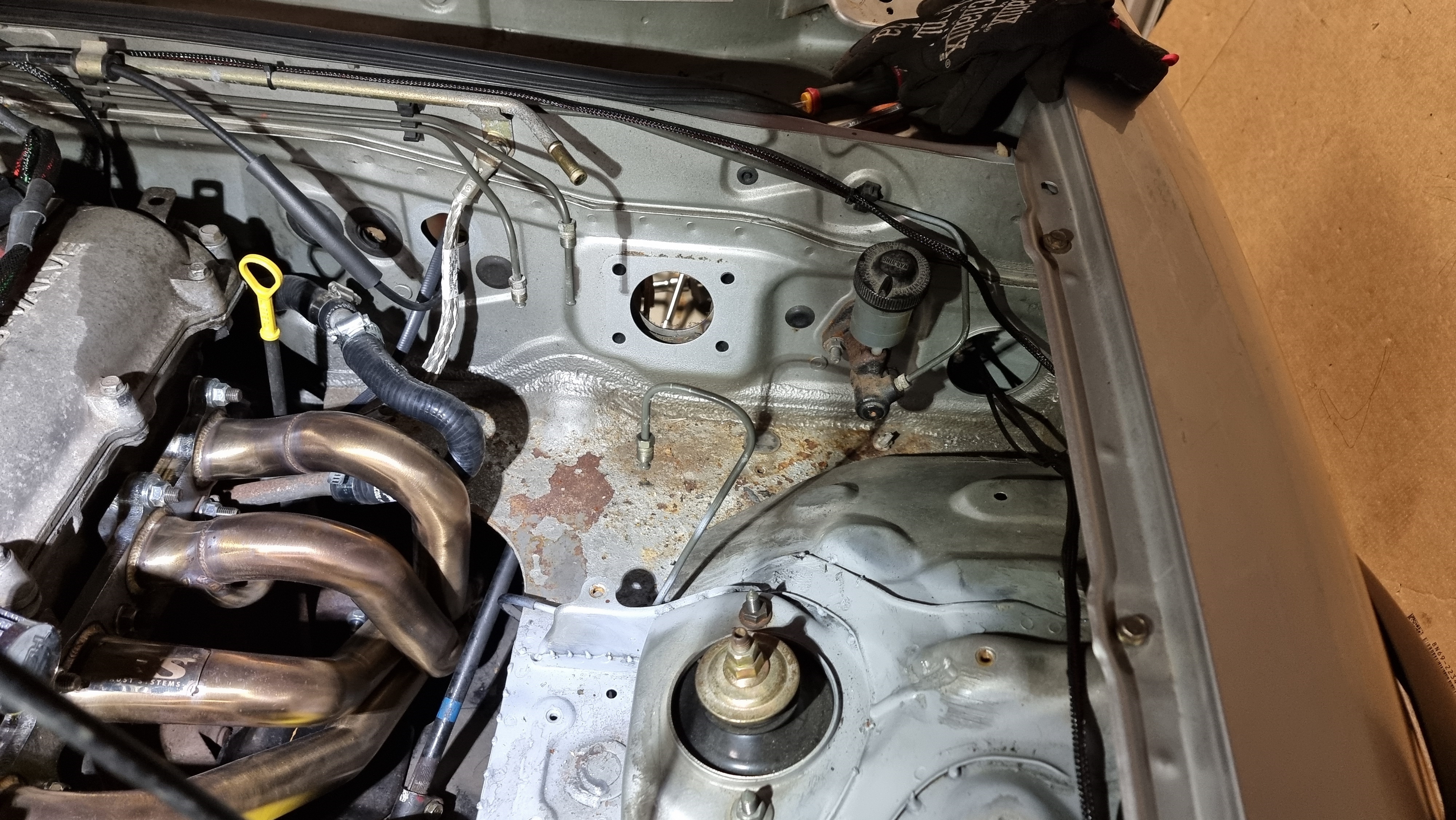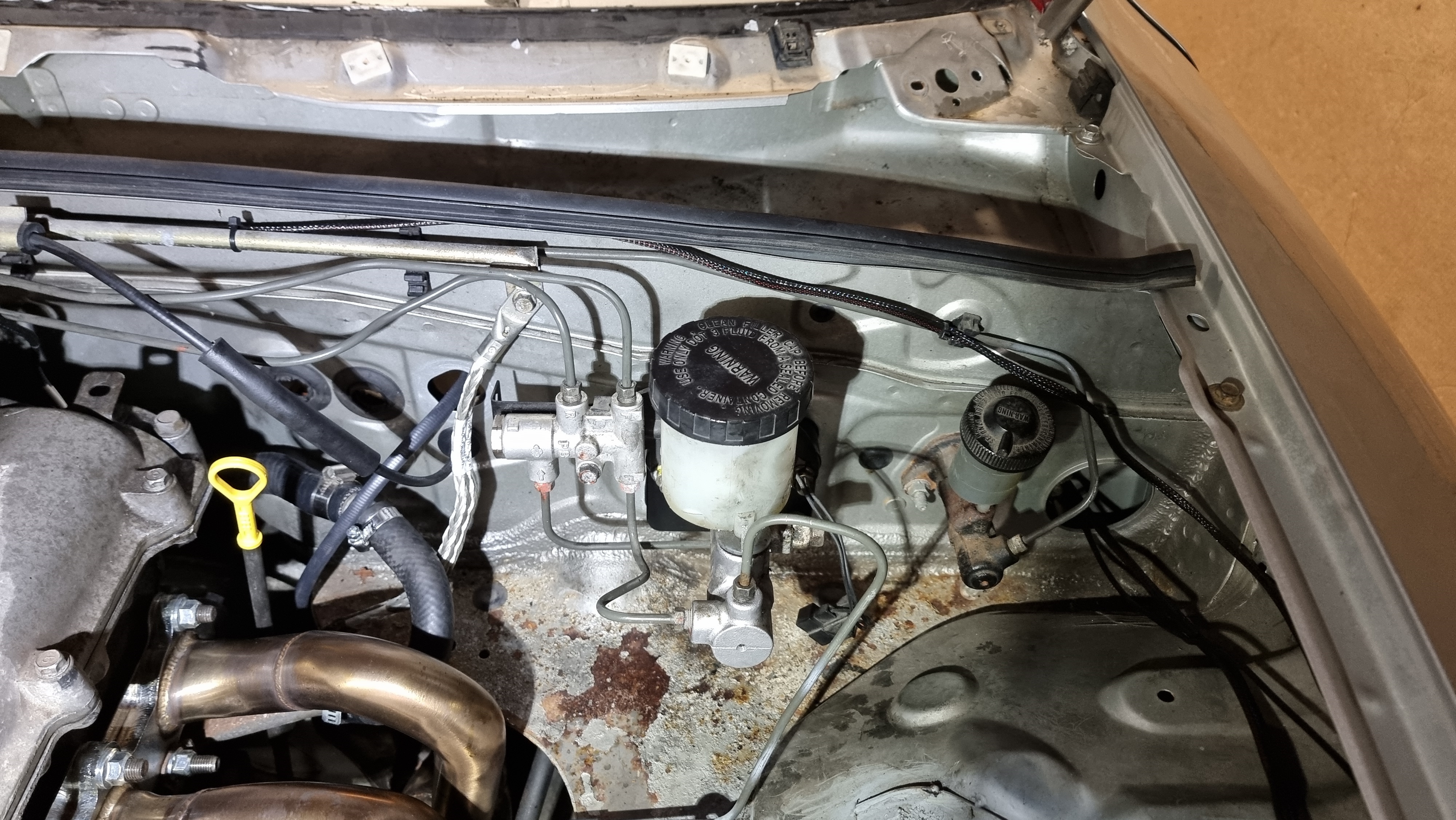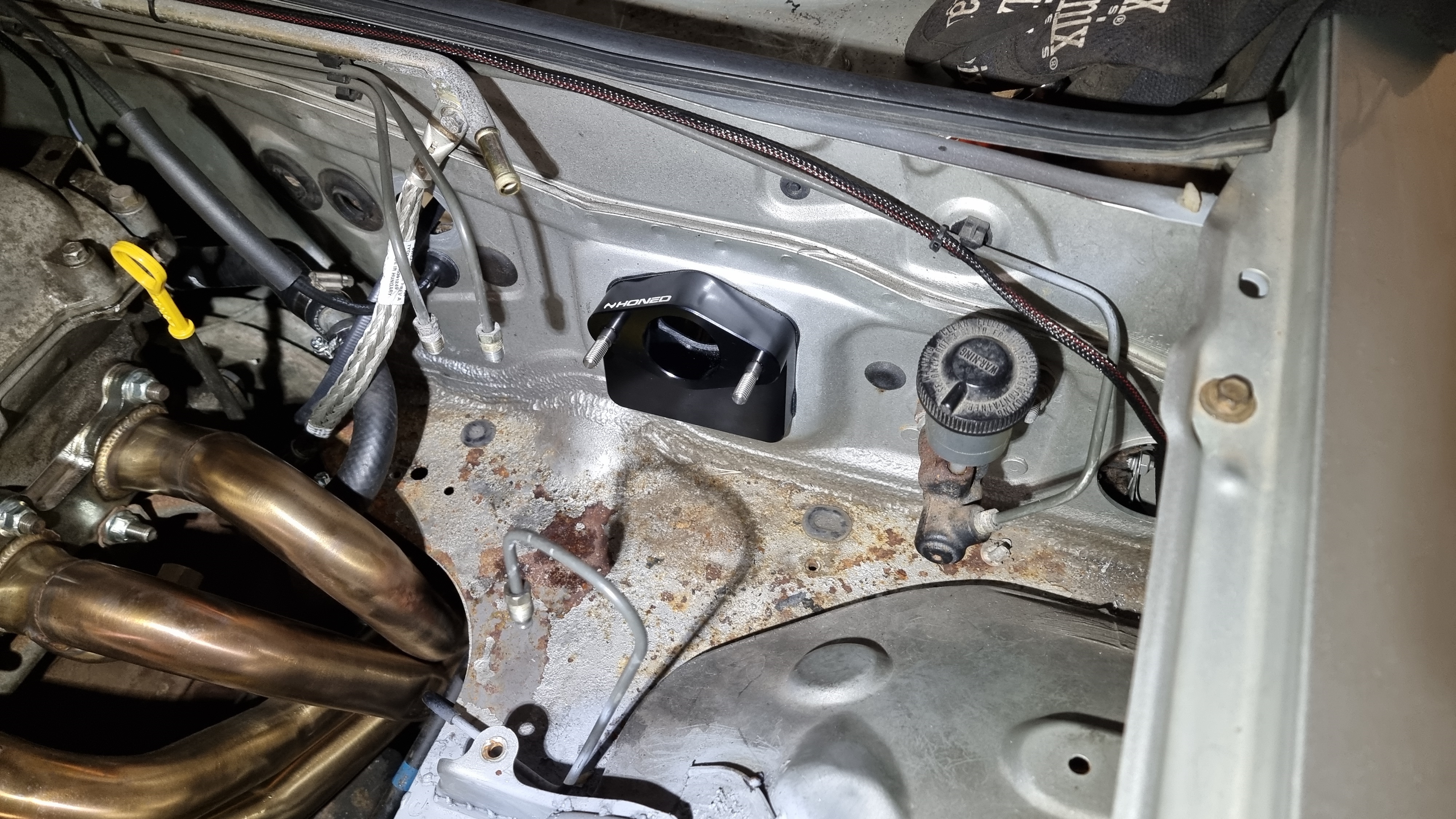 Aujourd'hui c'était donc installation du booster delete de chez Honed. Première étape, démontage du maitre cylindre   Puis on démonte le booster (en ayant déconnecté la pédale au préalable bien sur)   Vu que j'ai récupéré de la place, je me suis attaqué a la réparation de la durite de bypass du radiateur de chauffage qui a chauffé, je suis pas passé loin  Dans mon tas de pièce, j'ai trouvé une durite d'origine (toujours garder les vieilles durites), que j'ai recoupé pour faire un coude a 180 beaucoup plus court  Ca fit parfaitement et j'ai gagné un peu de distance par rapport au collecteur  Par conséquence, a moi la 3ème purge de LDR en l'espace de 2 jours.... bon après j'ai l'outil qui va bien ça se fait facilement.  Puis je repasse au brake booster, le kit est bien fait, il faut repercer la pédale pour changer l'angle de poussée de la tige, et bien le gabarit de perçage est fourni avec   La nouvelle tige est founie également, il faut cependant récupérer la fixation sur le booster d'origine  J'installe le support  Et je remet le maitre cylindre, comme on peut le constater, il est reculé de 5cm, je vais donc devoir tordre les durites rigides.  Bon, c'est un peu la galère pour remettre les durites, j'y aoi passé pas mal de temps, mais ça passe  Voilà, tout ça a dégagé  Ca rends bien, purge des freins, et franchement la sensation a la pédale est bien ferme, oui faut appuyer, mais ça semble consistant. Je verrai sur piste.