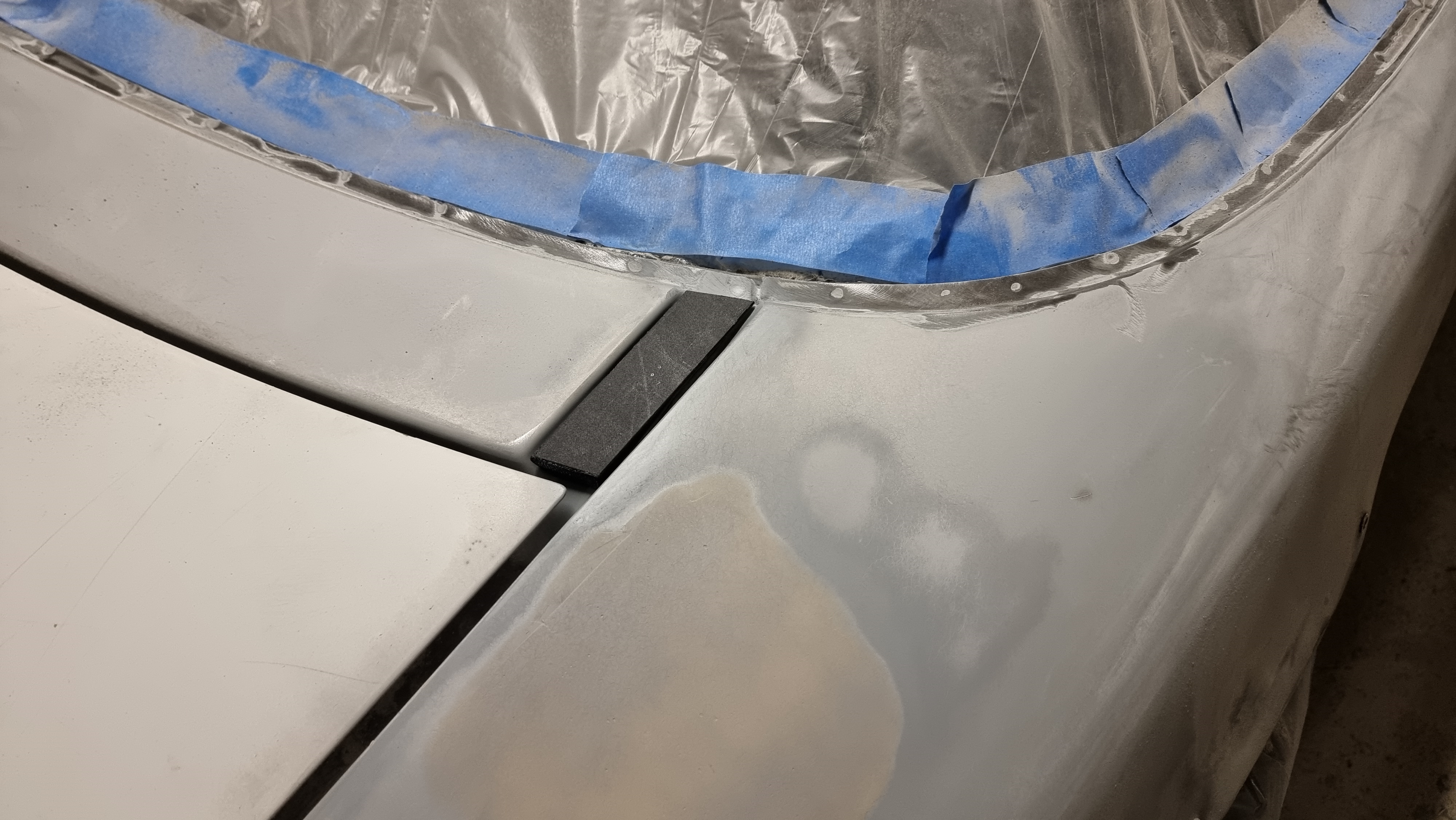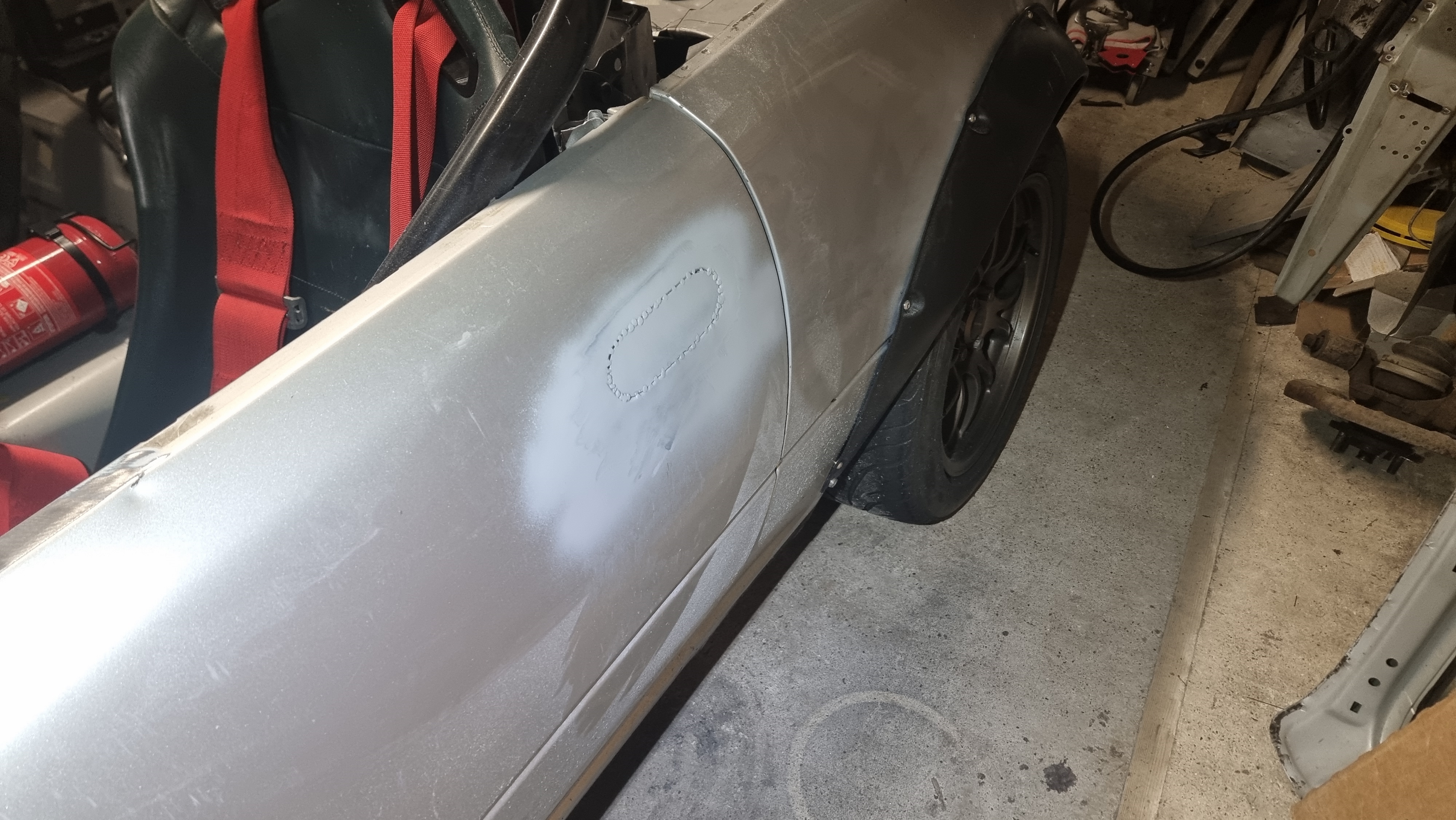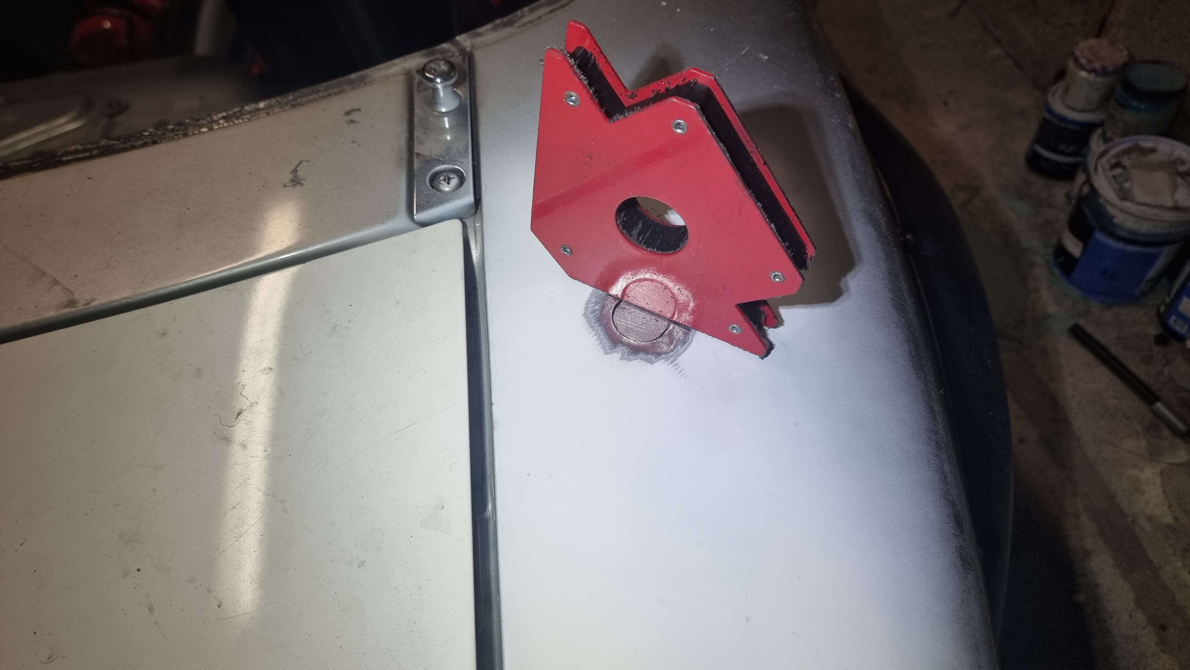 Maintenant que la sortie aux Ecuyers est passée, je peux passer a un truc que je voulais tester depuis quelques temps, un peu de carrosserie. Je préviens tout de suite les pros, c'est la barquette, pas un showcar, c'est ma bagnole pour tester des trucs, c'est peut etre dégueu, je m'en tape Objectif, boucher et lisser le trou de l'antenne ainsi que les emplacements des poignées de porte. Je commence par l'antenne, je me découpe un morceau de tole à la cisaille, je met le métal à nu  Quelques points de soudure plus tard, je meule les points et je me retrouve avec une surface pas mal, par contre je suis deg j'ai un peu traversé a un moment. Rien de grave  Puis je fais la même chose avec les poignées de porte, le fait de pouvoir travailler à la cisaille et pas la meuleuse est vachement plus précis, j'obtiens un resultat pas trop mal  Pareils, quelques points de soudure  Je fais de même de l'autre coté, je meule et je balance un petit coup d'apres antirouille.  Puis, je ponce l'apret, je prépare du mastic polyester, et je lisse, j'en met un peu plus qu'il ne faudrait mais c'est pas grave  On voit encore un peu la découpe, je vais laisser sécher, poncer et je mettrais peut etre une deuxieme passe de mastic.  J'ai également reçu tout le matériel de masquage, il faut que je démonte les parechocs et les fender flares pour les peindres également. D'ailleurs j'ai un petit dileme, est-ce que je peints les fenders ou je les laisses en noir, j'avoue ne pas trop savoir encore