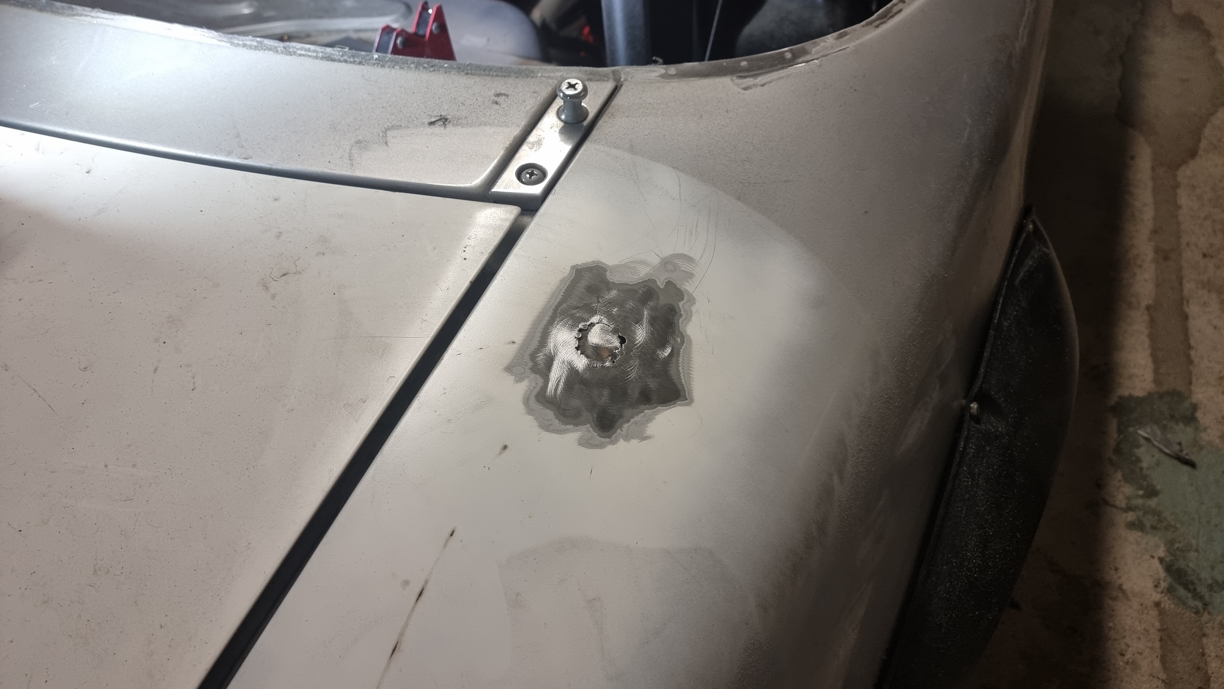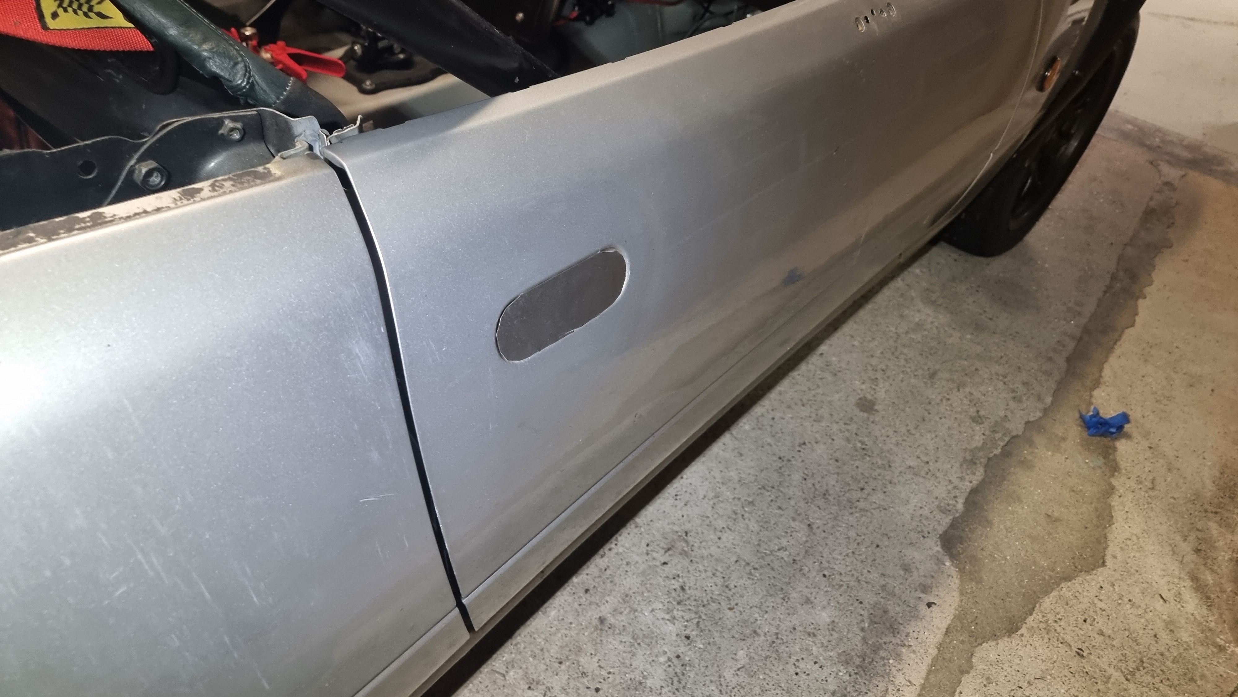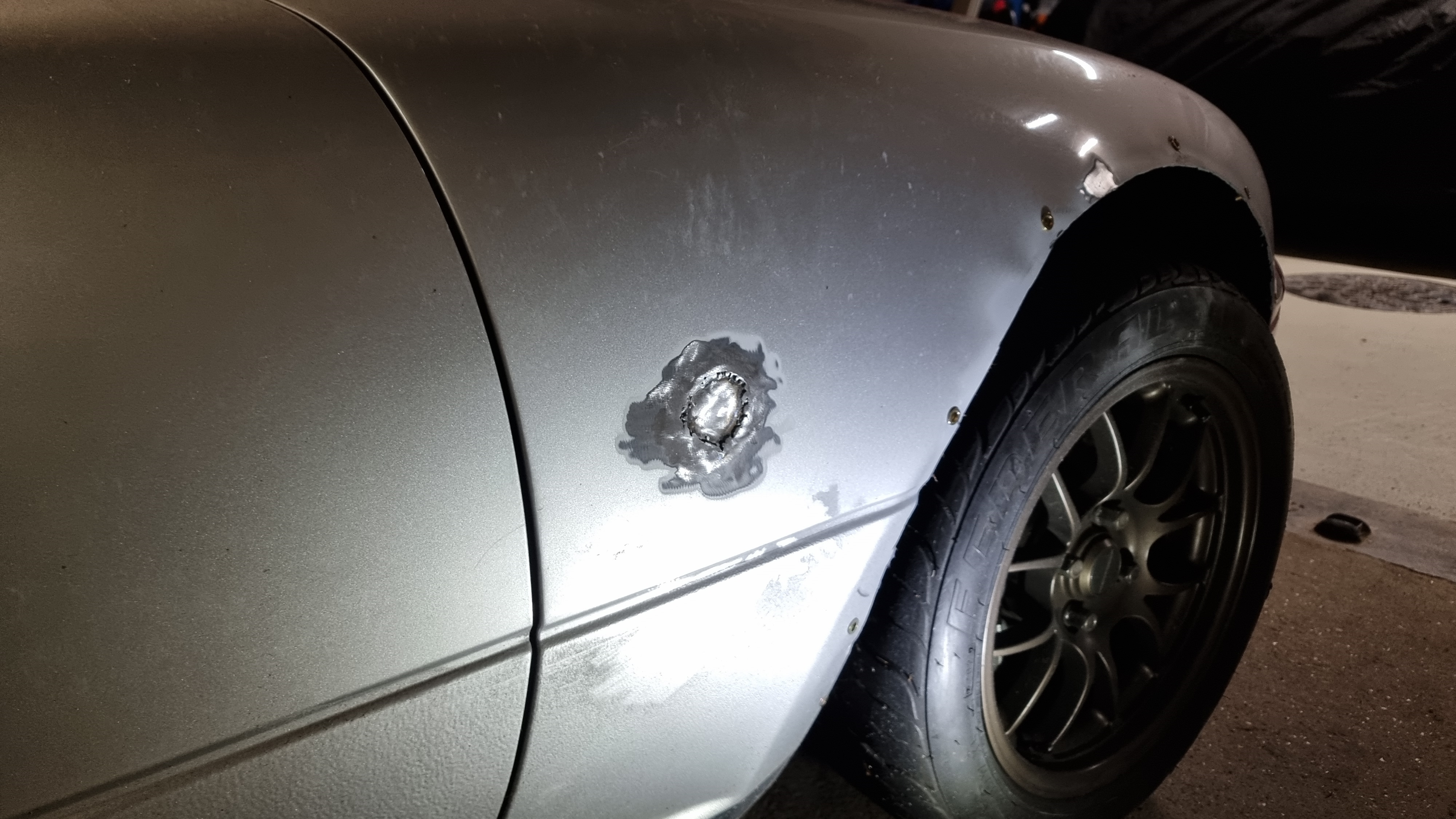 Maintenant que la sortie aux Ecuyers est passée, je peux passer a un truc que je voulais tester depuis quelques temps, un peu de carrosserie. Je préviens tout de suite les pros, c'est la barquette, pas un showcar, c'est ma bagnole pour tester des trucs, c'est peut etre dégueu, je m'en tape Objectif, boucher et lisser le trou de l'antenne ainsi que les emplacements des poignées de porte. Je commence par l'antenne, je me découpe un morceau de tole à la cisaille, je met le métal à nu  Quelques points de soudure plus tard, je meule les points et je me retrouve avec une surface pas mal, par contre je suis deg j'ai un peu traversé a un moment. Rien de grave  Puis je fais la même chose avec les poignées de porte, le fait de pouvoir travailler à la cisaille et pas la meuleuse est vachement plus précis, j'obtiens un resultat pas trop mal  Pareils, quelques points de soudure  Je fais de même de l'autre coté, je meule et je balance un petit coup d'apres antirouille.  Puis, je ponce l'apret, je prépare du mastic polyester, et je lisse, j'en met un peu plus qu'il ne faudrait mais c'est pas grave  On voit encore un peu la découpe, je vais laisser sécher, poncer et je mettrais peut etre une deuxieme passe de mastic.  J'ai également reçu tout le matériel de masquage, il faut que je démonte les parechocs et les fender flares pour les peindres également. D'ailleurs j'ai un petit dileme, est-ce que je peints les fenders ou je les laisses en noir, j'avoue ne pas trop savoir encore