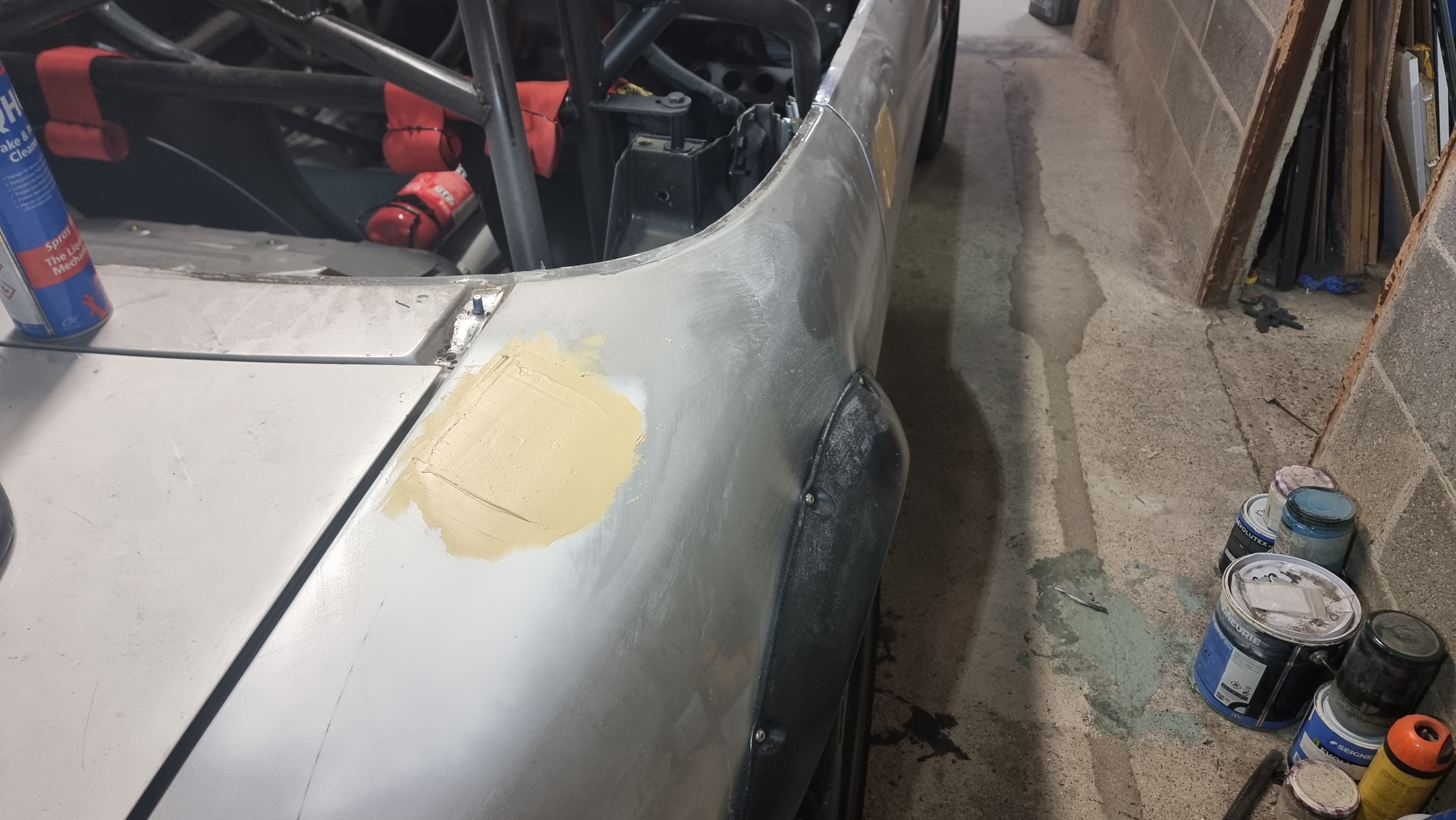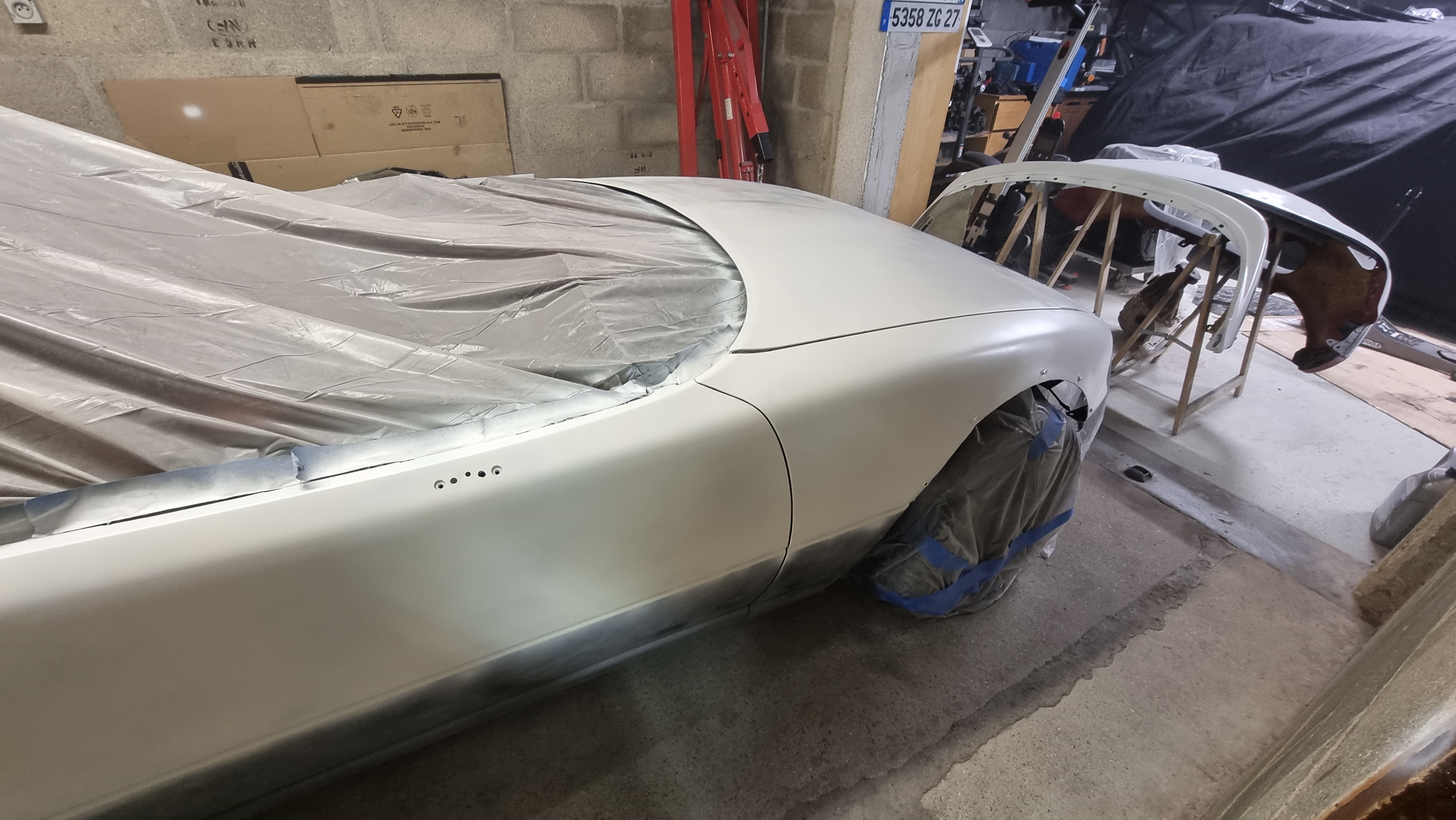 J'ai continué la prépa carrosserie sur la barquette, j'ai bouché également les répétiteurs de clignotants sur les ailes  Puis démontage des parechocs et phares, et on masque tout ce qui doit être protégé (et c'est long a faire)   J'en ai profité pour boucher les trous dans le parechoc également  Et là j'ai attaqué ma longue pénitence de ce dimanche avec ma nouvelle amie, la ponceuse pneumatique, que c'est long, j'y ai passé 5h cet après midi  Mais j'ai fait toute la voiture, j'ai de la poussière de peinture partout, mais c'est fait  Les lissages au mastic sortent pas trop mal, c'est pas digne d'un carrossier pro, on sent un peu sous la main, mais ça me suffit totalement pour une "poubelle de piste"   Me reste a poncer les parechocs, un dégraissage, et je vais pouvoir commencer à peindre