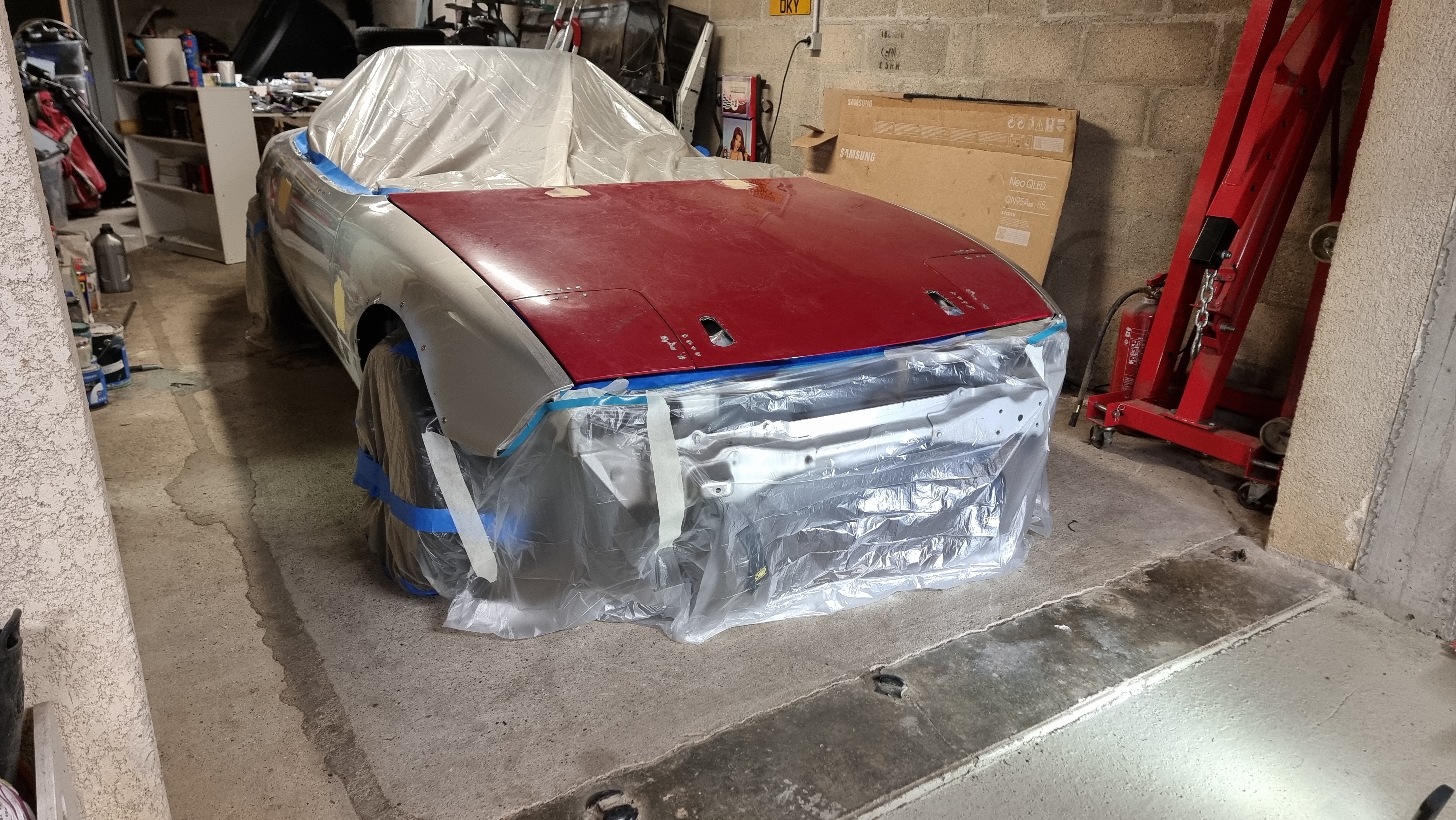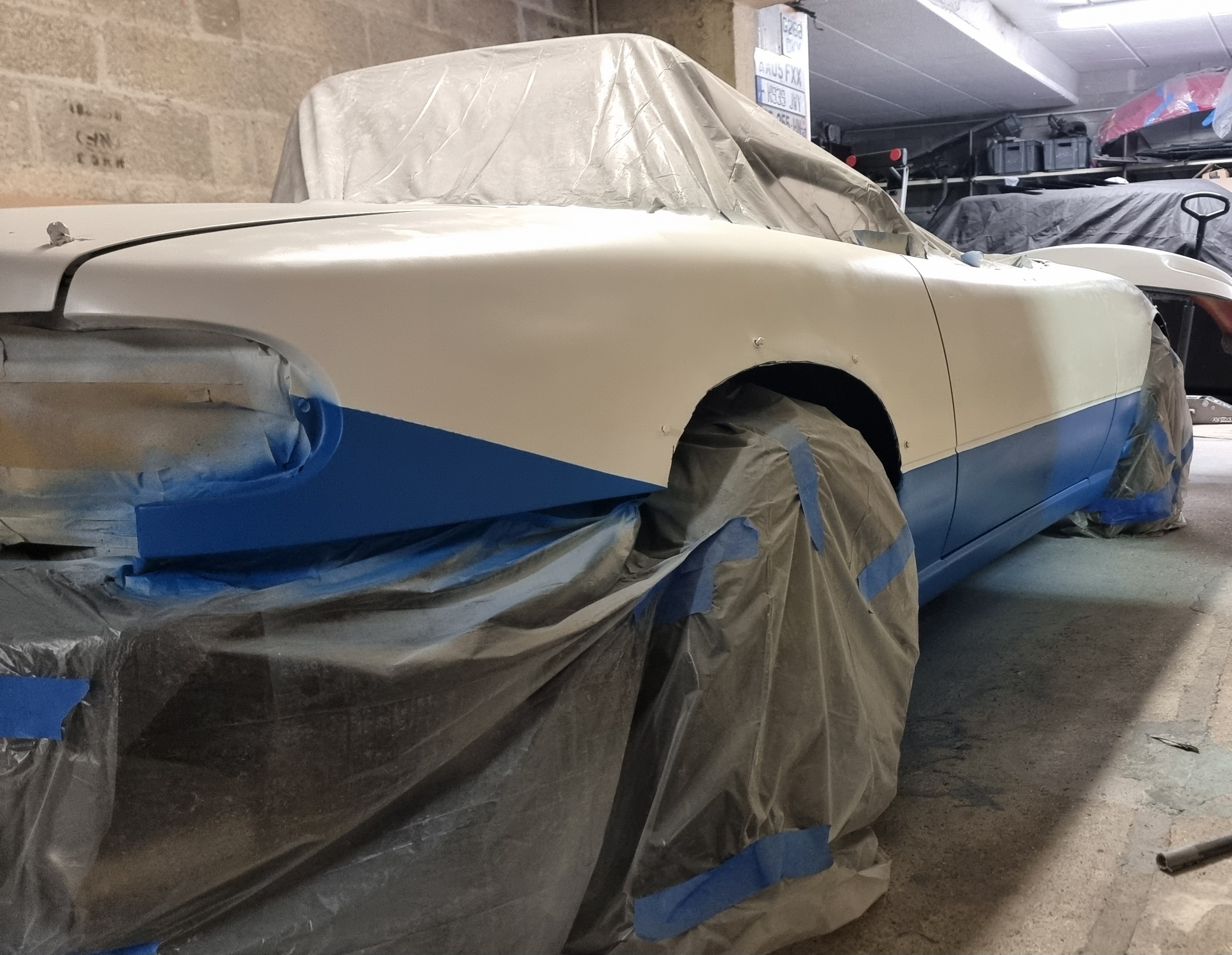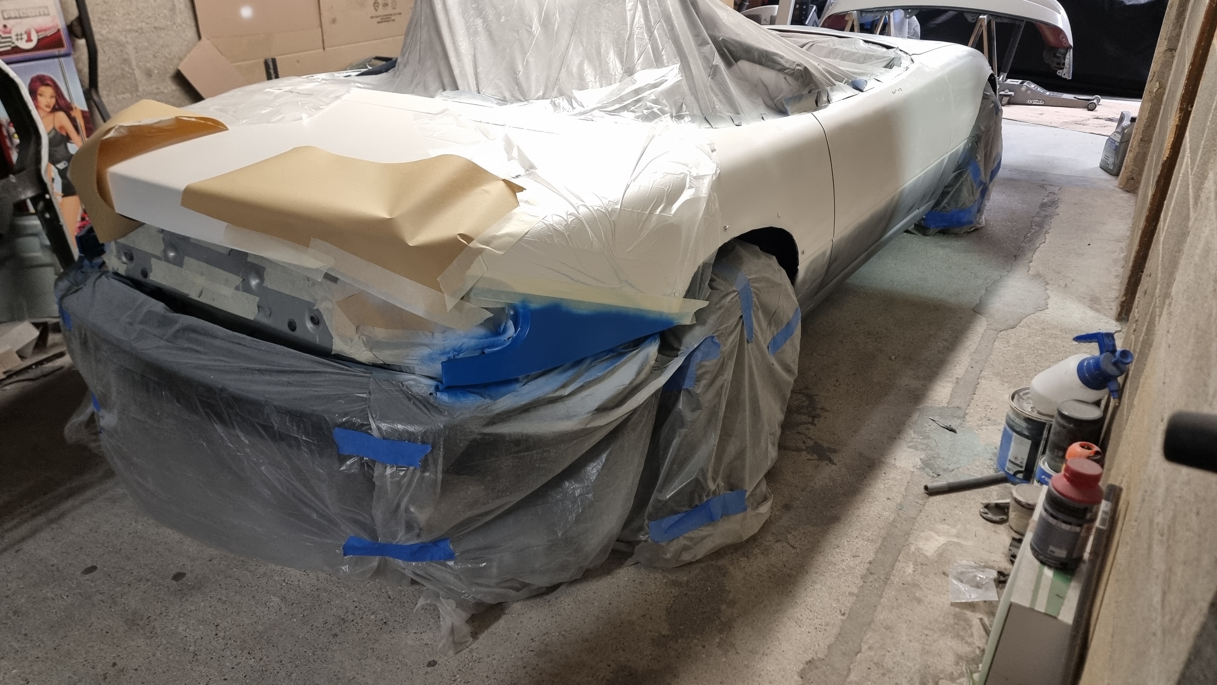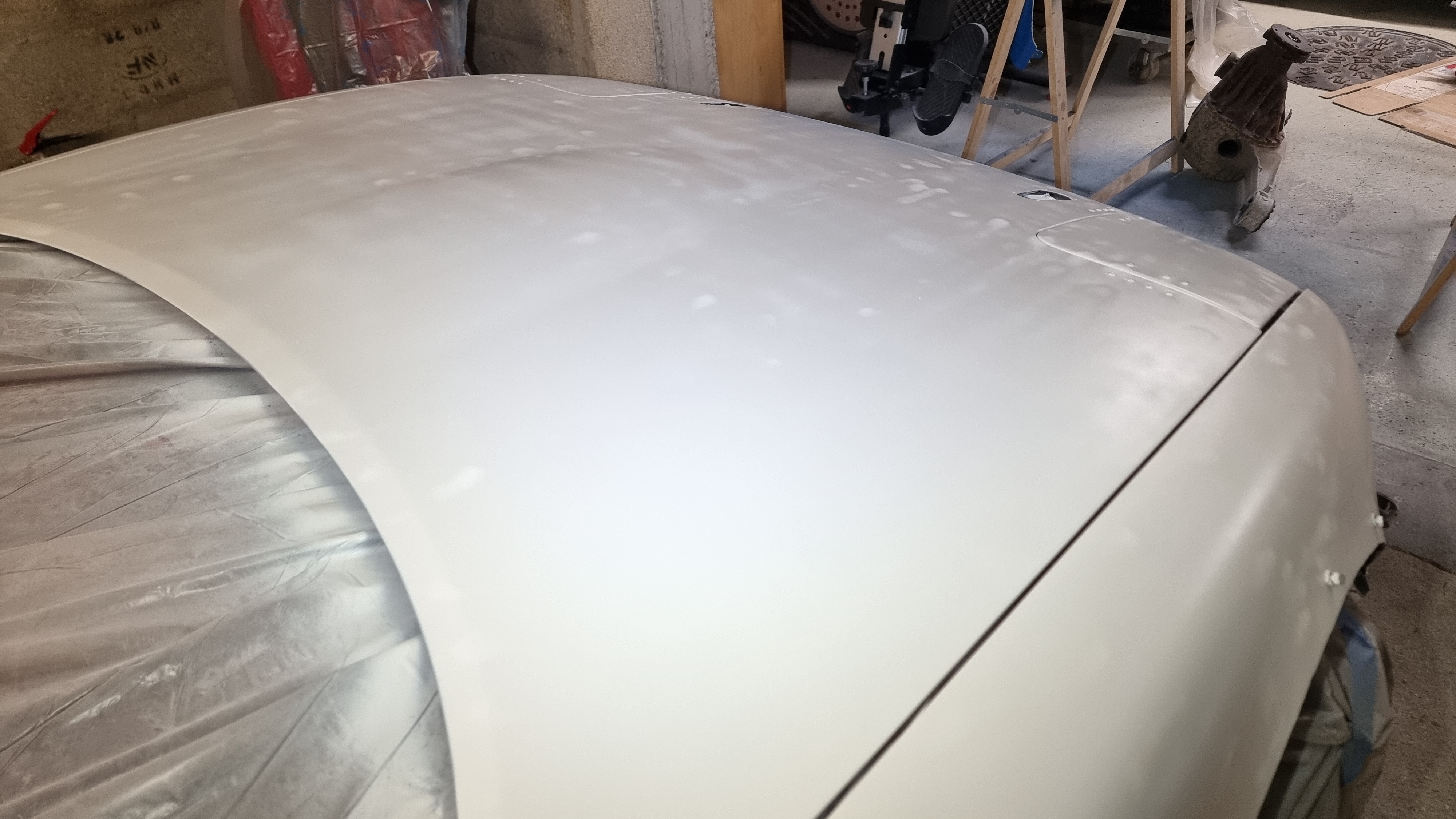 Ponçage de l'aprêt réalisé, j'ai pas pris de photo, pas grand interet, et donc je me suis lancé, je suis passé à la peinture. Pour rappel c'est fait a la montana, Hardcode pour le blanc satiné et 94 electric blue. La première couche de blanc s'est pas trop mal passé, un peu chaud a la bombe de pas faire de traces   Et hier soir, 22H, après 3 verres de vin blanc et une après midi dans les solvants de la peinture, je me suis dit que c'était un bonne idée de faire une deuxieme couche. Ce matin, réveil avec un mal de crane gigantesque (on va dire que c'est a cause des solvants), je découvre que c'était pas une bonne idée  Bon, là j'ai la lumière rasante exprès pour que ça se voit, mais on va pas se mentir, c'est pas terrible, je m'y attendais, je le savais et c'est pas très grave, je pense que y a deux soucis, la MTN hardcore ne se "tends" pas aussi bien que la 94, la 94 est magique et super simple a poser. Et j'ai aussi commandé des fat caps pour avoir un jet plus large. Je vais voir si j'arrive a trouver de la 94 en blanc pour faire une dernière couche, ou bien je reste comme ça, c'est pas très grave. Puis je suis passé a la partie bleue, et là comme c'est de la 94, ben ça ressort bien mieux  J'étais super content de la démarquation, jusqu'a ce que je vois ça  Puis j'ai fait les cotés   Pour le coup, ça rends pas mal du tout de loin et en photo, en tout cas c'est mieux qu'avant.  Puis il me restait a faire quelques petits accessoires, les feux arrières de récupération avaient un film tinté par dessus et étaient vraiment moches et blanchis. Bon je veux pas faire un show car mais si je peux améliorer pourquoi pas. Donc un coup de ponçage 600/1000/1500 a l'eau et rénovateur par polymérisation ali express, et c'est pas mal  Puis, peinture des rétros égalements  Il va me rester a voir si je peux récupérer un peu au moins le capot, vernir par dessus, remonter et m'attaquer aux stickers qu'il faut que je commande.