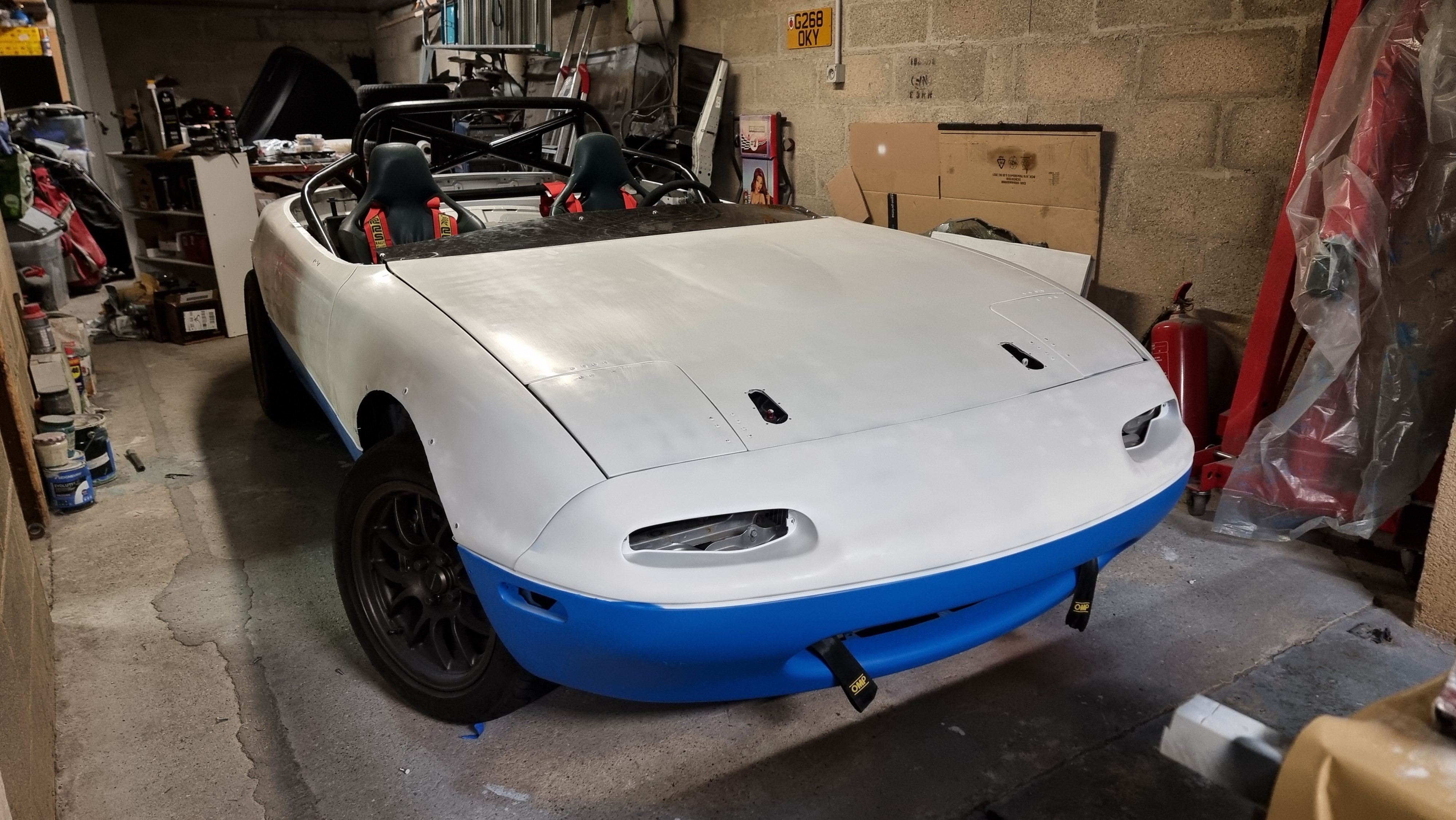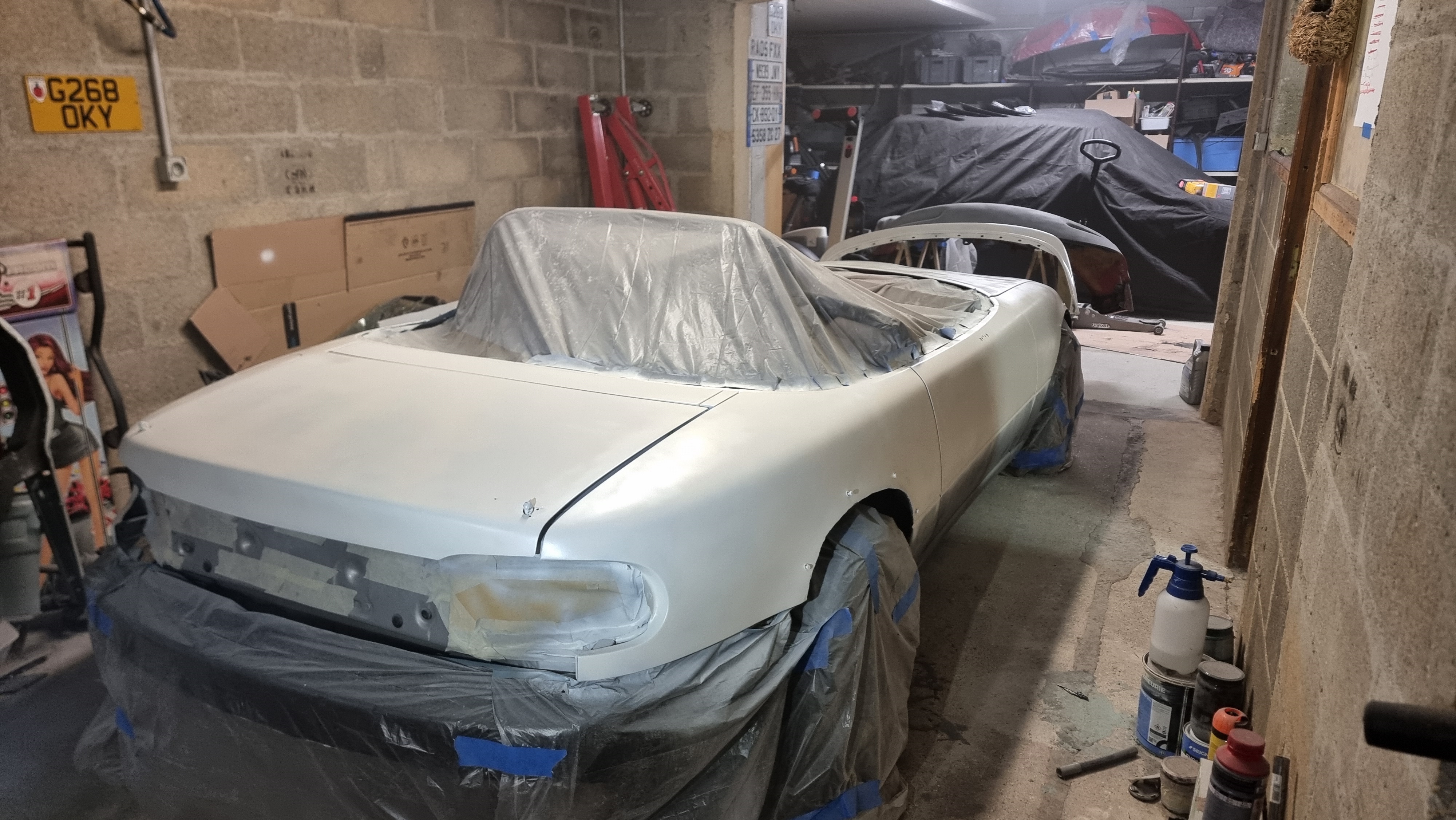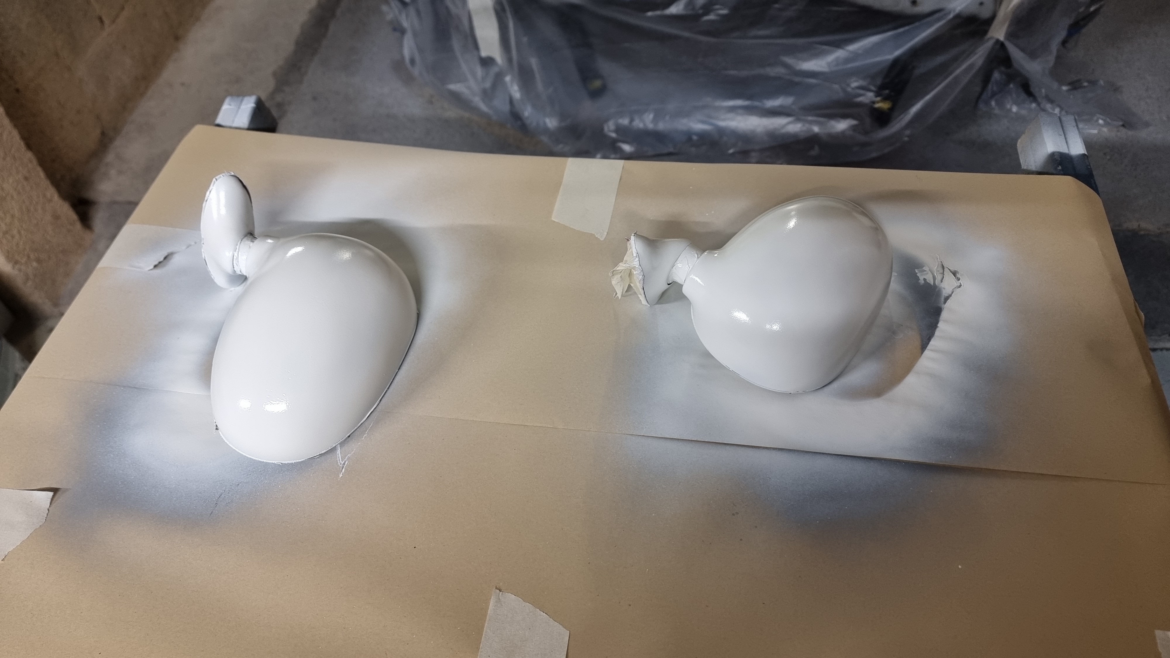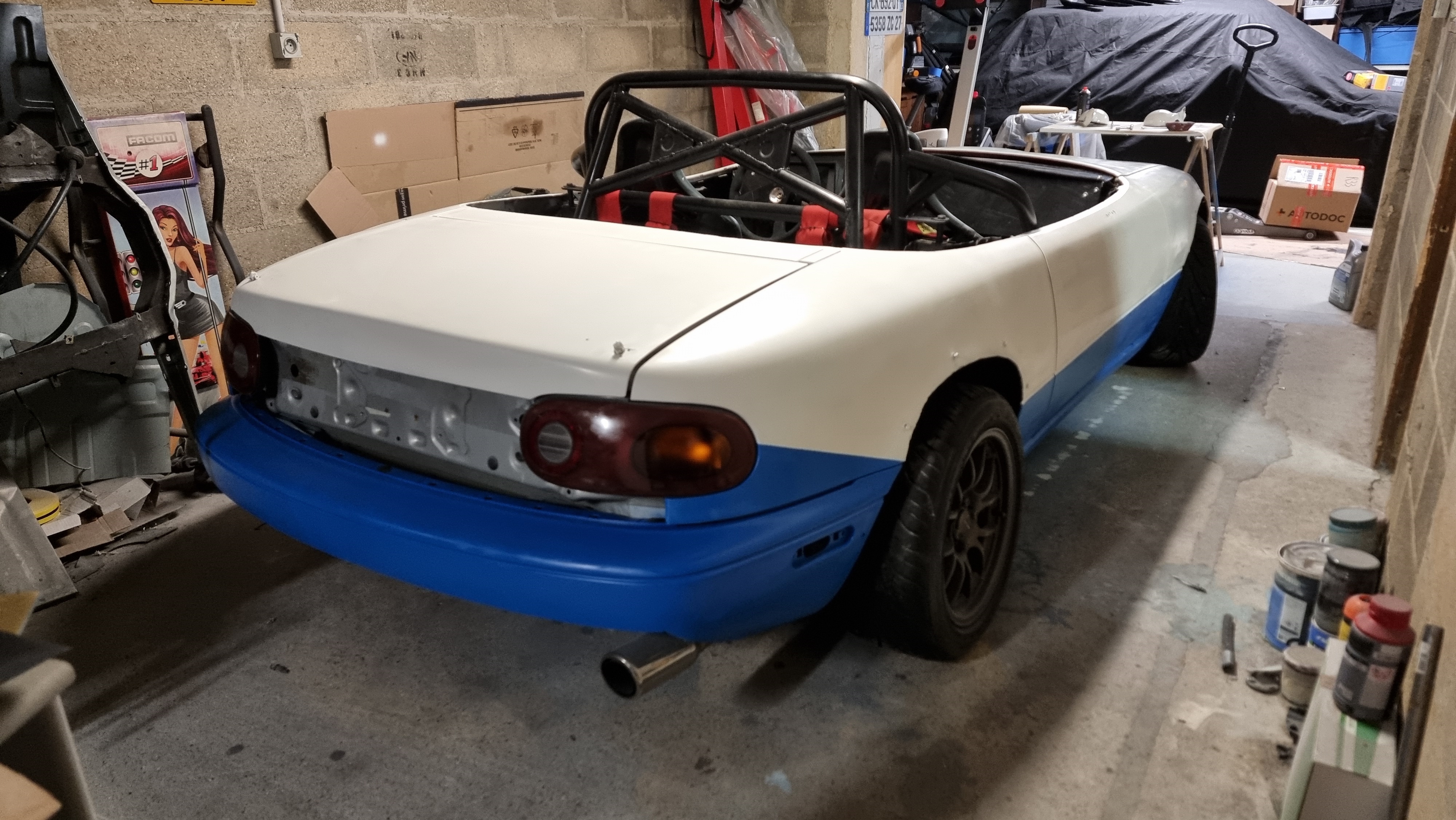 Ponçage de l'aprêt réalisé, j'ai pas pris de photo, pas grand interet, et donc je me suis lancé, je suis passé à la peinture. Pour rappel c'est fait a la montana, Hardcode pour le blanc satiné et 94 electric blue. La première couche de blanc s'est pas trop mal passé, un peu chaud a la bombe de pas faire de traces   Et hier soir, 22H, après 3 verres de vin blanc et une après midi dans les solvants de la peinture, je me suis dit que c'était un bonne idée de faire une deuxieme couche. Ce matin, réveil avec un mal de crane gigantesque (on va dire que c'est a cause des solvants), je découvre que c'était pas une bonne idée  Bon, là j'ai la lumière rasante exprès pour que ça se voit, mais on va pas se mentir, c'est pas terrible, je m'y attendais, je le savais et c'est pas très grave, je pense que y a deux soucis, la MTN hardcore ne se "tends" pas aussi bien que la 94, la 94 est magique et super simple a poser. Et j'ai aussi commandé des fat caps pour avoir un jet plus large. Je vais voir si j'arrive a trouver de la 94 en blanc pour faire une dernière couche, ou bien je reste comme ça, c'est pas très grave. Puis je suis passé a la partie bleue, et là comme c'est de la 94, ben ça ressort bien mieux  J'étais super content de la démarquation, jusqu'a ce que je vois ça  Puis j'ai fait les cotés   Pour le coup, ça rends pas mal du tout de loin et en photo, en tout cas c'est mieux qu'avant.  Puis il me restait a faire quelques petits accessoires, les feux arrières de récupération avaient un film tinté par dessus et étaient vraiment moches et blanchis. Bon je veux pas faire un show car mais si je peux améliorer pourquoi pas. Donc un coup de ponçage 600/1000/1500 a l'eau et rénovateur par polymérisation ali express, et c'est pas mal  Puis, peinture des rétros égalements  Il va me rester a voir si je peux récupérer un peu au moins le capot, vernir par dessus, remonter et m'attaquer aux stickers qu'il faut que je commande.