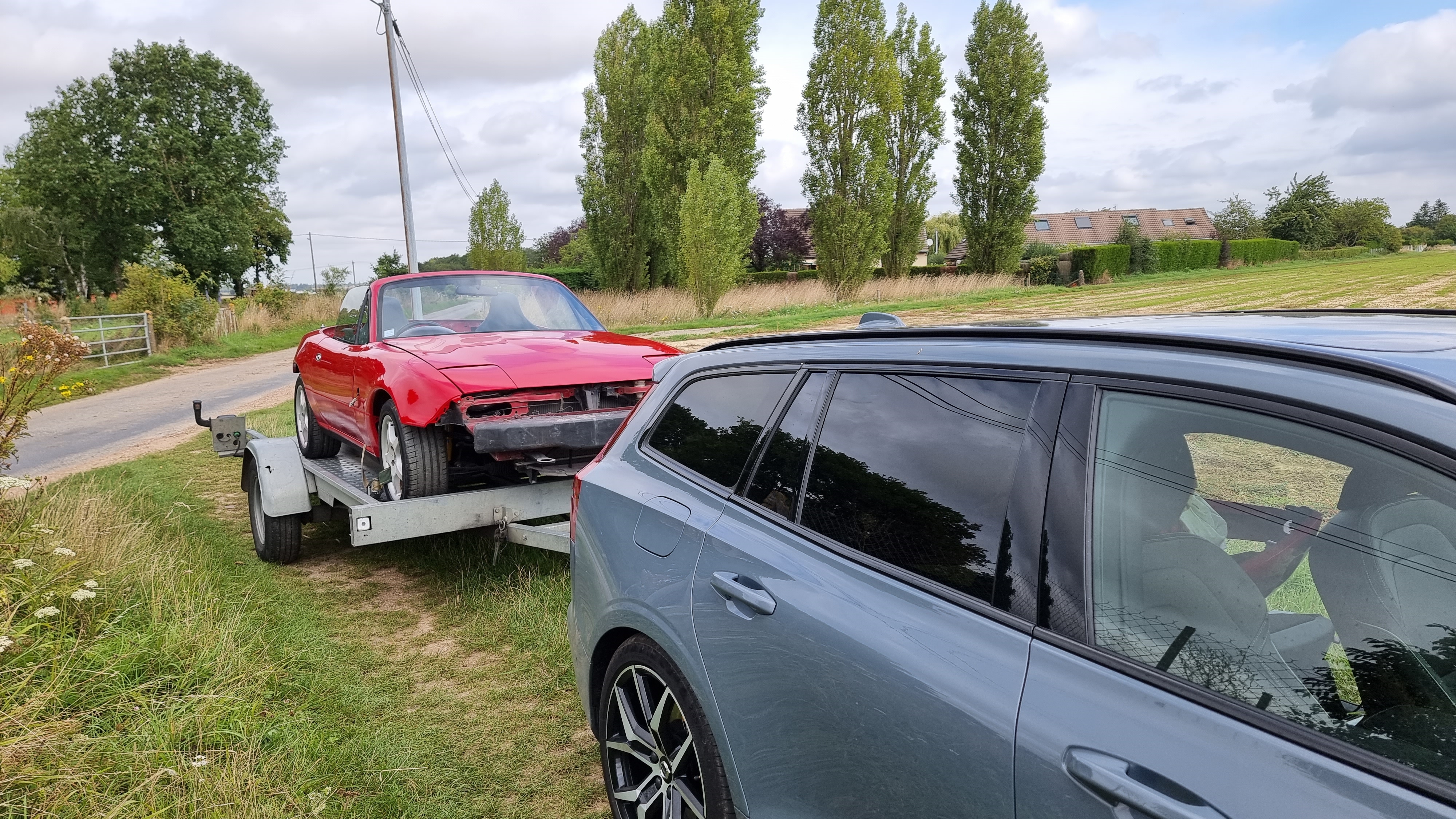 Puis, ce we, il était temps d'aller chercher Flash, j'ai loué le plateau et récupéré la voiture chez le carrossier. A ma demande et comme je lui avait amené en partie démontée, il n'a pas procédé au remontage, donc j'ai le break plein avec les pieces de carrosserie qui ne sont pas installée, le carrossier m'a peint un parechoc avant d'avance que je lui avait ramené, ainsi qu'une paire de rétros supplémentaires et des caches phares également, c'était des pièces en plus que j'avais et il me les a fait en plus