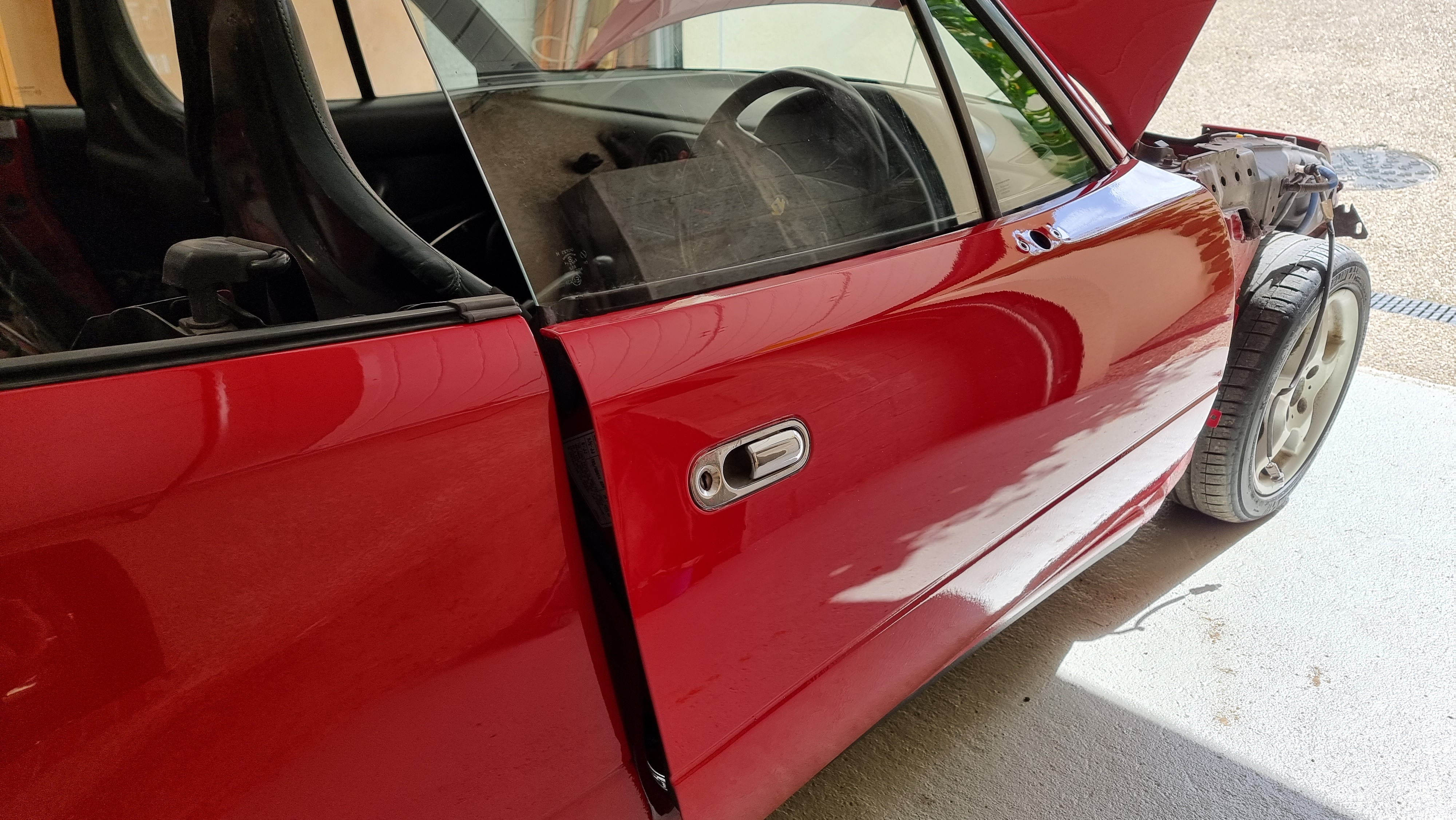 J'ai réinstallé le joint qui fait le tour de la caisse au niveau de la capote et je dois également ajuster la porte conducteur qui est trop basse, le carrossier m'avait prévenu qu'il restait les ajustements a faire aussi, c'est long mais pas très compliqué