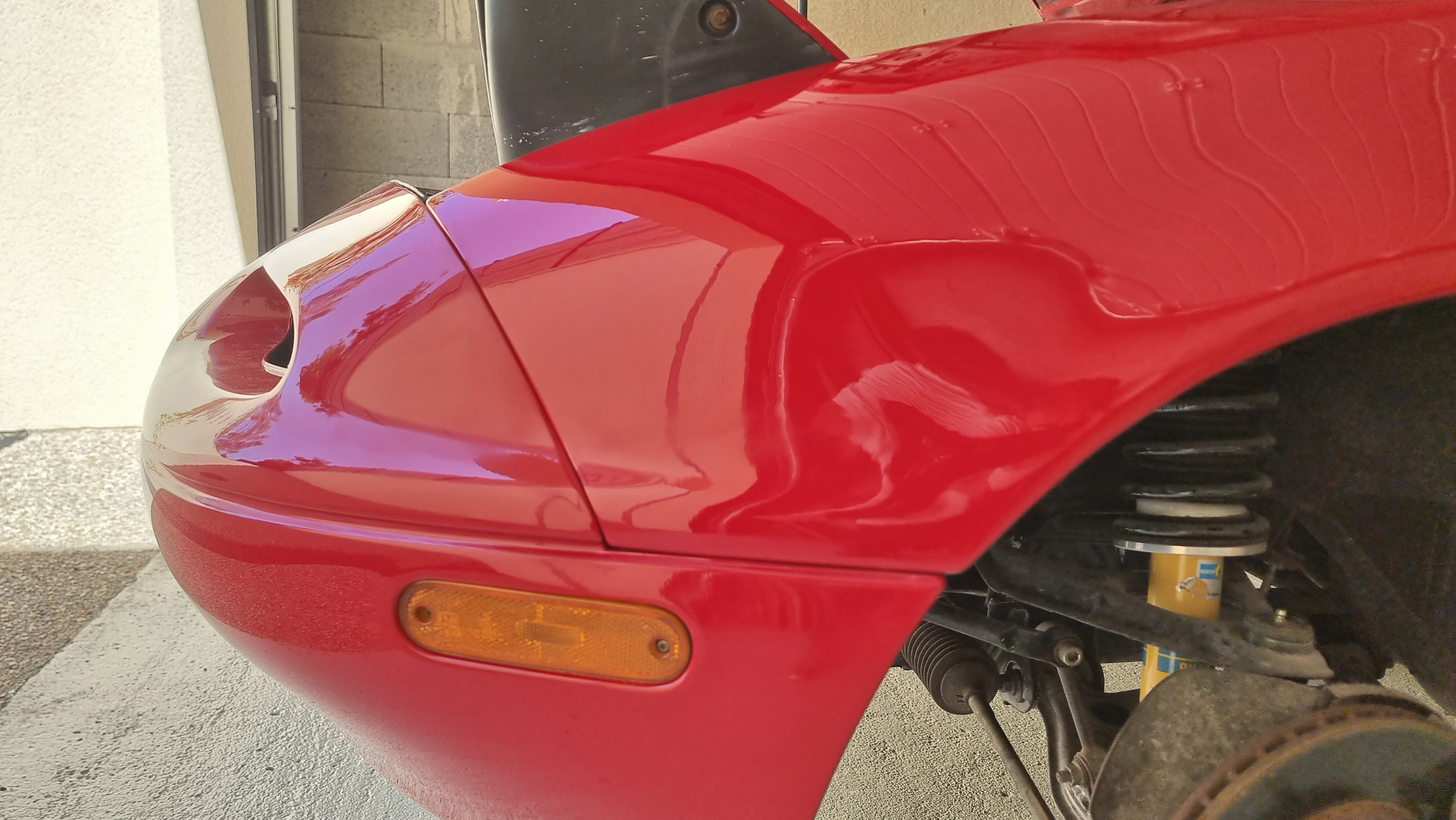 Ayant reçu les fixations de parechoc avant ainsi que quelques autres petites pièces de finition (une barre de renfort du parechoc et les 2 buses de laveglace, 110 euros :tinostar: ) j'ai fixé le parechoc avant de façon définitive, 2 heures d'ajustement pour retrouver tous les clips, les vis, et essayer d'ajuster correctement les ailes. Malheureusement, l'aile droite est une aftermarket et l'aile gauche une OEM, et on voit bien la différence d'ajustement, c'est le mieux que j'ai obtenu, et j'ai du un peu forcer sur le serrage aile / capot,
