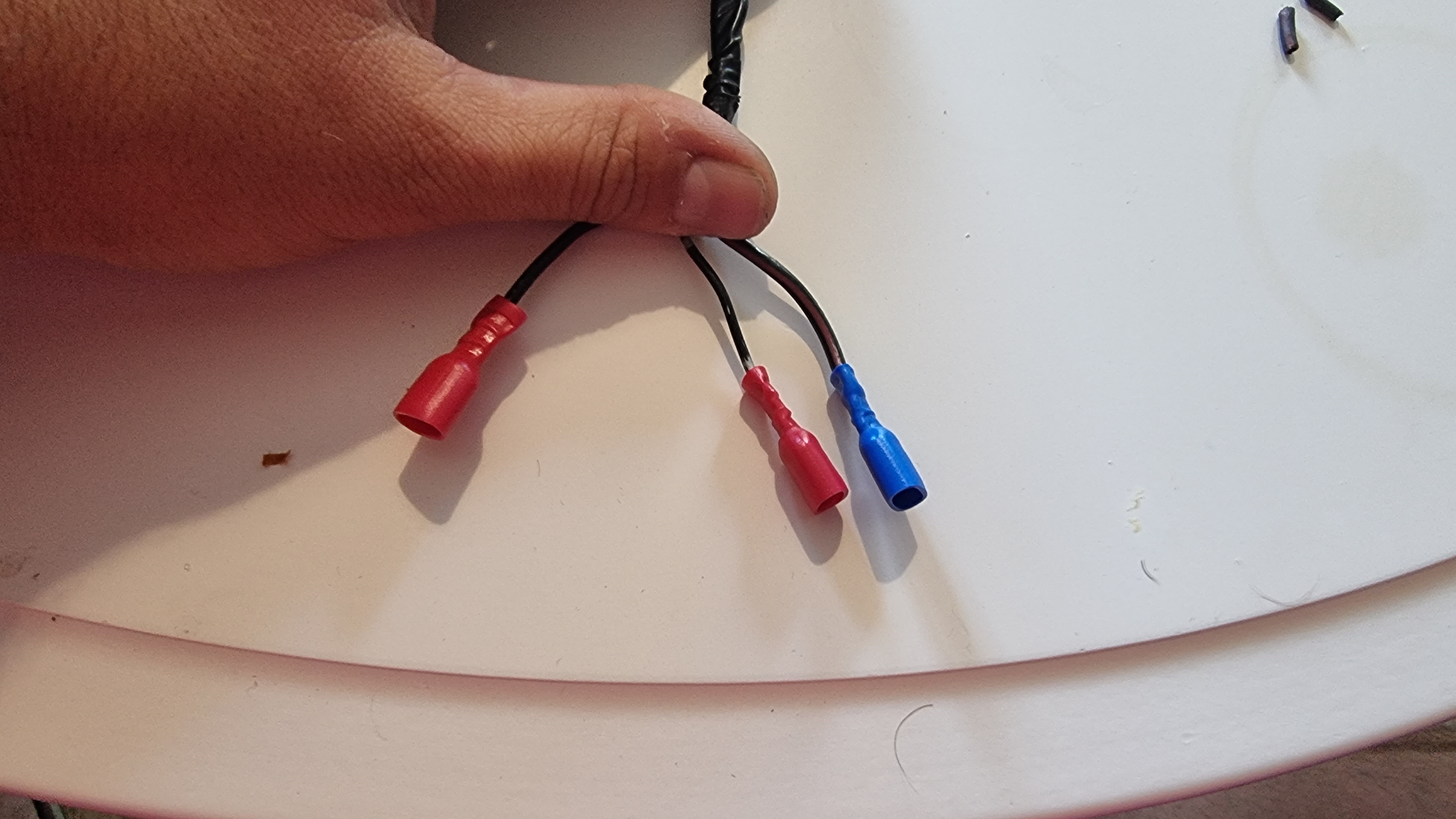 On récupère un gros cable + et deux de masse, qu'on serti sur des cosses