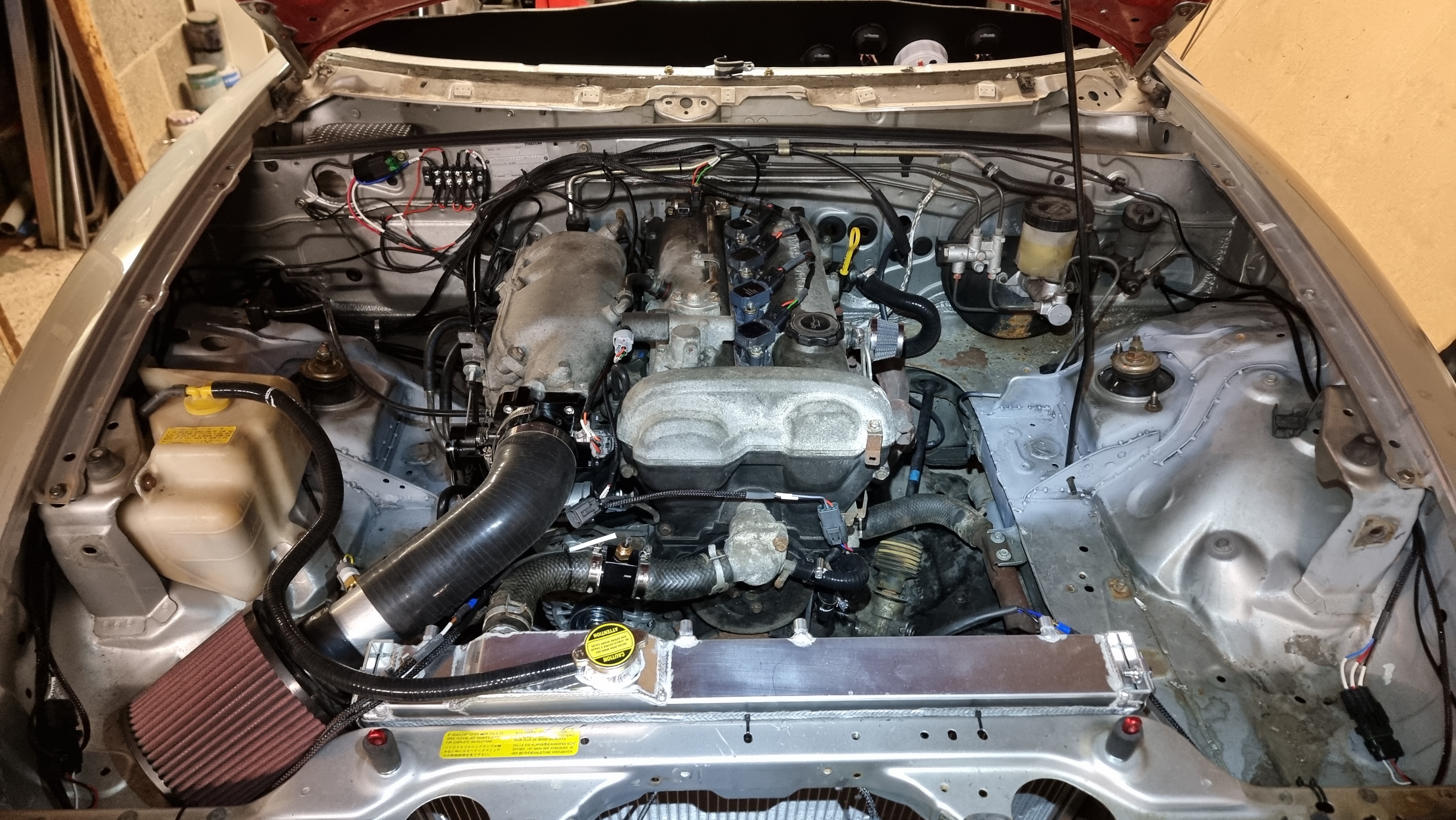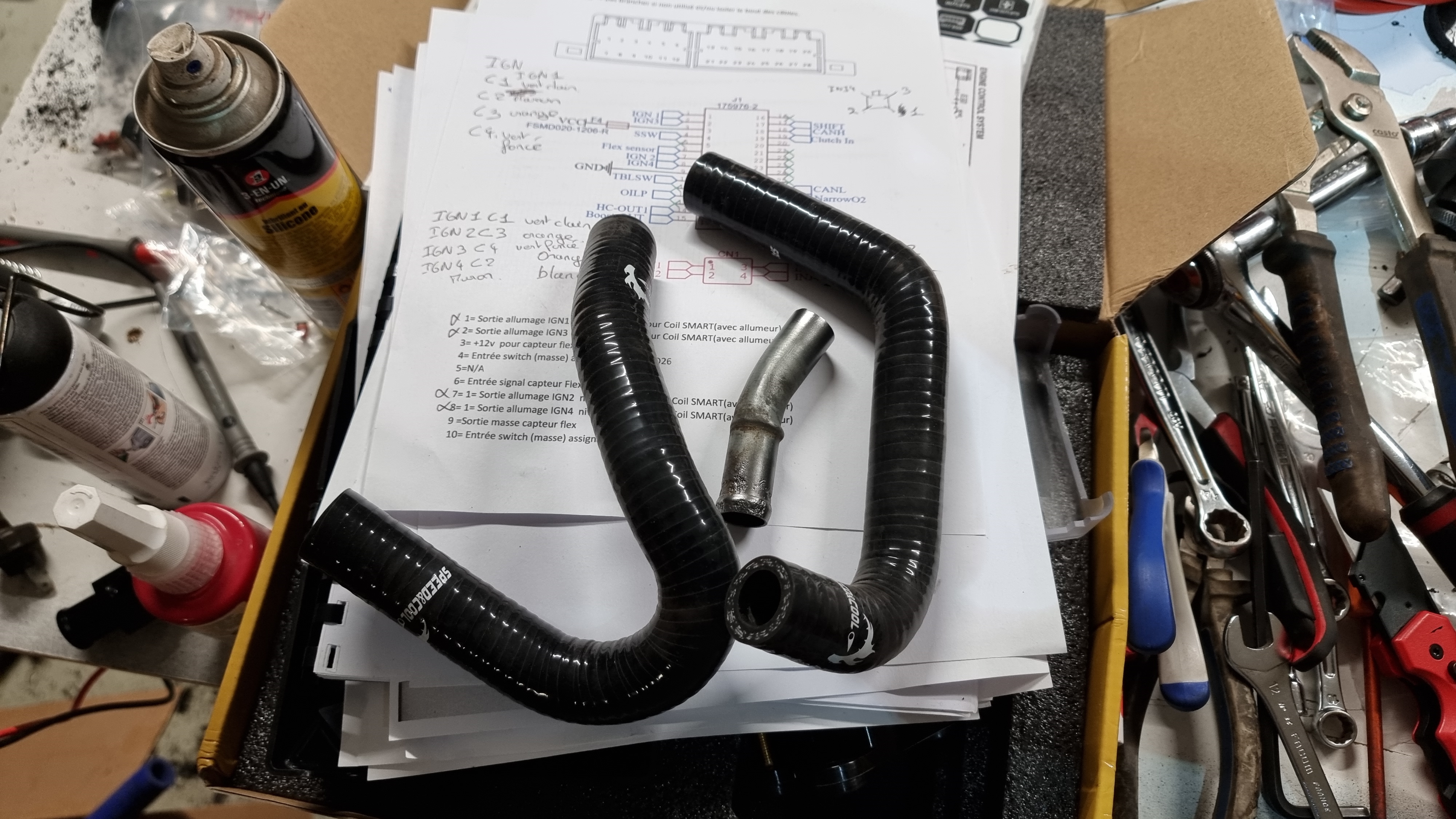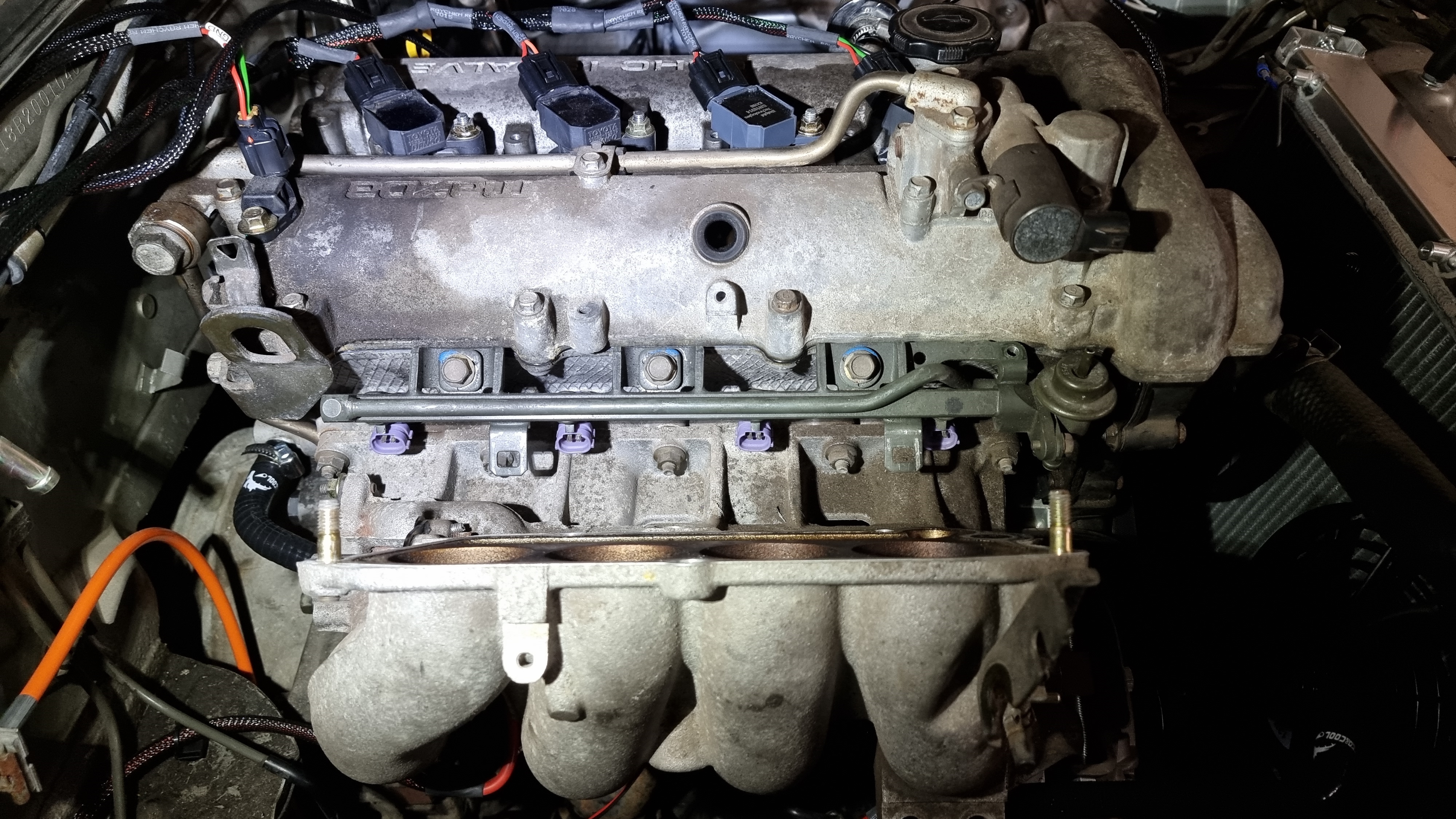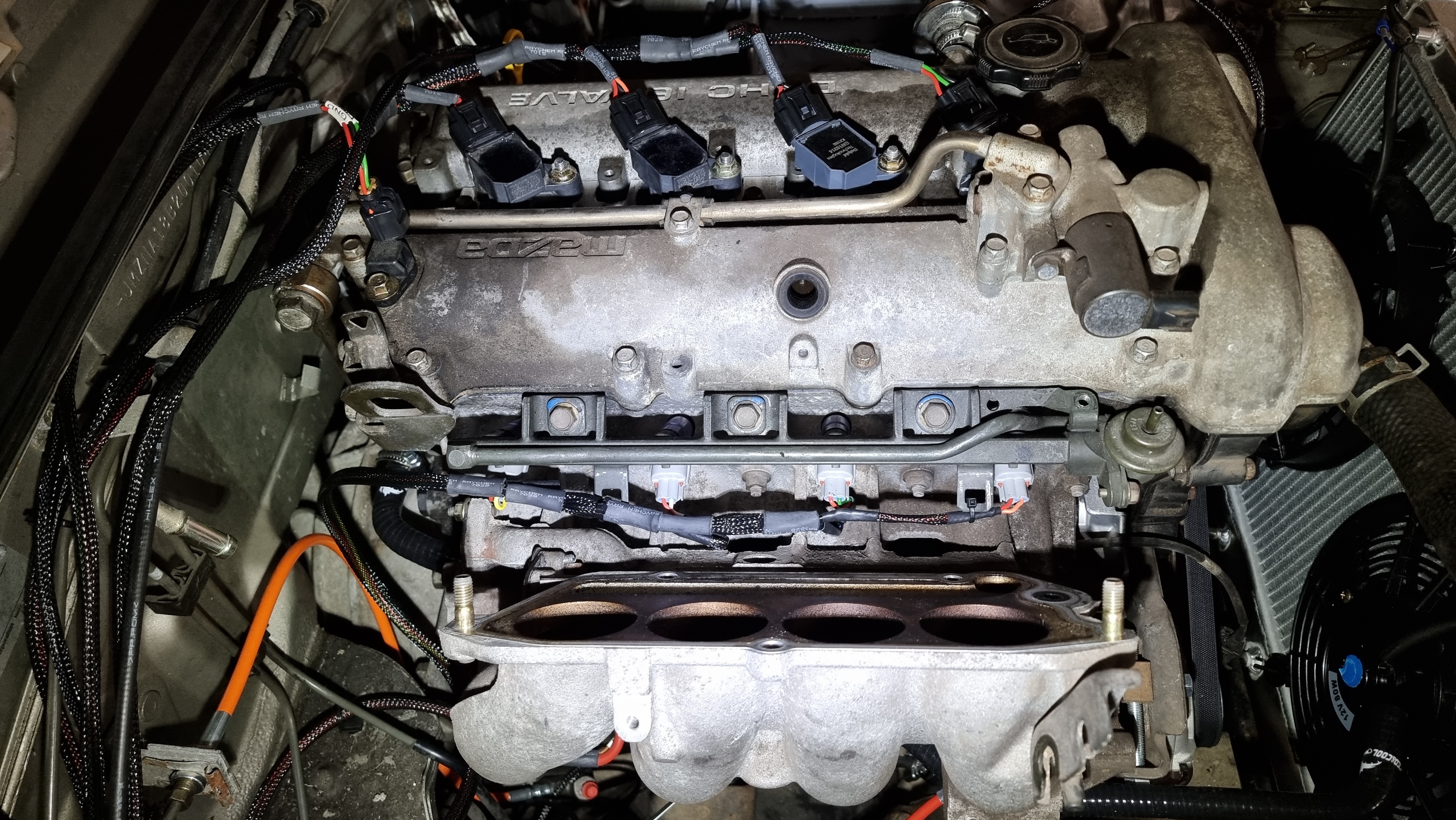J'ai récupéré mes injecteurs de nettoyage, ils ont été testés et sont quasiment équilibrés maintenant. j'en profite pour les remonter avec des joints neufs de chez Mazda  Puis je remonte le tout avec le rail de 1.8 NB  J'installe le faisceau injecteur  Puis je remonte le reste du collecteur d'admission, rebranche tous les connecteurs, essaye de faire un peu de cable management, je rebranche le cable d'accélérateur et j'en profite pour installer la sonde de température d'eau. J'ai également installé les différentes durites de dépression d'air  Puis il faut que je fasse un bypass de radiateur de chauffage, en effet je n'en ai pas dans la barquette, et il faut donc que je re-route le circuit d'eau en utilisant les durites OEM et un morceau de durite rigide que j'ai découpé  Et voilà  Puis, j'ai fait l'admission d'air, en réutilisant un vieux cone que j'avais et un coude réducteur  Le capteur de température d'air GM est cablé et installé également, ça devrait prendre de l'air frais là  Il me manque un petit morceau de durite qui va au brake booster (et il y a un clapet anti retour a l'intérieur), vidanger le réservoir, mettre de l'essence propre (elle a 5-6 ans celle qui est dans le réservoir) et semaine prochaine, je tente le premier démarrage.