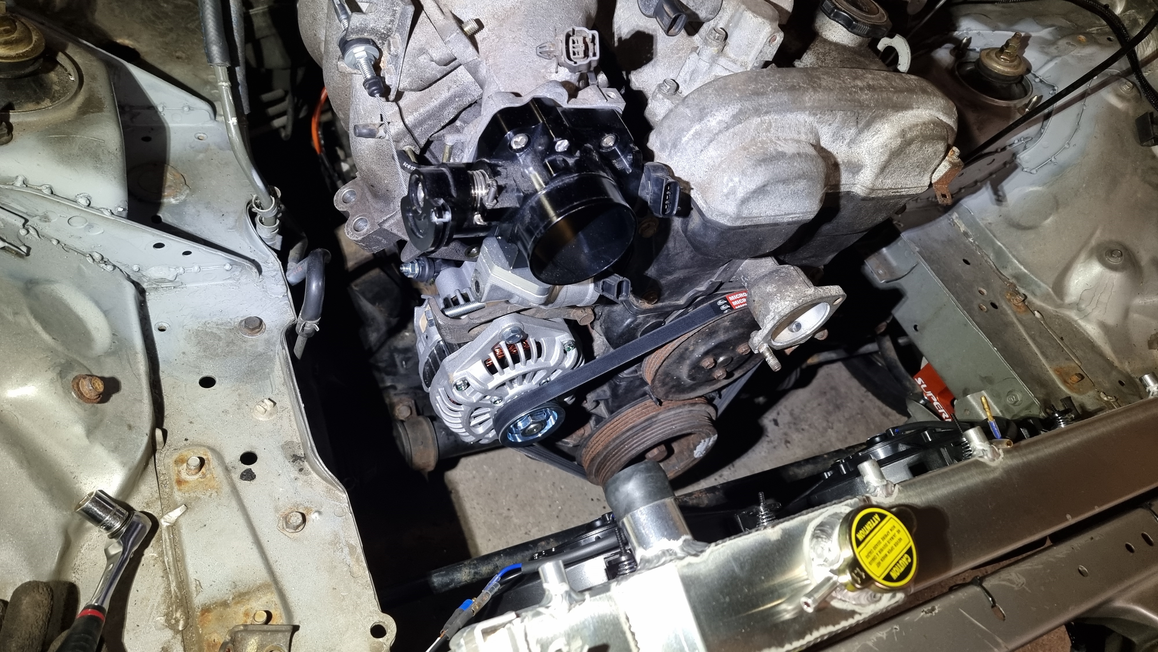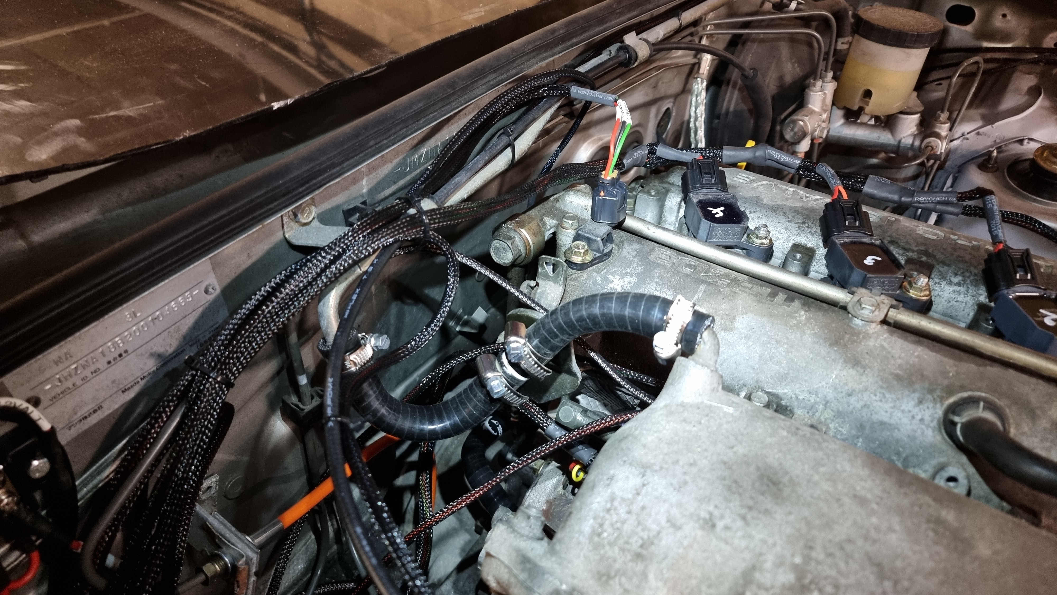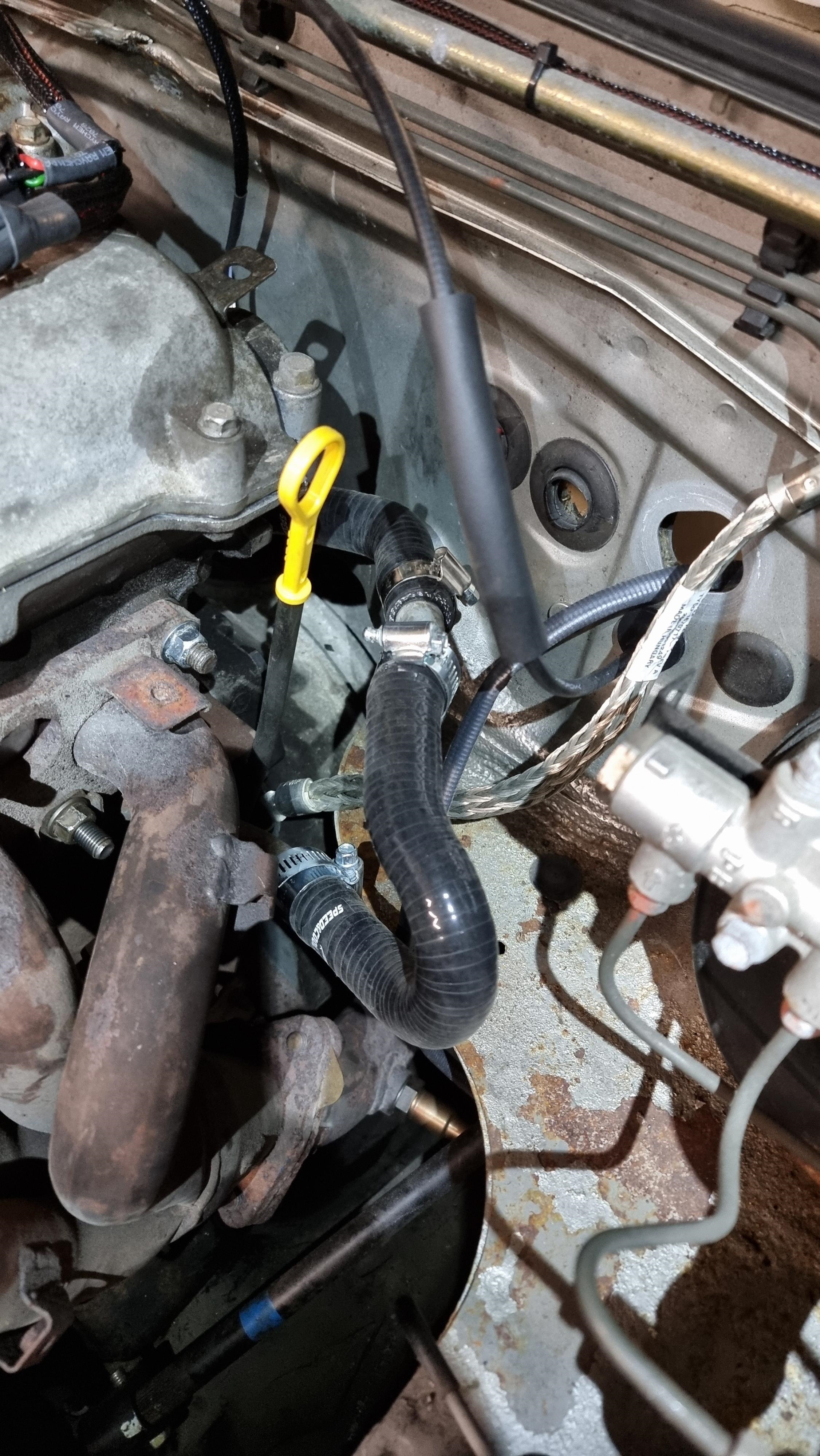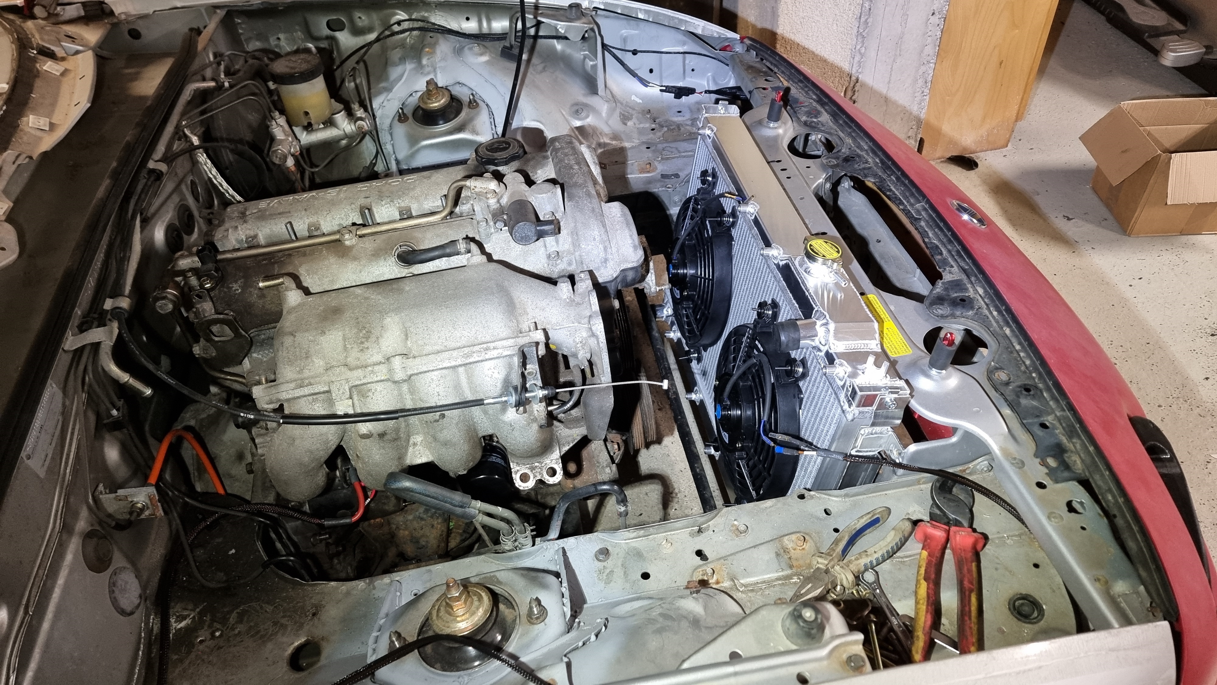 J'ai récupéré mes injecteurs de nettoyage, ils ont été testés et sont quasiment équilibrés maintenant. j'en profite pour les remonter avec des joints neufs de chez Mazda  Puis je remonte le tout avec le rail de 1.8 NB  J'installe le faisceau injecteur  Puis je remonte le reste du collecteur d'admission, rebranche tous les connecteurs, essaye de faire un peu de cable management, je rebranche le cable d'accélérateur et j'en profite pour installer la sonde de température d'eau. J'ai également installé les différentes durites de dépression d'air  Puis il faut que je fasse un bypass de radiateur de chauffage, en effet je n'en ai pas dans la barquette, et il faut donc que je re-route le circuit d'eau en utilisant les durites OEM et un morceau de durite rigide que j'ai découpé  Et voilà  Puis, j'ai fait l'admission d'air, en réutilisant un vieux cone que j'avais et un coude réducteur  Le capteur de température d'air GM est cablé et installé également, ça devrait prendre de l'air frais là  Il me manque un petit morceau de durite qui va au brake booster (et il y a un clapet anti retour a l'intérieur), vidanger le réservoir, mettre de l'essence propre (elle a 5-6 ans celle qui est dans le réservoir) et semaine prochaine, je tente le premier démarrage.