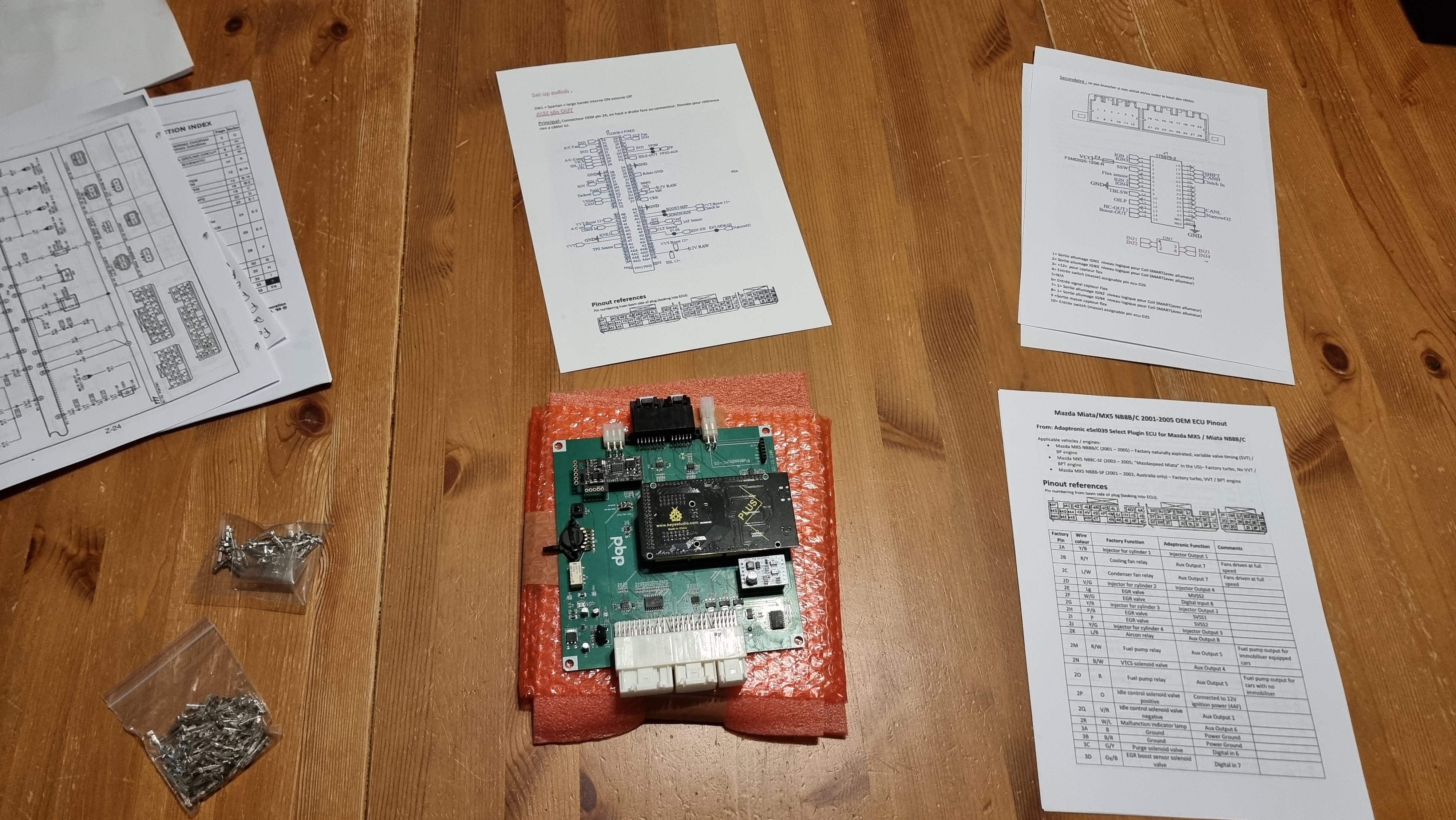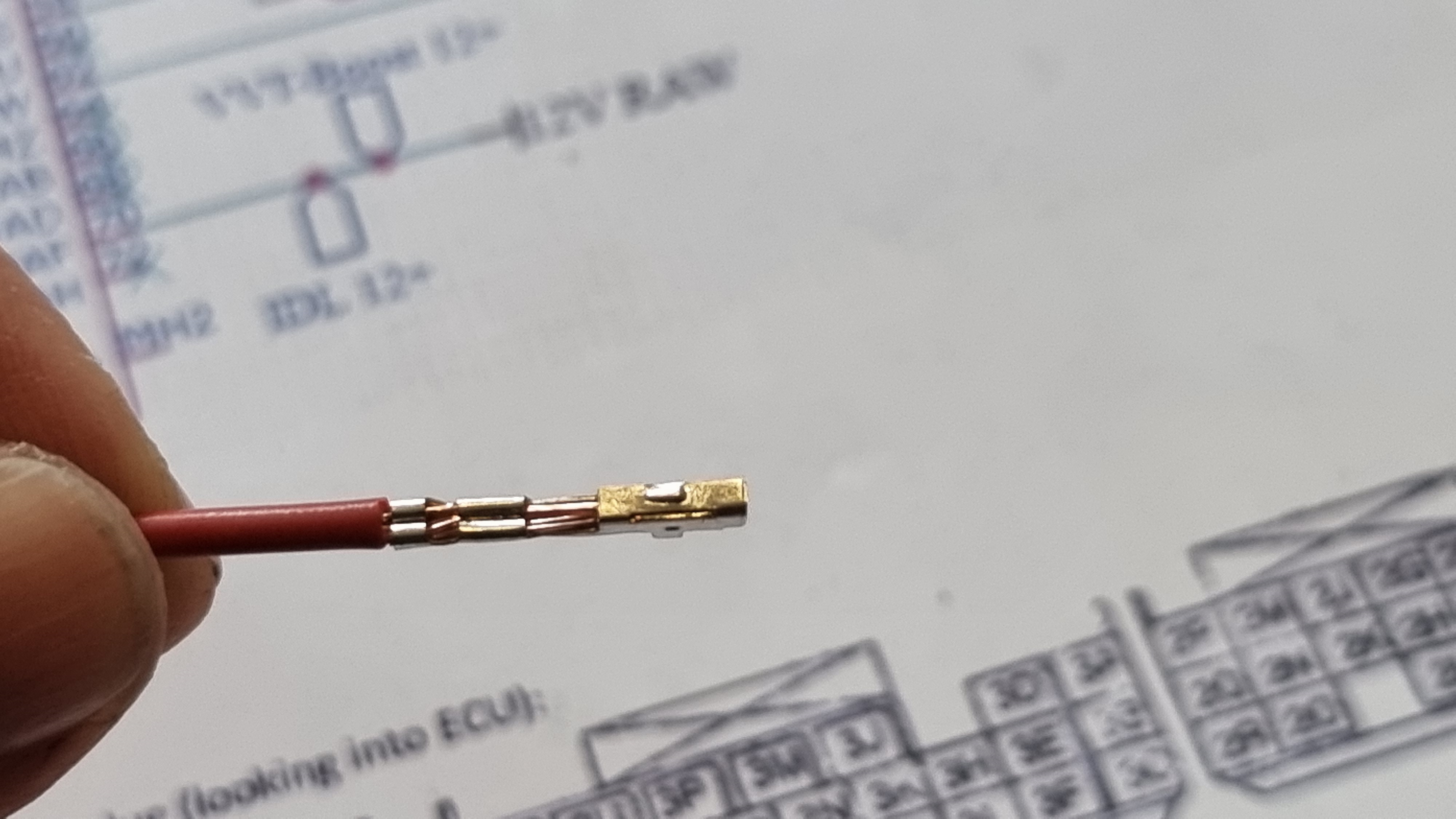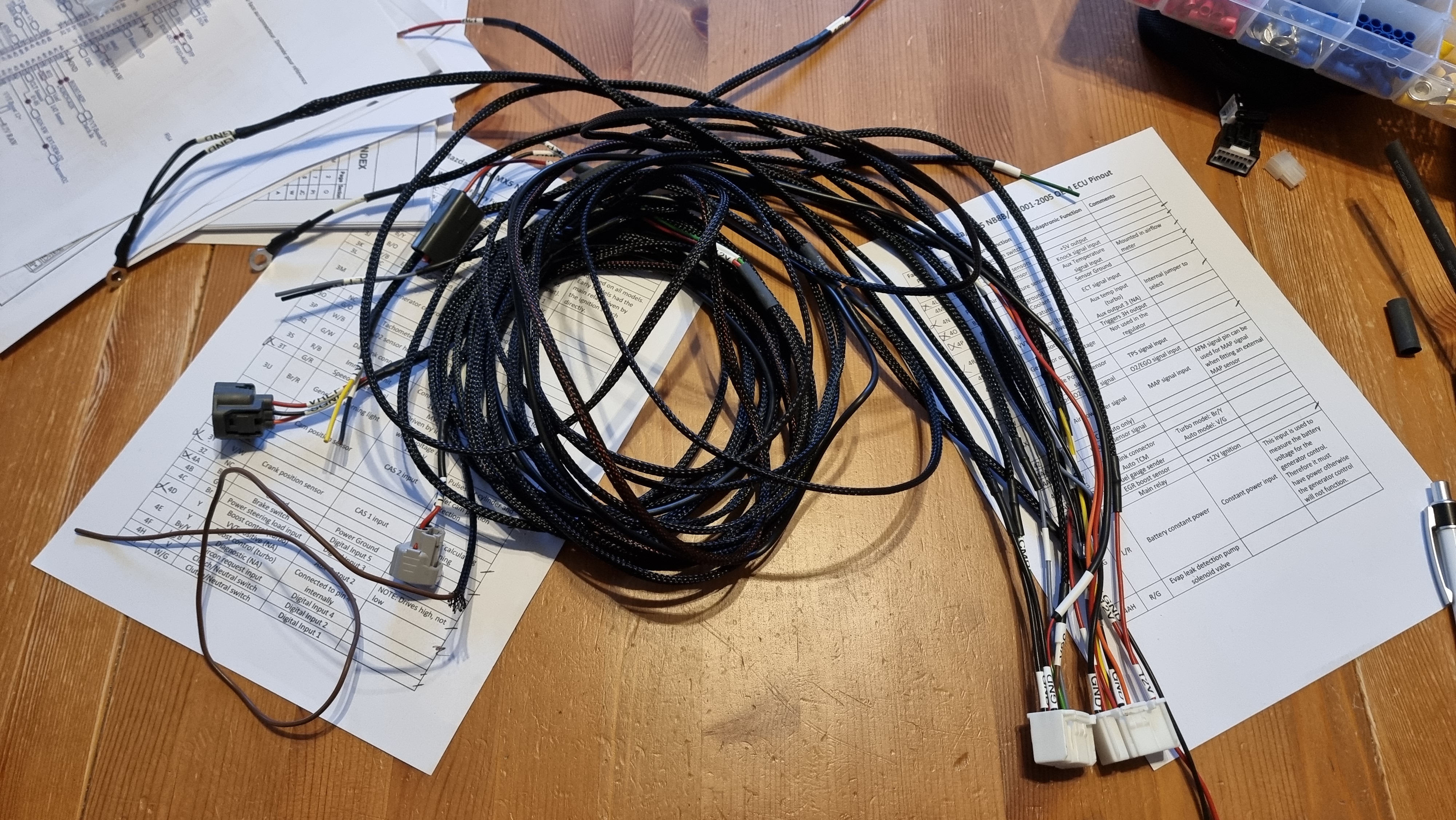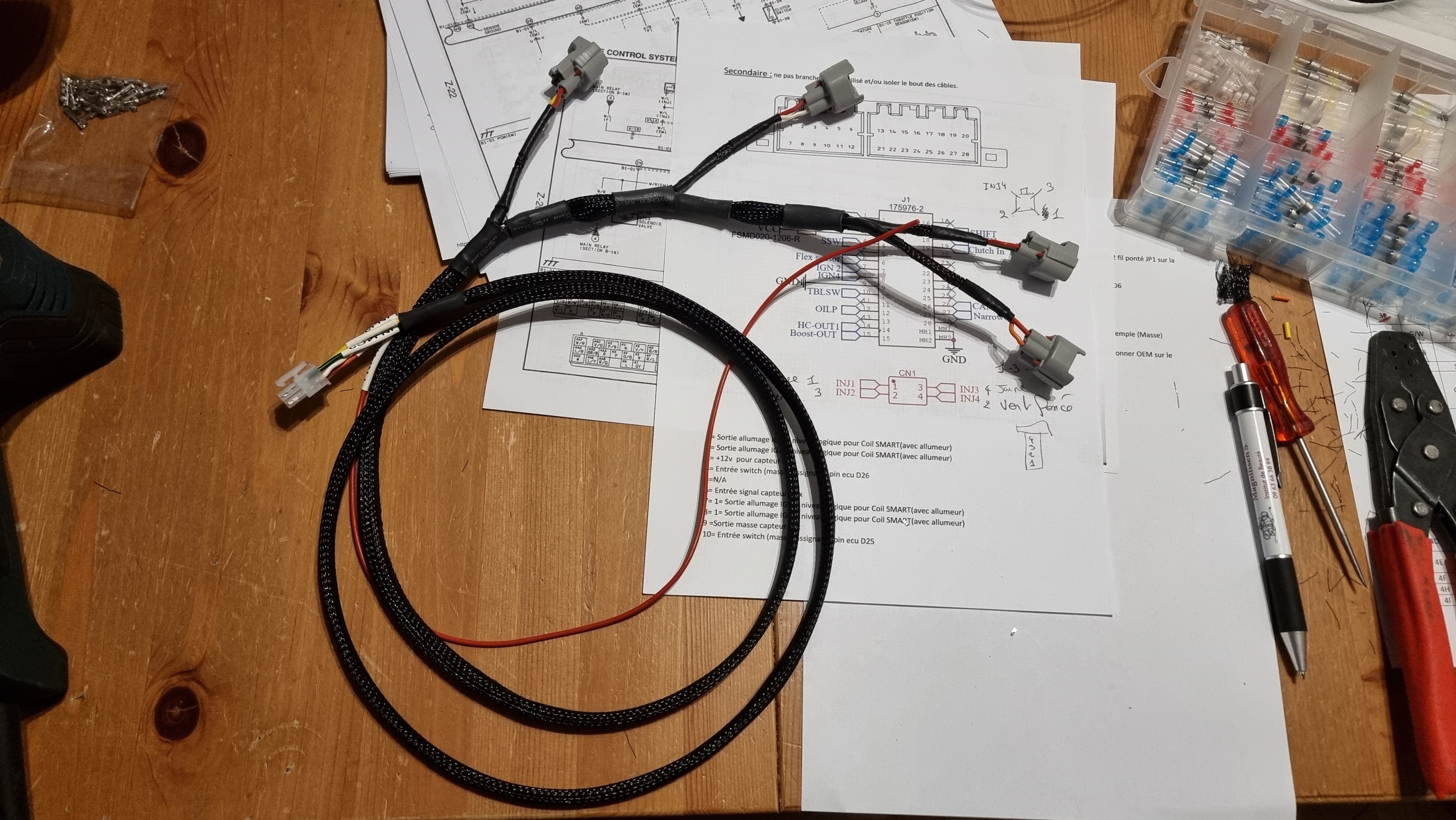 J'ai pas mal avancé sur la barquette ce we, j'ai commencé par un peu de mécanique, je n'avais pas installé l'alternateur de NA 1.8 (régulé en interne et non par la gestion, même si ma speeduino a le module qui va bien, ça reste plus simple)  Puis j'ai installé le capteur de position de vilebrequin neuf également  Le collecteur d'échappement ainsi que la sonde large bande, il me manque des goujons d'échappement, il y en avais seulement 3 sur le bloc, donc il m'en manque 6 et je n'en avais que 3 dans mon stock, à presque 10 balles pièce, ça fait chier, mais il faut.  Puis, j'ai passé mon WE a cabler le faisceau moteur, ce n'est pas si compliqué, il faut juste être minutieux et organisé, j'ai imprimé tous les schemas de cablage, fait une check list de ce dont j'ai besoin. Je me rends compte aussi que je commence a être un vieux, j'ai vraiment souffert de devoir sertir des cosses ridiculement petites, mais je m'en sors pas si mal, même avec une pince pas ultra haut de gamme (c'est celle vendue par DIYAutotune avec leurs kits)  Je pense que je vais peut etre investir dans des lunettes/loupes de précisions, on voit régulièrement Mario d'EMS avec ces lunettes quand il bosse sur un faisceau, je comprends pourquoi Coté connecteurs OEM, tout est cablé, j'ai pas encore forcément tous les connecteurs au bout, mais la partie cable est là, j'ai essayé de bien tout identifier et protéger  Ca donne ça au final  Puis je suis passé au faisceau injecteurs, je ne repars pas de l'OEM car il est cablé en semi sequentiel, les injecteurs injectent 2 par deux, je passe en full sequentiel donc il me faut 4 lignes pour piloter chaque injecteur. C'est relativement simple à faire, un 12V commun (que j'ai mis sur un relai a part sur mon panel) et un ligne de signal relié à l'ECU. Attention le cablage sur l'ECU n'est pas fait en fonction du numéro de cylindre mais de firing order. Donc INJ2 c'est pas l'injecteur du cylindre numéro 2, c'est l'injecteur qui injecte en second, dans notre cas le cylindre 3 car le firing order est 1-3-4-2 sur une NA/NB.  Une fois serti avec les connecteurs neufs et protégé, cela donne ça (j'en suis assez satisfait, le dernier que j'avais fait ressemblait à rien)  Puis, comme l'ECU ne rentre pas dans le boitier OEM (j'ai un ecu pour nbfl dans un boitier OEM de NA), j'ai modélisé et imprimé en 3D un boitier pour la speeduino, cela permettra en plus d'isoler le boitier   Je vous passe sur l'installation du faisceau, le début de cable management (ça prends du temps et je ne peux pas tout fixer car j'ai pas encore 100% du faisceau), et on branche la speeduino  Et j'allume le relai qui pilote l'ECU, la speeduino démarre, TunerStudio se connecte, j'ai calibré le TPS et il réagit correctement, donc le cablage est OK.  Il me manque pas mal de connecteurs (IAT, CLT, CMP, VSS) ainsi que le connecteur qui se fixe sur la pompe a essence ainsi que celui qui va sur l'alternateur, c'est commandé chez Ballenger Motorsport, mais ça vient des US, donc ça prends son temps. J'ai le faisceau allumage pour les bobines COP de Toyota a faire, mes injecteurs sont aussi en cours de nettoyage, il me reste a finir le circuit d'essence, celui de LDR, faire une mini admission, et c'est pas loin de craquer.