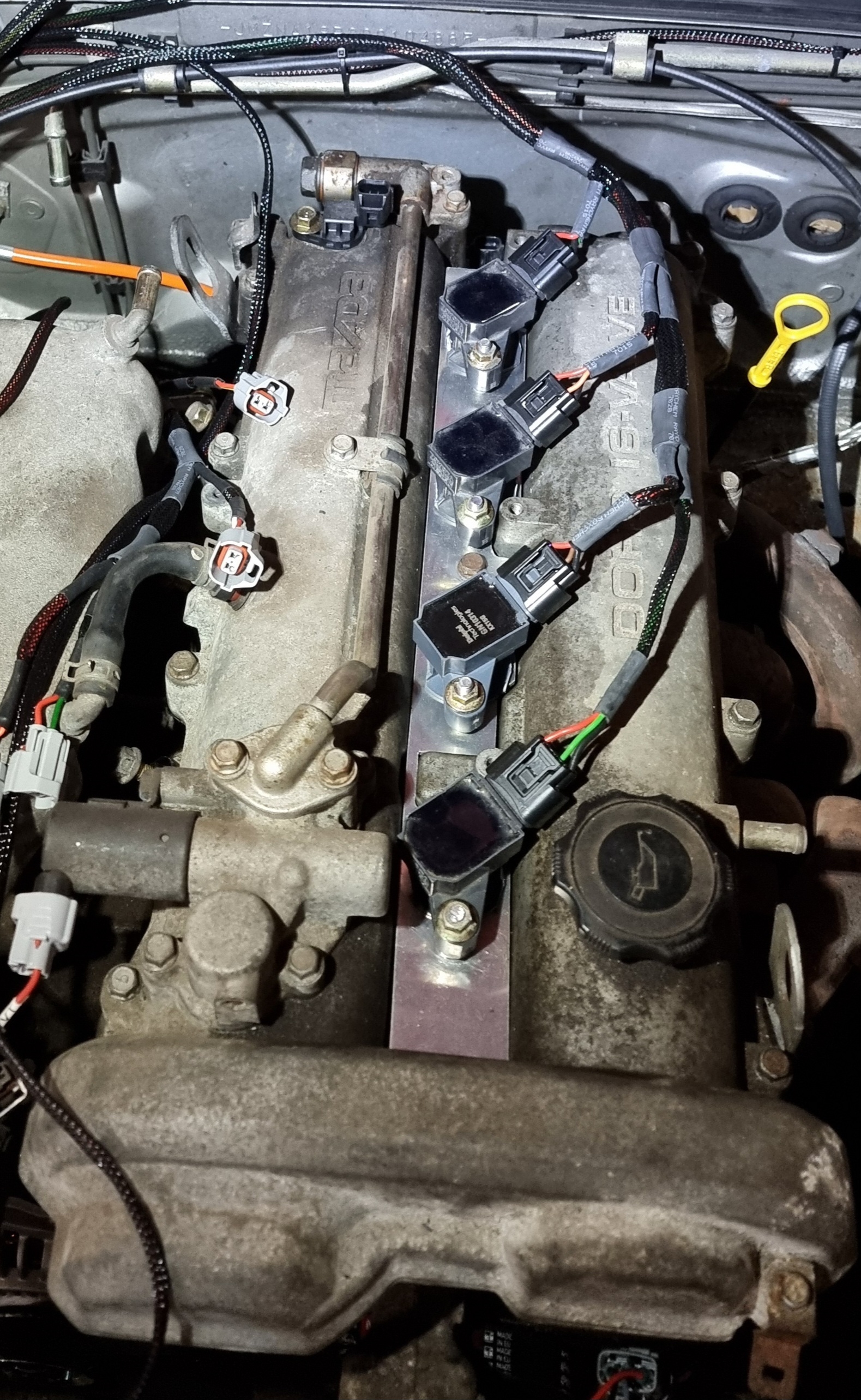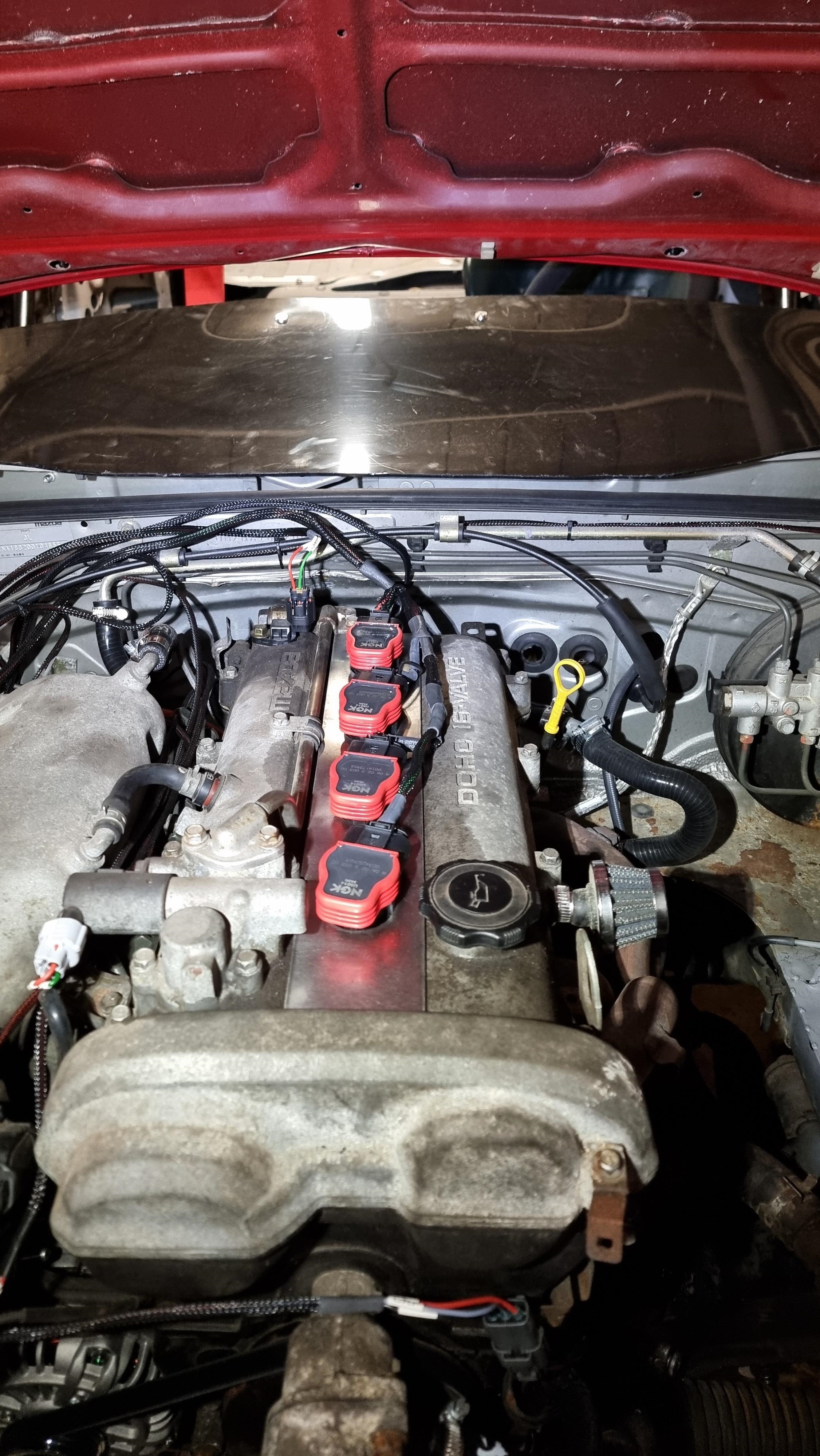 Ayant reçu une première livraison de connecteurs, j'ai pu terminer totalement le faisceau, la pompe a essence ainsi que l'alternateur sont cablés. Test de la pompe a essence concluant, pour tester l'alternateur il faudra attendre que le moteur tourne. J'ai également cablé tous les manos, installé les sondes qui manquaient, tous démarrent et affichent des valeurs cohérentes, a l'exception du oil pressure que je ne peux pas tester encore et le tach qui semble faire n'importe quoi, il faut que je regarde du coté de la sortie tach de la speeduino  Puis je suis passé aux bobines crayon, autant les bobines de toyota sont plug and play sur une moteur 1.6 ou 1.8 de na ou nb, sur un 1.8 de nbfl avec le vvt, ça ne l'est absolument pas. J'ai déjà passé presque 2h a poncer le corps du crayon pour réduire le diametre de celles-ci  Oui, on voit le métal, j'ai fait un test de continuité, ce n'est connecté a aucun pin, j'espere que c'est juste le corps de construction, au pire si je les ais flinguées je passe sur des bobines d'Audi R8, au moins c'est plug and play (bon faudra que je refasse les connecteurs) Il faut également limer la tête pour que cela rentre dans le cache culbu  Après pas mal d'efforts, ça rentre et tout est bien fixé.  J'ai également réinstallé une partie des durites de circuit d'eau, je dois recevoir encore quelques derniers connecteurs, je récupère mes injecteurs du nettoyage dans la semaine et je suis aussi en attente de quelques durites silicone d'admission pour faire l'admi, bref on est pas loin.