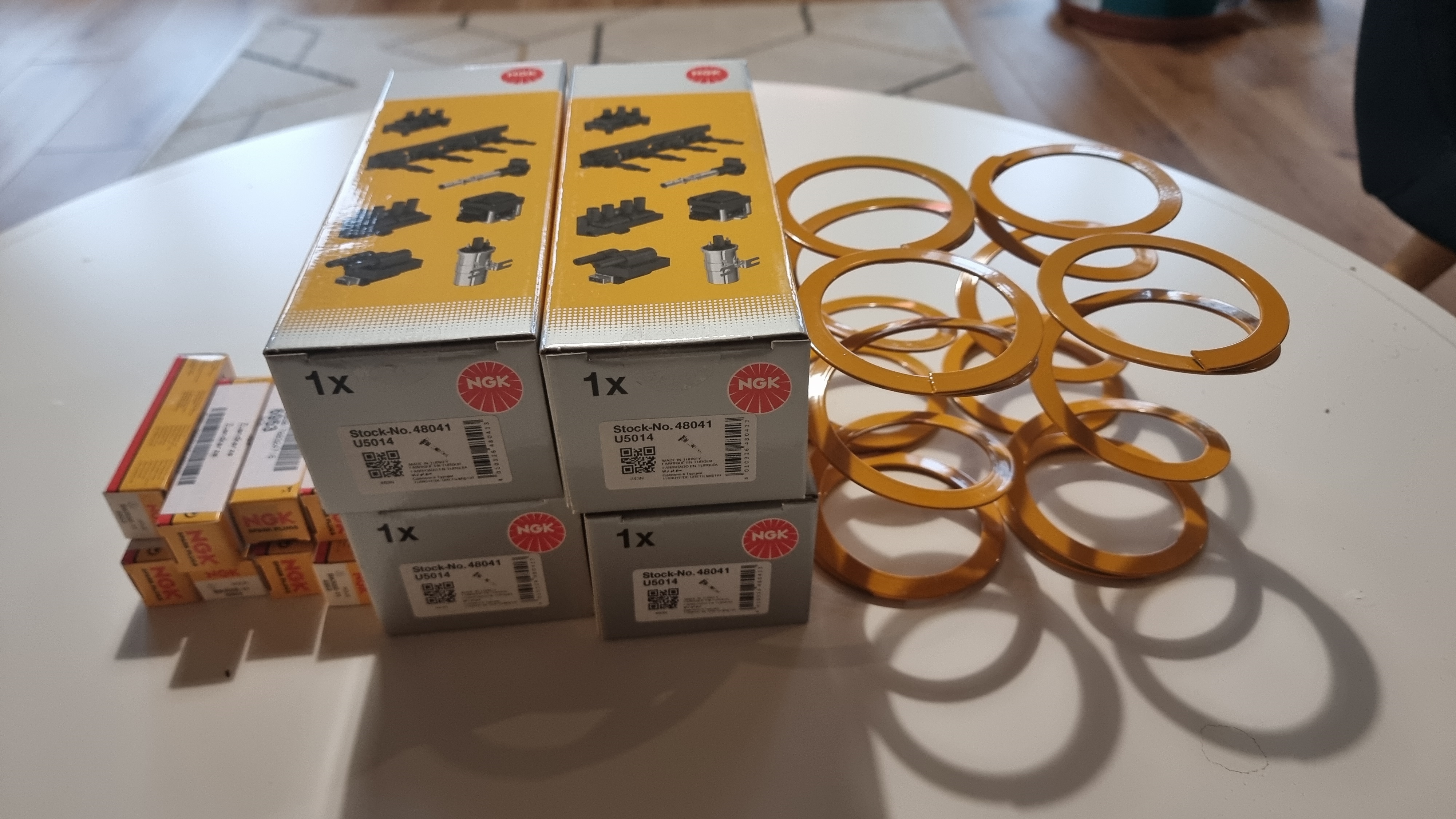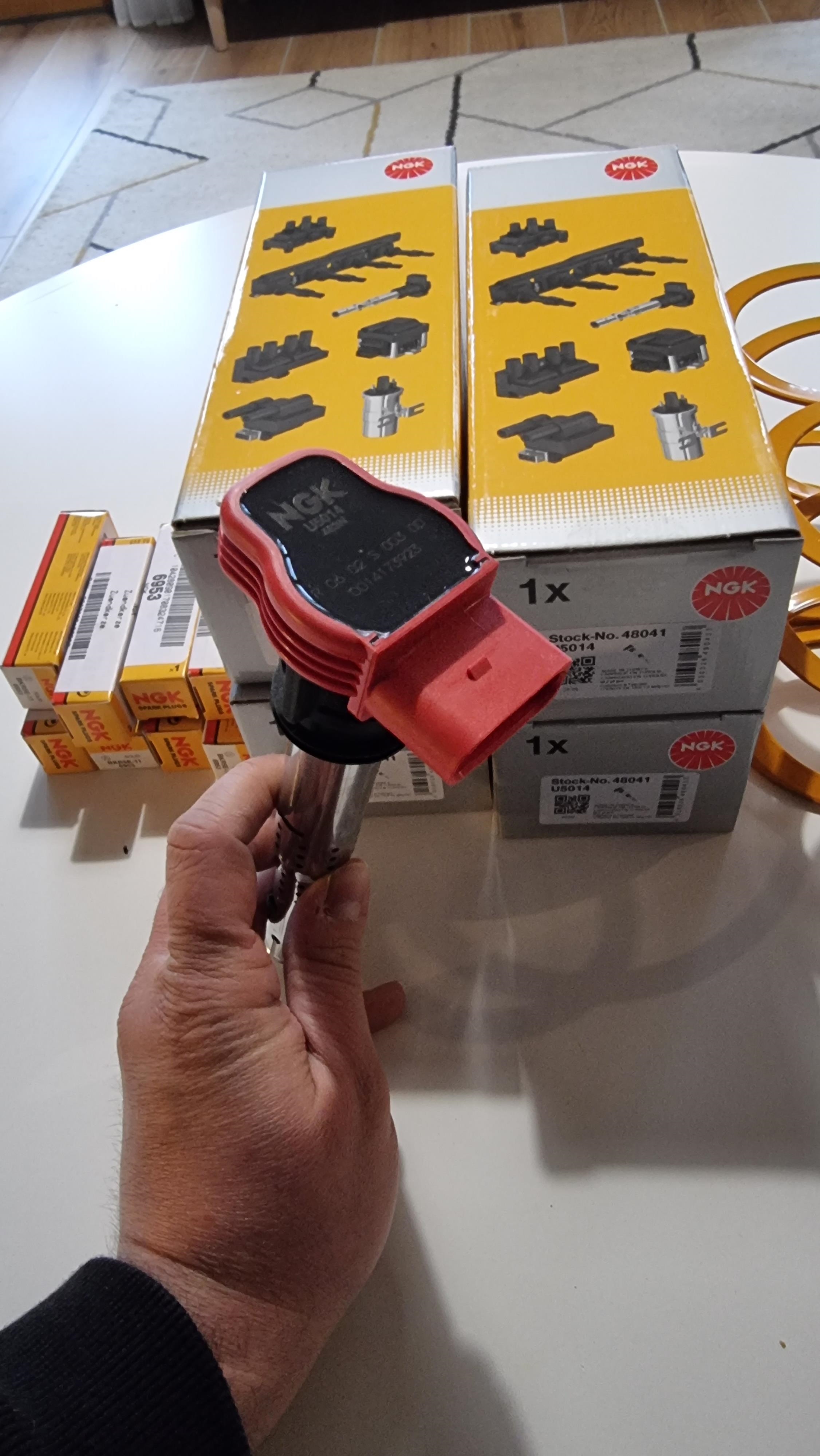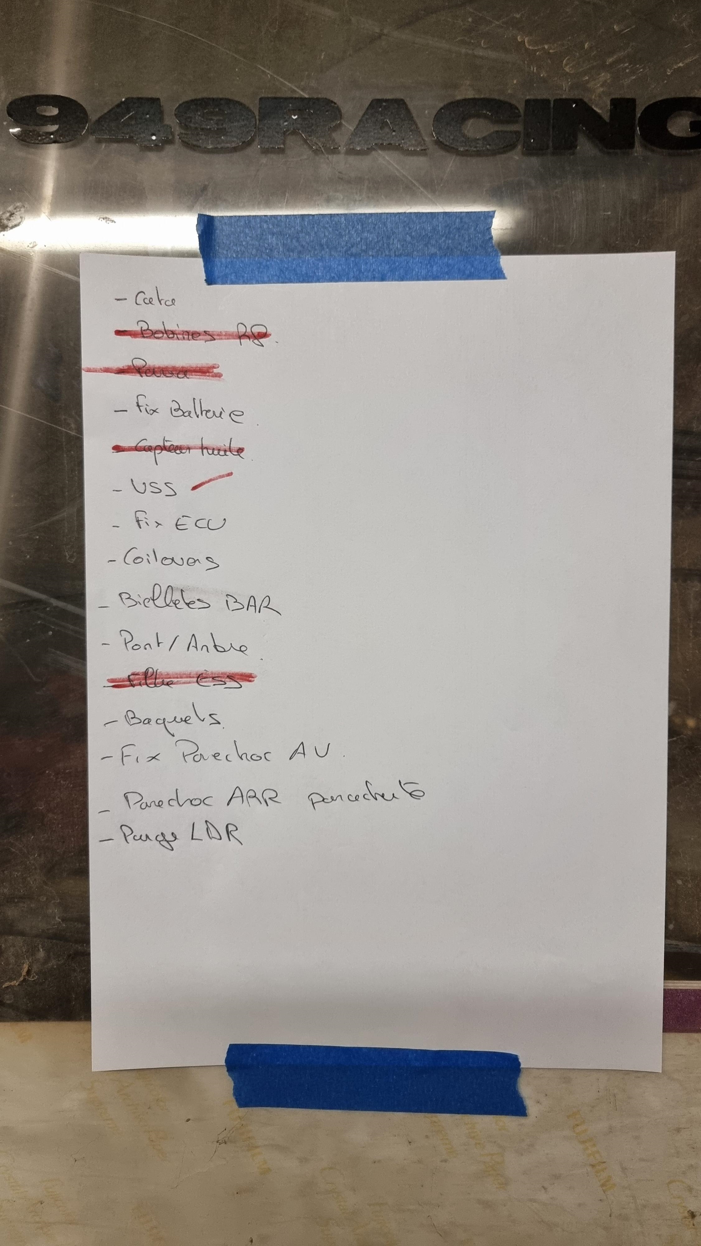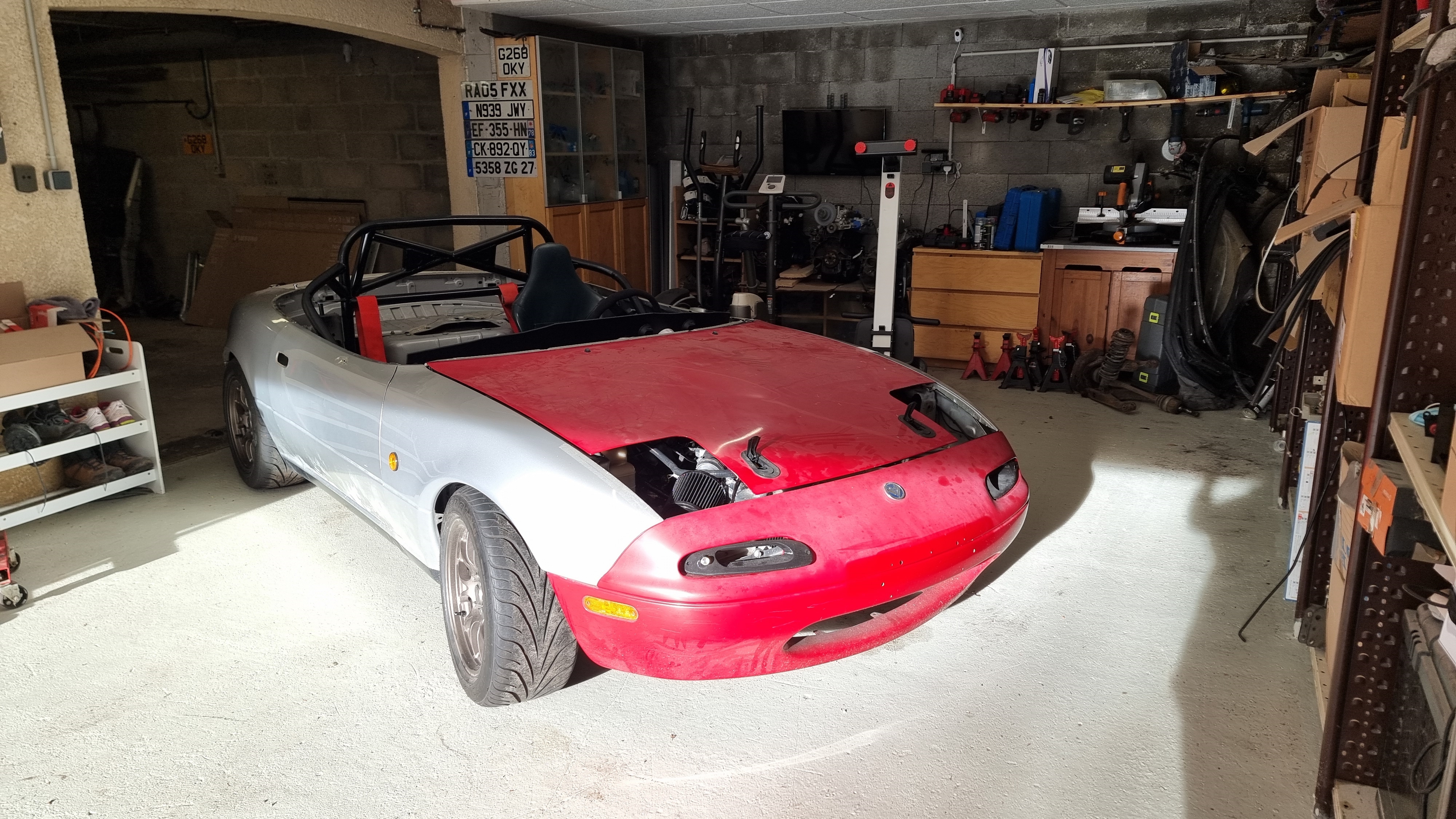 J'ai essayé de me faire une liste des différentes choses qu'il me reste à, globalement j'ai un mois avant mon premier roulage :  Pour le cata, finalement je ne vais pas le faire maison, j'ai mesuré avec le cata percé que j'ai de l'autre mx5, il est à la bonne taille, donc j'ai commandé un vrai bypass de cata qui va arriver dans la semaine. C'est un peu de temps d'économisé. J'ai également changé le filtre a essence pour un neuf Puis j'ai fixé la partie haut du tableau de bord, ça ne bouge plus  J'ai aussi installé la durite qui va du brake booster au collecteur d'admission, avec un clapet anti retour  Puis j'ai reçu une partie de mes commandes, bobines d'Audi R8 en NGK neuf, des bougies neuves, et les helper springs   J'ai donc installé la plaque de fixation spécifique pour les bobines de R8, les bobines sont bien mieux ajustées  J'ai refait la connectique, un peu plus galère que les autres surtout que les connecteurs venaient en paquet de 4 directement, sans aucun pins de rechange, c'est un peu abusé, d'habitude par connecteur tu as un pin supplémentaire au moins de spare, la rien et habituellement je commande toujours un ou deux connecteurs en plus au cas ou, ben la non, j'ai un peu transpiré sur certains connecteurs mais ça l'a fait  J'ai modifié les paramètres de Dwell dans la gestion, il faut dwell entre 1,8 et 2.2 ms sur ces bobines et ne pas dépasser 2,5 car sinon elles commencent à fondre. Puis j'ai levé la voiture pour améliorer un peu le para "a vue d'oeil" déjà pour manoeuvrer plus facilement la voiture, et il faut que je passe au démontage des amortisseurs car on voit ici mon problème lorsque la roue n'est plus posée au sol  Le ressort est tellement court et bas que le ressort n'est plus en contact avec la coupelle, et a la reprise d'appui il peut se mettre de travers et abimer la tige de l'amortisseur. Dans ce cas le setup avec helper springs est très fortement conseillé. Maleurheusement, Merlin motorsport n'a pas en stock le spacer qui va entre le ressort normal et le helper spring, ils devraient le recevoir semaine prochaine. J'ai également voulu finir de fixer le pont a l'arbre de transmission, mais je me suis rendu compte que les vis que m'a fourni autolink ne sont pas les bonnes, elles touchent un rebord sur le nez de pont. Donc obligé de commander en urgence les 4 vis neuves chez ilm, en espérant que ça arrive dans la semaine. Car malgrès tout ça, il faut aussi que j'arrive a booker une date pour la géométrie avant le 25 Mars....