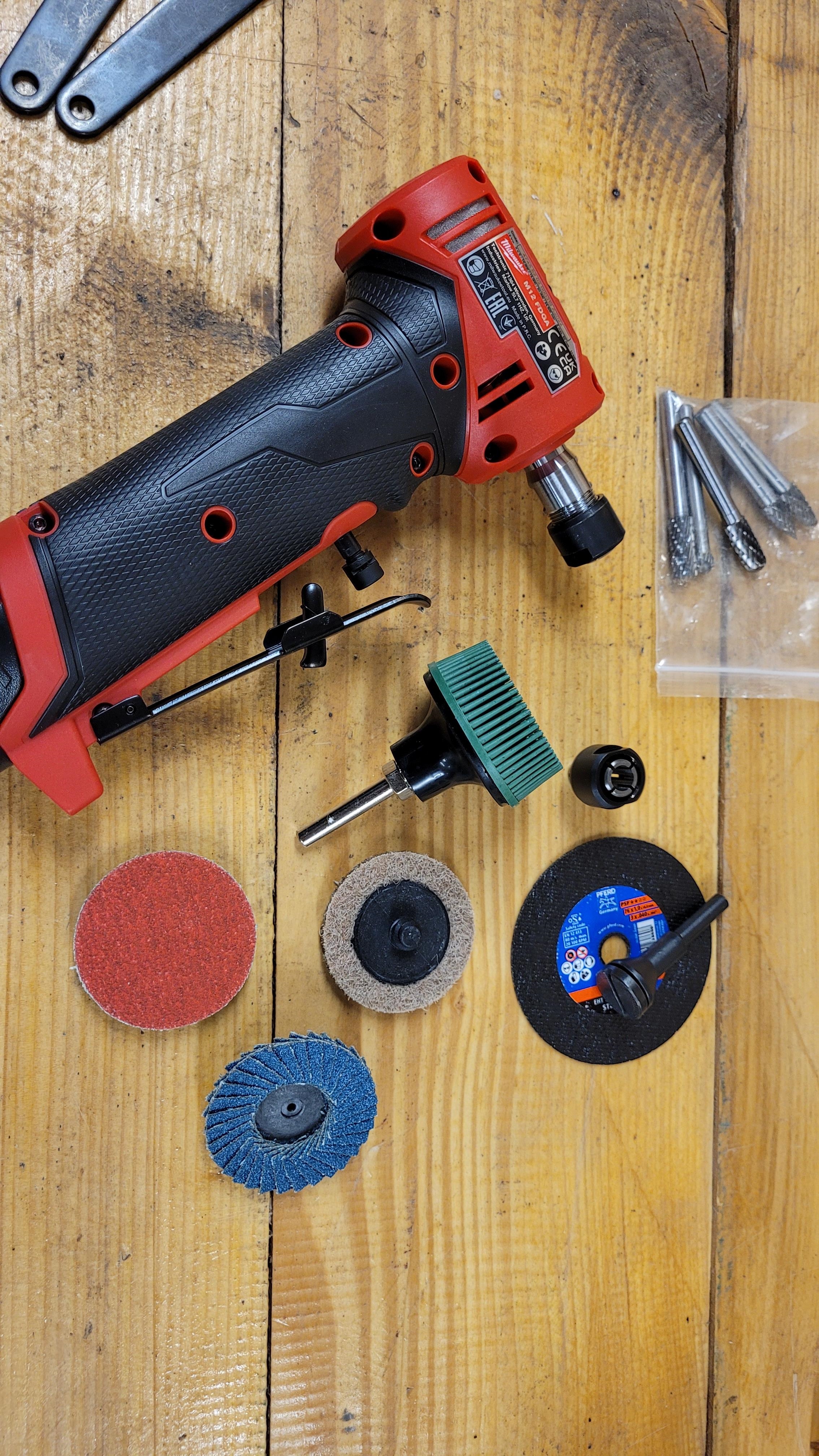 En préparation des travaux de carrosserie j'ai deux autres outils pneumatiques qui viennent d'arriver, déjà le traditionnel burin pneumatique  Super pratique, pour démonter, pour virer la rouille et ça coûte 40 euros. Et en plus une meuleuse droite de précision, pour couper du châssis proprement   Ça prends des disques de 75mm, qui du coup partent assez vite, donc j'ai fait un petit stock.