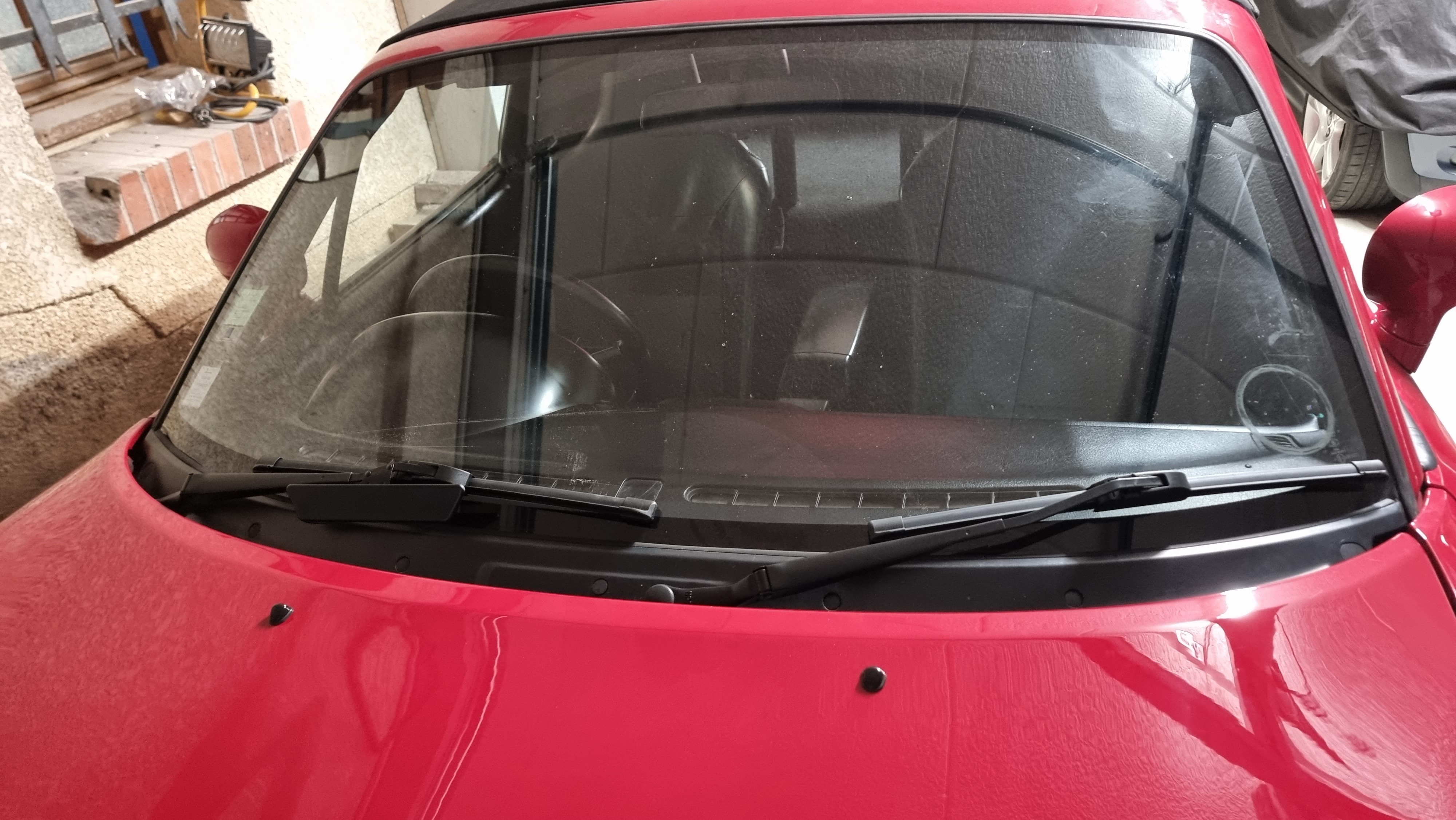 Install de la capote neuve sur Flash, il me restait le bandeau avant a finir de fixer, je ne l'avais pas fait car il faut coller et il est conseillé d'installer la capote juste après.  On remet la capote sur les fixations sur la voiture avec le fiston, petit moment stressant pour éviter de rayer la voiture toute neuve  Puis la partie un peu pénible, il faut passer la capote dans les tiges filetées qui dépassent, puis on replie le rain rail par dessus et il faut ensuite mettre les 3 rails en métal, le tout sur 12 tiges filetées. La méthode la plus simple est de replier le rain rail et le faire tenir par ses écrous, puis petit à petit installer les 3 rails en dévissant et remettant les écrous. C'est long mais ça se fait. En n'oubliant pas de fixer les deux sangles de rappel.  Puis on serre les écrous en respectant l'ordre précis pour que la capote soit bien tendue et qu elle n'ai pas de faux plis Test de fermeture de la capote, c'est parfait la vitre en verre se replie parfaitement  Maintenant, le moment vraiment pénible la fermeture de la capote pour la première fois. Il faut commencer par dévisser au max les crochets pour qu'ils soient le plus lâche possible.  Et la, ben c'est la merde, c'est normal, mais c'est la merde. Le tissus est volontairement très serré et limite trop petit, pour que la capote soit vraiment bien tendue et qu'elle ne floppe pas en roulant. Ok sauf qu'il manque bien 5 cm là pour fermer... On y passe 1h avec mon fils, on a utilisé la méthode de la sangle pour essayer au max de fermer  On en a grave chié mais a un moment on a réussi, la capote est super tendue, ajustement parfait pas le moindre faux plis je suis méga content  Je vais devoir laisser la voiture capote fermée pendant deux bonnes semaines pour que le tissus prenne bien la forme, idéalement en plein soleil (je pense que j ai choisi la bonne période) et fermer légèrement au fur et mesure les crochets pour que le joint soit parfaitement recouvert Je suis passé par la suite à la fin du remontage de l'intérieur et du coffre   Il me reste un grand nettoyage a faire, installer les plaques, contrôle technique et géométrie et ce sera terminé.