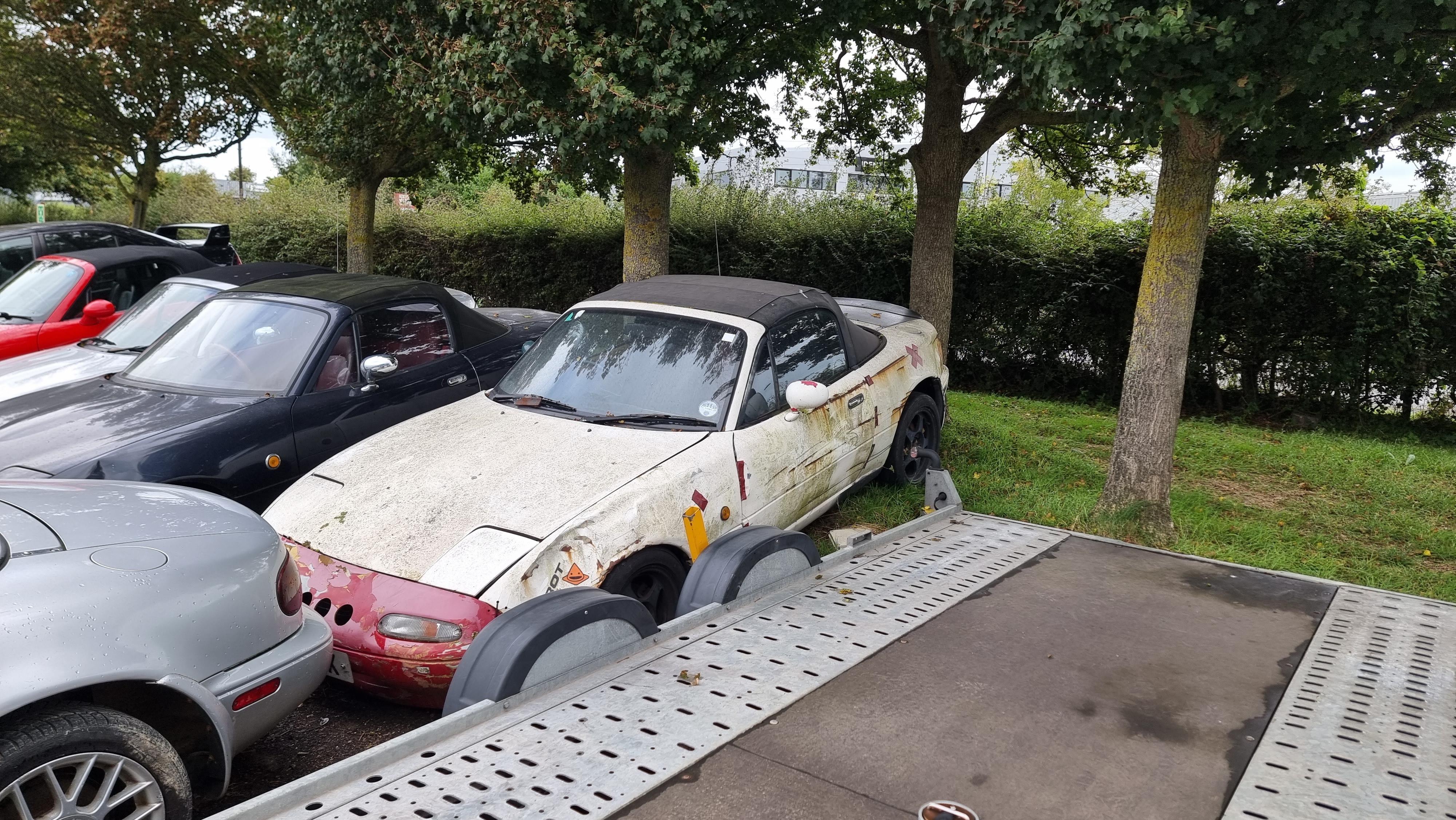 Voilà donc le plancher gravement endommagé motif de refus au CT   Oui c'est tordu et rouillé, mais franchement toutes les mx5 sont frottées a cet endroit, c'est le fusible pour les dos d'âne un peu bas. Bref, faut que ce soit propre, donc je vais acheter une pièce de refabrication chez the mx5 restorer, qui va donc aussi être sur mon itinéraire fin septembre quand j'irai en UK.  J'ai déjà envoyé les photos au carrossier, il me confirme qu'il me fais ça sans soucis en octobre, et me confirme qu'il a déjà vu bien pire passer le CT... Bref, au moins elle sera propre et pour longtemps. Du coup j'ai corrigé les autres soucis, installation de la goupille manquante  Réglage des phares  J'en ai profité pour lui faire une vidange, ajouter les déflecteurs de capot que j avais enlevé pour la peinture  La capote s'ouvre parfaitement et se plie bien derrière l'arceau. Elle est encore un peu dure a fermer cependant  Puis je suis allé faire un tour top down pour tester si ça va mieux depuis que j'ai viré la flotte dans les puits de bougies. Ben carrément, la voiture a plus la patate, elle tournait en fait pas terrible quand je suis allé au CT, peut être pour ça aussi qu'elle a raté la pollution. Faut que je booke la géométrie et que je récupère les 6UL sur lesquels je mettrai des Michelin PS3, c'est a peut près le seul truc en pneu route sport encore dispo en 195/50/15 sans aller sur du pneu UHP. Mais grosse banane de pouvoir enfin rouler a nouveau sur la route sans serrer les fesses de pas avoir le CT. Le tour du pâté de maison je j'avais prévu s'est transformé en 25 minutes, faut pas que j'abuse non plus, je suis en train de flinguer les pneus avec la géo aux fraises, et j ai prévu de finir ces pneus là sur circuit avec la barquette.