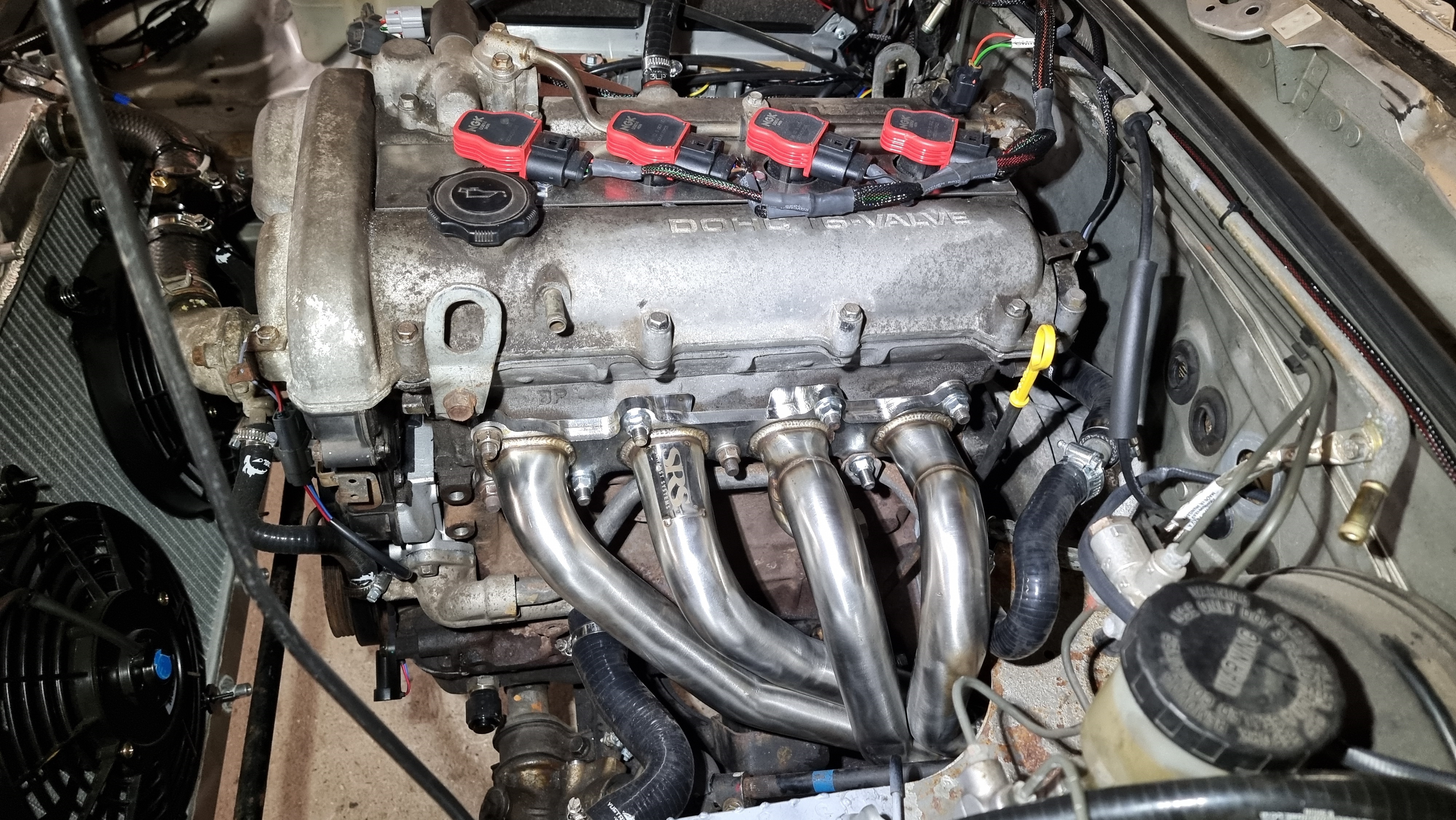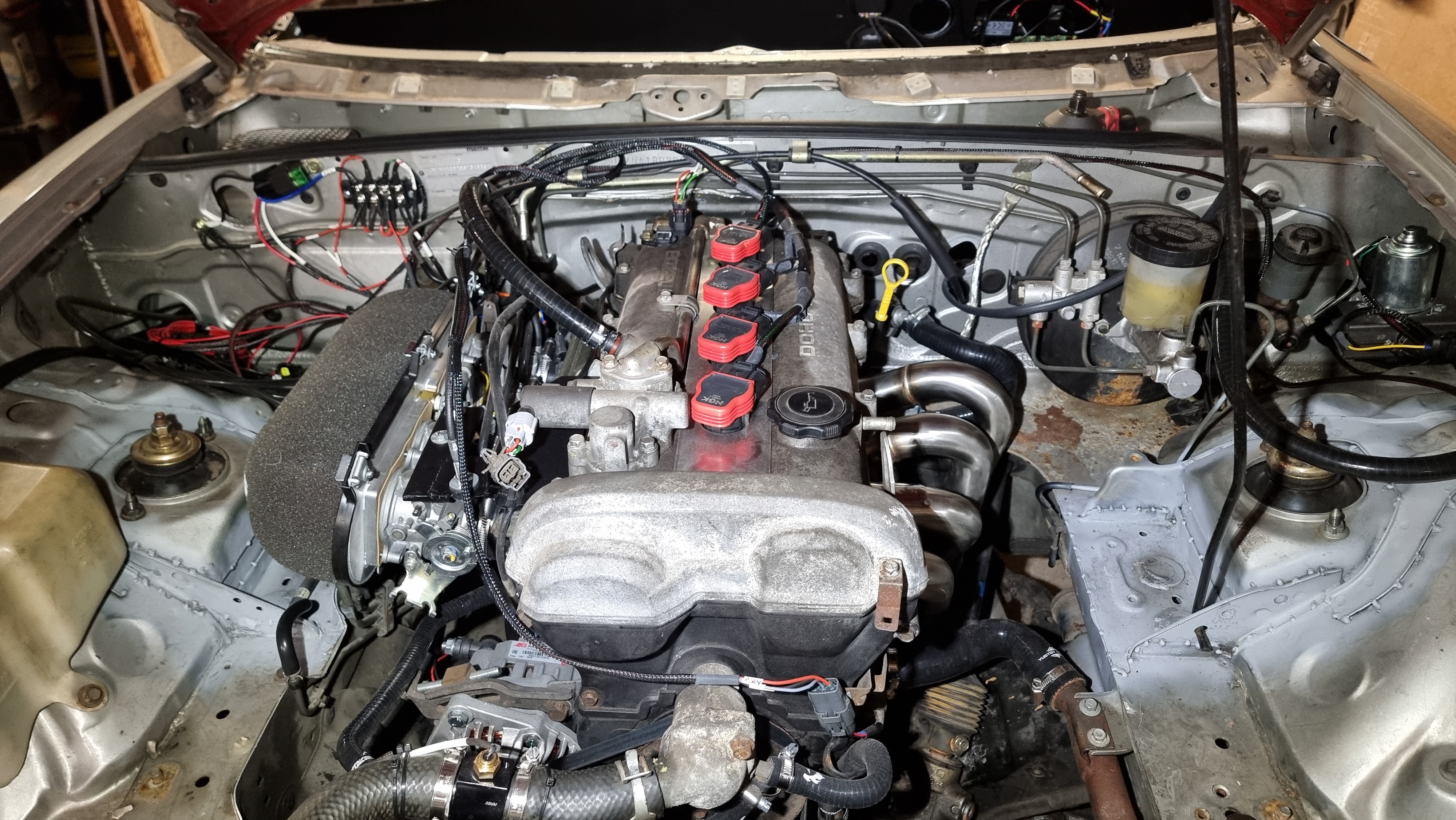 Aujourd'hui, ben c'est l'heure de vérité, on va voir si ça démarre avec une carto switchée en alpha N, je fais un peu de néttoyage et de rangement dans la baie moteur car il faut que je sorte la voiture du garage (avec pente a 25% donc il me faut un moteur qui ne boite pas trop)