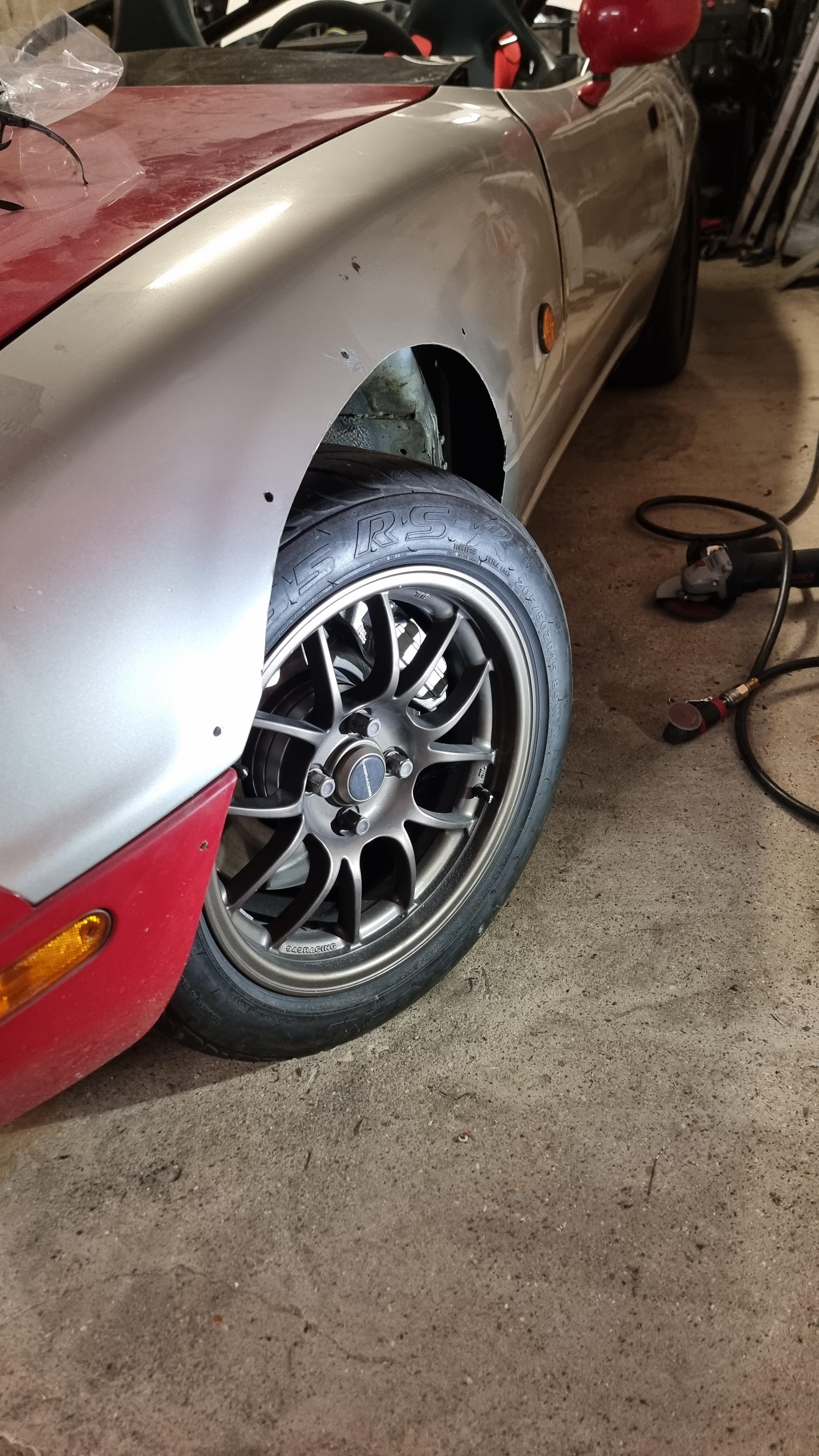 J'avais installé un seul fender coté avant conducteur, je passe a l'arrière, la voiture est maintenant équipée de cales +25mm derrière, je commence par positionner les fender avec les cleco