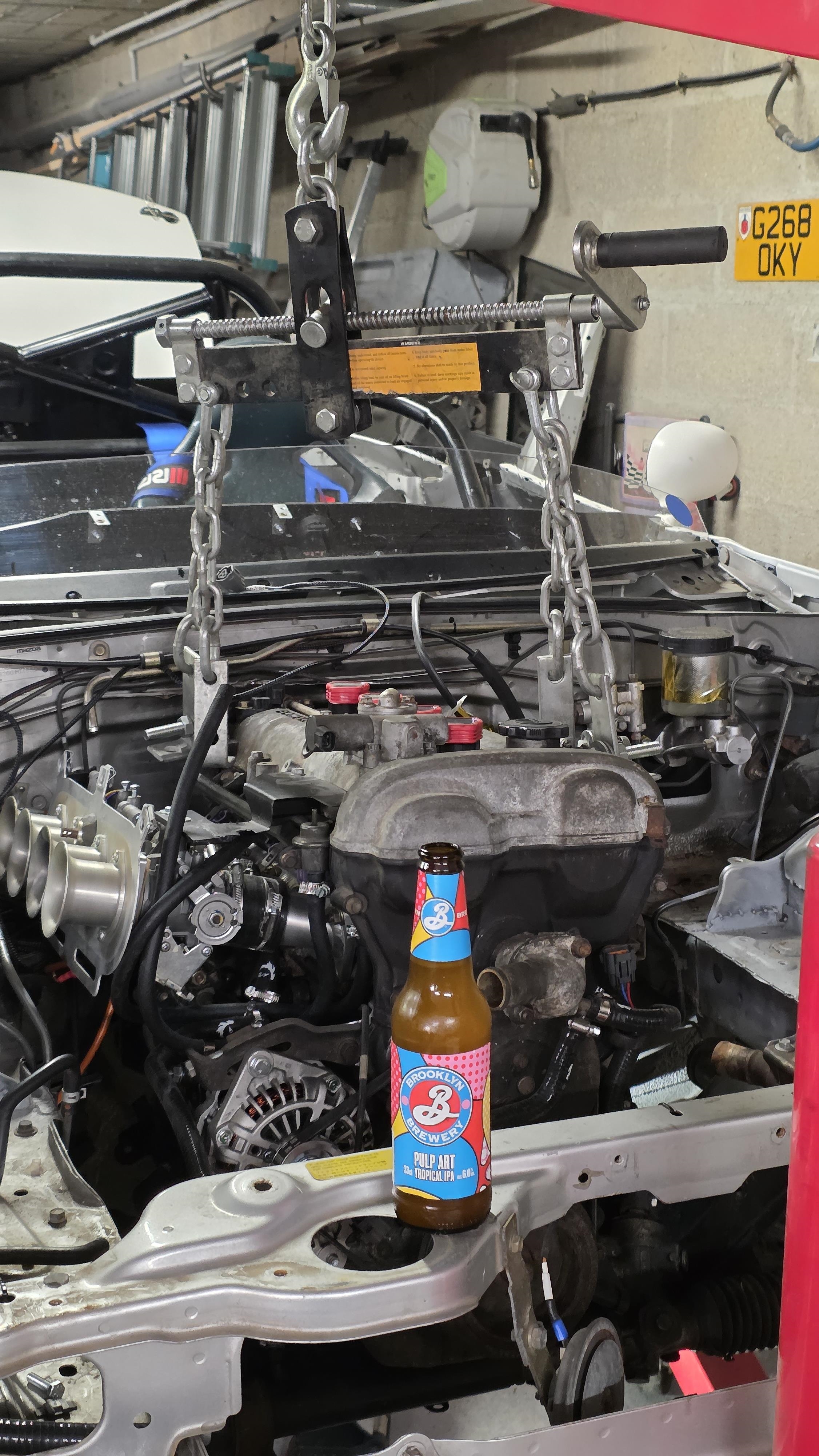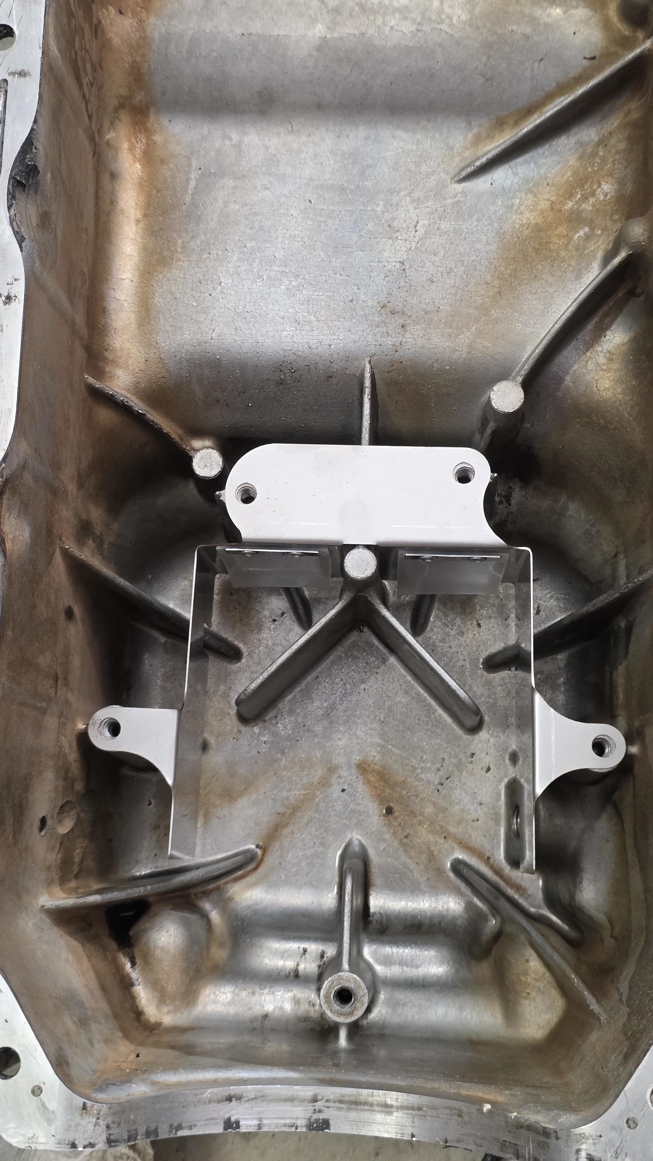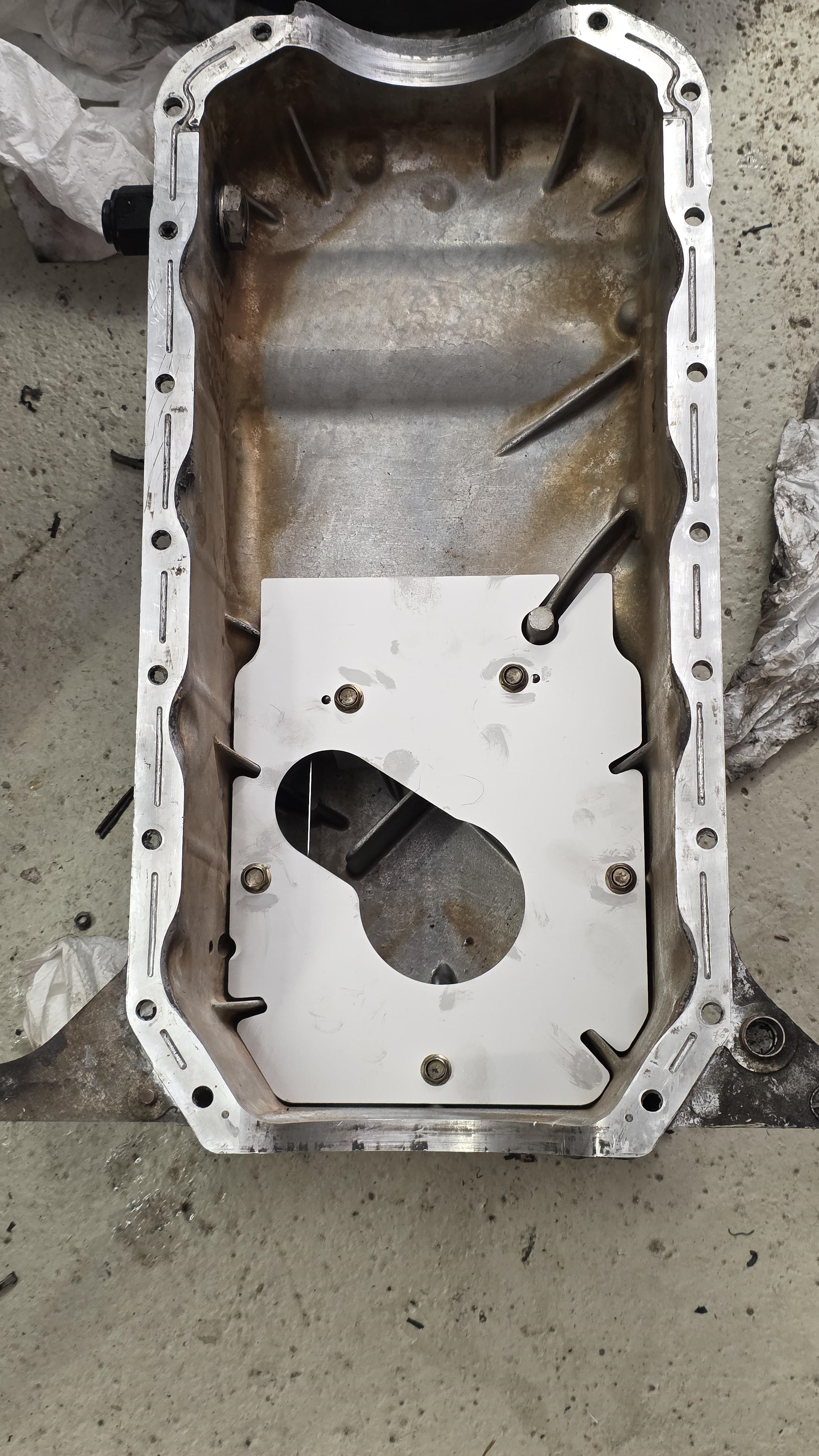 Ce Samedi, avec felinkinkin, c'était opération carter cloisonné. Donc on commence par sortir le moteur, moins de 1h pour tout débrancher et démonter, vu que la voiture a été remontée y a moins de 2 ans, tout viens très facilement. On enleve meme pas le collecteur d'admission, ni d'échappement.  Le faisceau electrique simplifié facilite aussi bien la tache, comme le fait qu'il n'y ait que le strict minimum.  Une fois le moteur sorti, on enlève le carter, on voit la plaque anti déjeaugeage OEM, pas de particules dans le carter, par contre une huile au fond bien sombre, sachant qu'elle n'a que deux sorties circuit, je me demande si a force de rouler un peu riche au début j'ai pas nettoyé les chambres. On passe presque 2h a nettoyer les plans de joints, c'est la partie clairement la plus longue.  Un bon nettoyage, et on installe la première partie du carter cloisonné  Puis la plaque supérieure qui ferme beaucoup plus que celle d'origine.  Puis on remonte le tout, étanchéité, et on passe a la réinstallation. Pas de photo de la réinstallation car on en a chié, mais genre bien. Un en dessous, un sur la chevre, on arrive pas a remettre le moteur, un peu par manque de lucidité aussi, on se pose un peu. Le moteur est pas bien équilibré avec l'équilibreuse sur la fleche, on le remet droit, on soutient le nez de boite avec des sangles depuis l'intérieur et on y retourne, kinkin dans l'habitacle qui manoeuvre avec les sangles, moi avec la chevre, et a un moment boum c'est bon le moteur rentre. On est soulagés, on sort les bières.  Sauf qu'au moment de décapsuler, kinkin remarque que le moteur est tordu, c'est bizarre, coté conducteur le support moteur n'est pas dans le bon trou sur le berceau, y a 3 trous et on est dans celui du haut, et pas celui du milieu..... Donc on doit recommencer.... finalement on y arrive Cette fois ci le moteur est bien en place. Donc je suis passé a tout le remontage, le PPF, l'arbre de transmission, remplissage de la boite, réglage du PPF, remontage de la barre anti roulis et serrage au couple.  Il me reste a rebrancher a peu près tout, mais le we prochain, ça devrait redémarrer rapidement.
