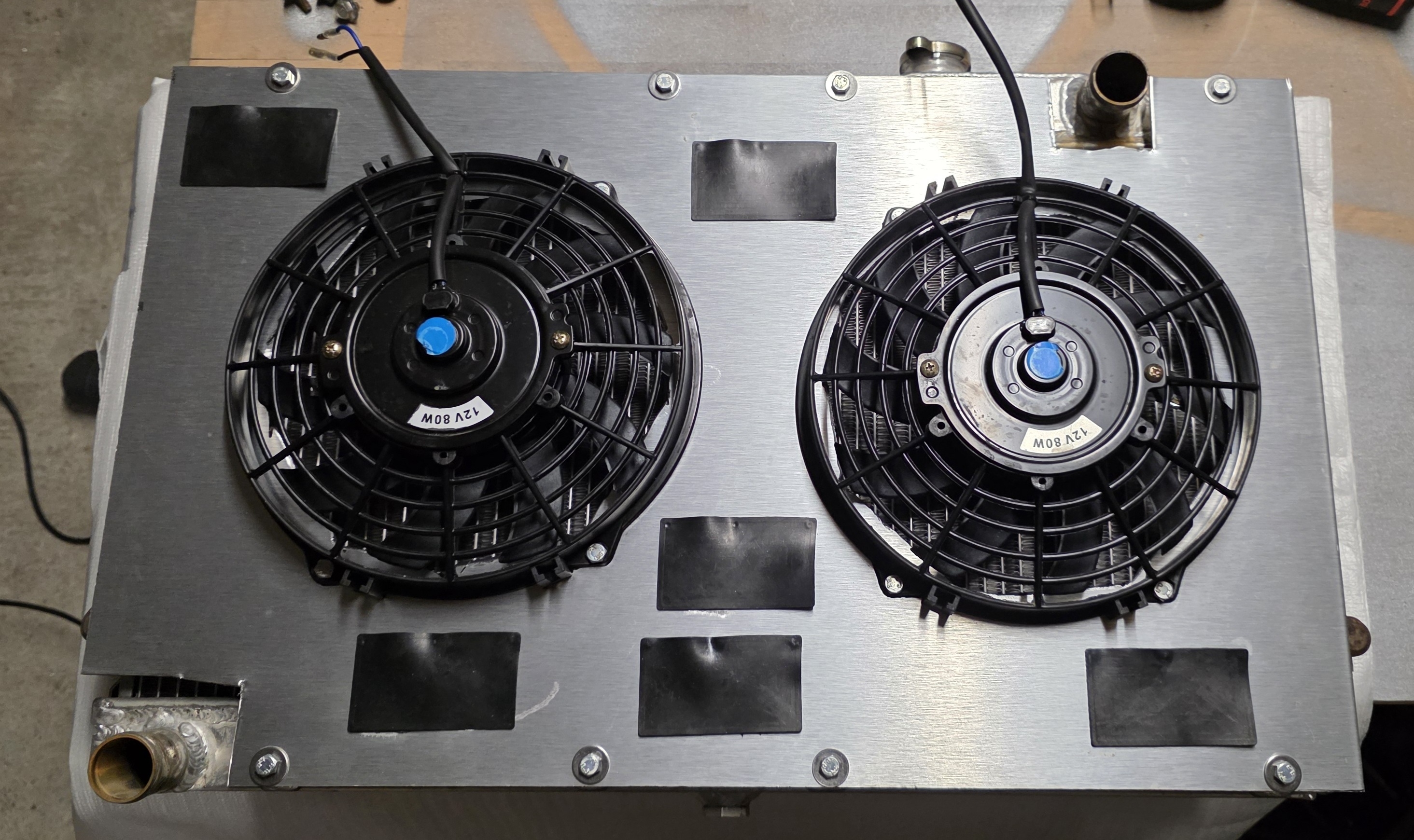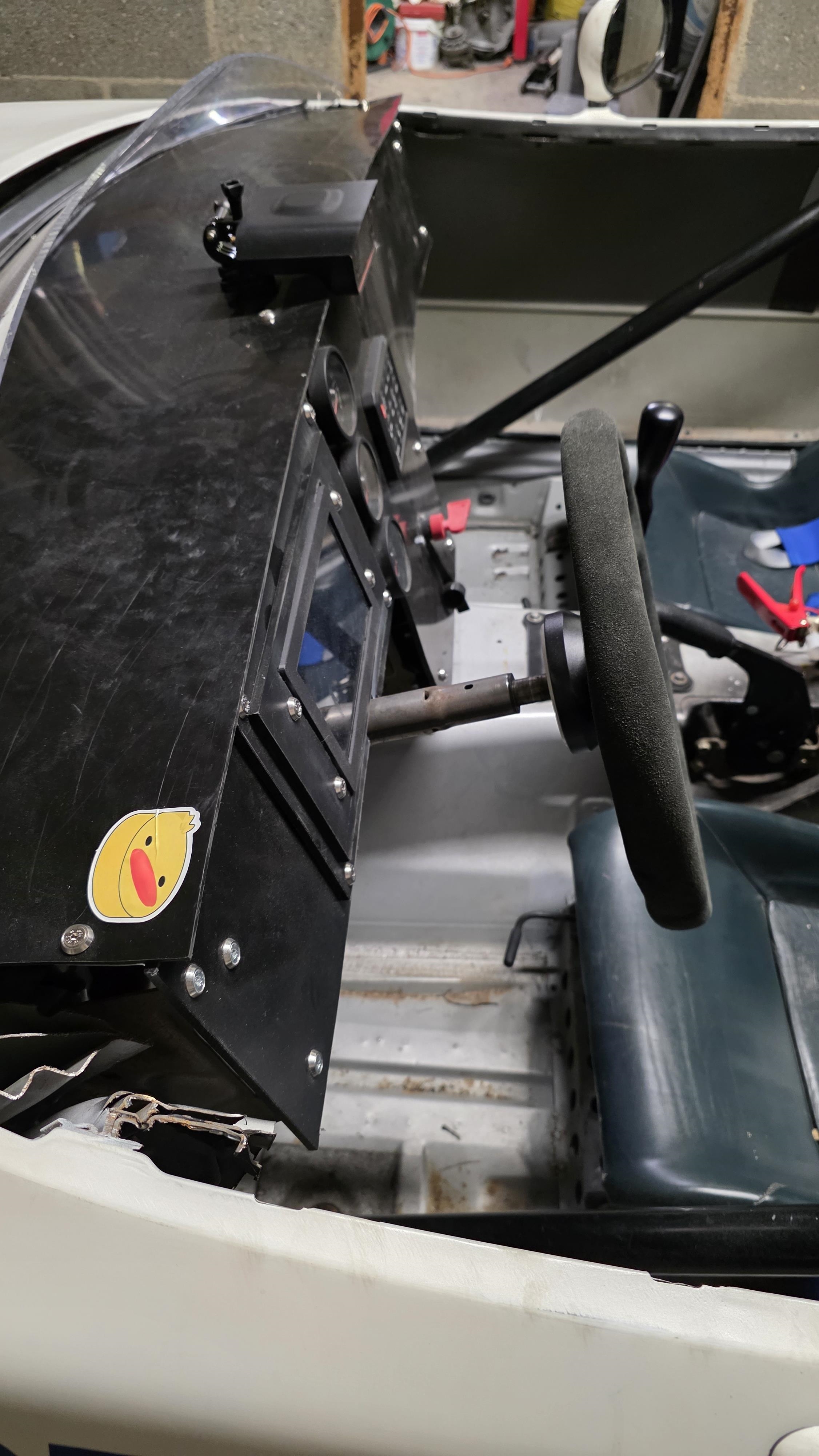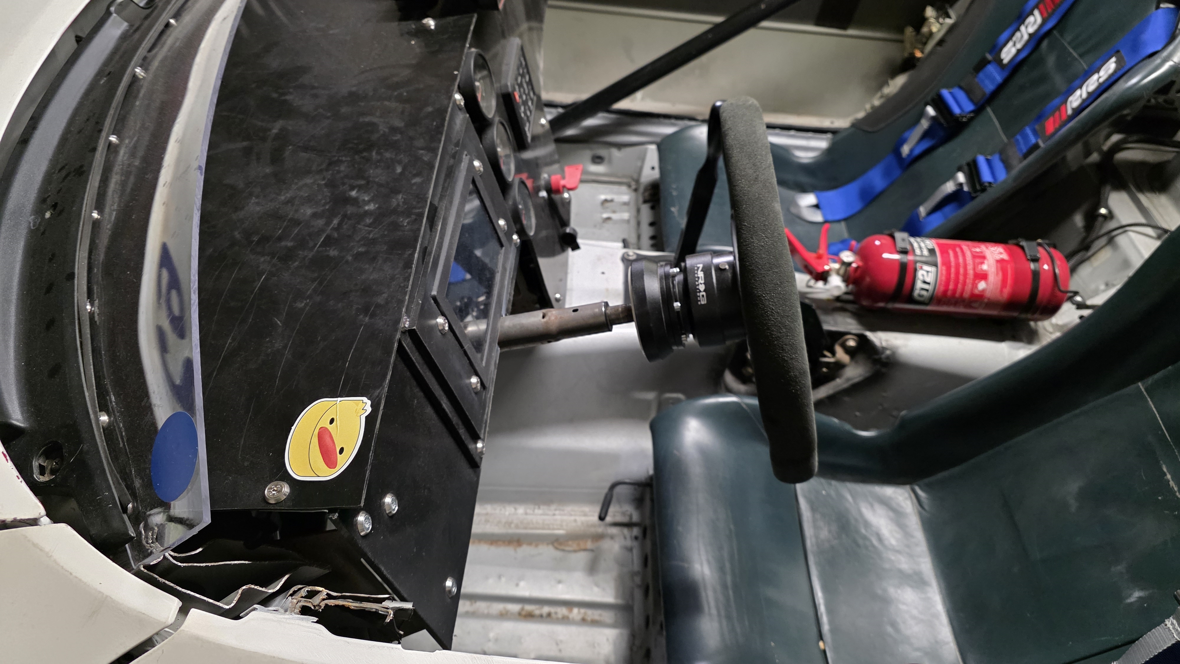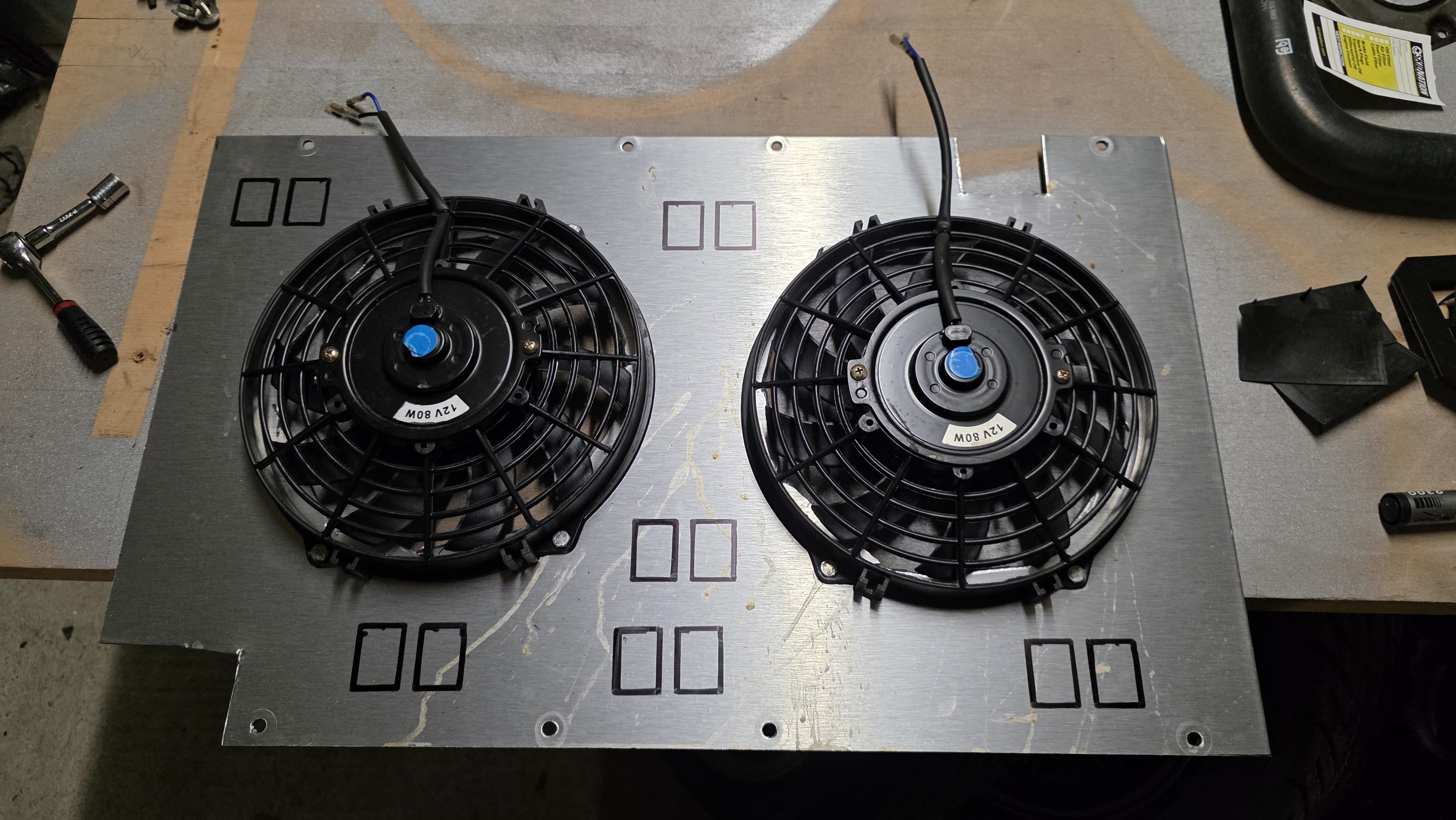 Ce we, j'ai fini le remontage de la barquette, j'ai rebranché tous les capteurs, essayé de bien fixer tous les cables. Il me restait aussi a installer les flaps dynamiques SPAL sur le carter du radiateur, je me suis imprimé en 3D un gabarit de découpe et de perçage, ça me permet de marquer les emplacements.  Puis découpe (ma dremel n'y a pas résisté, elle a fini brulante et fumante, elle ne tourne plus), perçage, et installation des flaps  Je réinstalle le tout, et tente un démarrage. D'abord sans la pompe a essence pour amorcer l'huile et avoir de la pression (çà a mis quelques secondes quand même), puis avec la pompe a essence et.... ça démarre pas. Je me dit direct que j'inversé retour et arrivée d'essence, je le fais tout le temps, sauf que là avec felinkinkin on l'avait marqué avant démontage, jaune pour l'un, blanc pour l'autre. Ben je me suis quand même gouré, sauf que ben pour redémonter, tu as une des deux durites qui est vachement sous pression d'essence (j'ai déjà une fois tout pris dans les yeux, j'ai fait gaffe). Bref, j'ai inversé les durites, et bien sur ça a craqué direct....  Donc j'ai fini de réinstaller parechoc, undertray et les roues pour remettre la voiture au sol. J'en ai profité aussi pour tester un truc, j'ai un quick release de volant, mais au final pour monter et descendre le volant ne me gène pas tant que ça, par contre ça avance pas mal le volant et du coup je suis obligé d'etre un peu reculé sur mon siege. et accessoirement, ça fait un bon 800g/1kg.  Du coup je l'ai viré, ça fait gagner quelques centimètre et je suis plus a l'aise, donc on va rester comme ça pour l'instant.