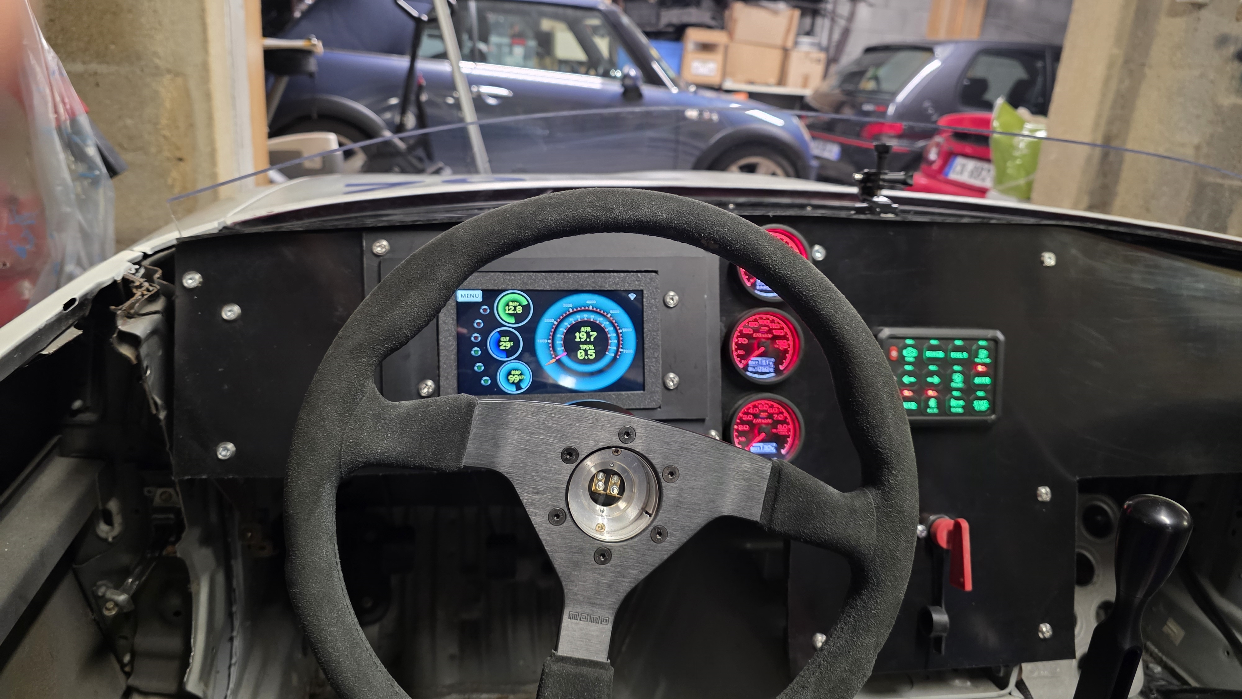 Dashboard reçu, bien évidemment que je me suis empressé de le câbler. C'est super simple, rx/tx/ecu ground d'un côté. Puis le shutdown relay a câbler avec +12 permanent, +12 switched et ground. Un peu de config sur la carte sd et ça démarre directement  Les sondes sont bien récupérées, la valeur du tps est bien lue, je tente un démarrage https://youtu.be/UYMlzd5QKUI?si=e3VW_f_V9Vdix-DIComme on le voit, c'est super réactif et marche parfaitement , par contre je suis encore avec les pages par défaut. Le dashboard est fourni avec un logiciel qui permet de dessiner ses propres pages, mais on peut vraiment faire tout ce qu'on veut https://youtu.be/sWiXDqhCMc8?feature=sharedVa falloir que je me pose un peu sur quoi afficher, et il me reste une installation fixe définitive.